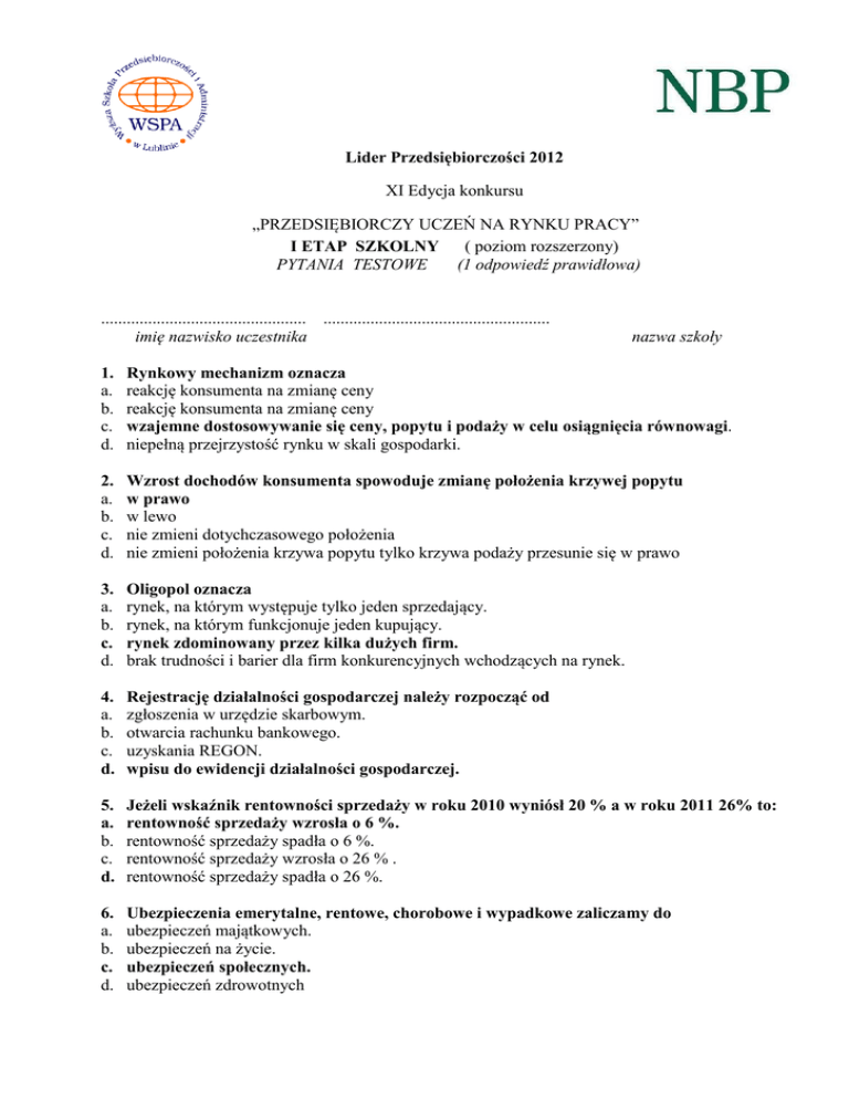 Lider Przedsiębiorczości 2012 XI Edycja konkursu „PRZEDSIĘBIORCZY UCZEŃ NA RYNKU PRACY” I ETAP SZKOLNY ( poziom rozszerzony) PYTANIA TESTOWE (1 odpowiedź prawidłowa) ................................................ ..................................................... imię nazwisko uczestnika nazwa szkoły 1. a. b. c. d. Rynkowy mechanizm oznacza reakcję konsumenta na zmianę ceny reakcję konsumenta na zmianę ceny wzajemne dostosowywanie się ceny, popytu i podaży w celu osiągnięcia równowagi. niepełną przejrzystość rynku w skali gospodarki. 2. a. b. c. d. Wzrost dochodów konsumenta spowoduje zmianę położenia krzywej popytu w prawo w lewo nie zmieni dotychczasowego położenia nie zmieni położenia krzywa popytu tylko krzywa podaży przesunie się w prawo 3. a. b. c. d. Oligopol oznacza rynek, na którym występuje tylko jeden sprzedający. rynek, na którym funkcjonuje jeden kupujący. rynek zdominowany przez kilka dużych firm. brak trudności i barier dla firm konkurencyjnych wchodzących na rynek. 4. a. b. c. d. Rejestrację działalności gospodarczej należy rozpocząć od zgłoszenia w urzędzie skarbowym. otwarcia rachunku bankowego. uzyskania REGON. wpisu do ewidencji działalności gospodarczej. 5. a. b. c. d. Jeżeli wskaźnik rentowności sprzedaży w roku 2010 wyniósł 20 % a w roku 2011 26% to: rentowność sprzedaży wzrosła o 6 %. rentowność sprzedaży spadła o 6 %. rentowność sprzedaży wzrosła o 26 % . rentowność sprzedaży spadła o 26 %. 6. a. b. c. d. Ubezpieczenia emerytalne, rentowe, chorobowe i wypadkowe zaliczamy do ubezpieczeń majątkowych. ubezpieczeń na życie. ubezpieczeń społecznych. ubezpieczeń zdrowotnych 7. a. b. c. d. Faza cyklu koniunkturalnego w której gospodarka osiąga najniższy poziom produkcji to: recesja depresja ożywienie boom 8. W spółce komandytowej za zobowiązania spółki w sposób nieograniczony całym swoim majątkiem odpowiada: a. komandytariusz b. komplementariusz c. awalista d. każdy ze wspólników spółki 9. a. b. c. d. Do pasywnych form walki z bezrobociem nie zalicza się: zasiłków dla bezrobotnych obniżenia wieku emerytalnego skrócenia maksymalnego czasu pracy pomocy w zakładaniu działalności gospodarczej 10. Wysokość przyszłej emerytury zależy od: a. wysokości pensji i długości aktywności zawodowej b. wykonywanego zawodu i płci c. wysokości średniej pensji krajowej i zawodu d. płci i długości aktywności zawodowej 11. Fundusz inwestycyjny, który inwestuje w akcje maksymalnie 40-60% środków a resztę w instrumenty (bony i obligacje), to fundusz: a. zrównoważony b. stabilnego wzrostu c. obligacji d. ustrukturyzowany 12. Do pasywnych form walki z bezrobociem nie zalicza się:: a. zasiłków dla bezrobotnych b. obniżenia wieku emerytalnego c. skrócenia maksymalnego czasu pracy d. pomocy w zakładaniu działalności gospodarczej 13. Koncepcja objaśniająca zachowania człowieka jako reakcje na bodźca płynące z otoczenia nazywana jest koncepcją : a. psychodynamiczną b. poznawczą, c. behawioralną d. koncepcją xyz. 14. Do rejestru przedsiębiorców w ramach Krajowego Rejestru Sądowego nie są wpisywane: a. spółdzielnie b. spółki prawa handlowego c. przedsiębiorstwa państwowe d. izby gospodarcze 15. Którzy spośród wymienionych poniżej pracowników firmy nie są objęci zasadami etyki biznesu: a. dyrektor firmy b. inżynierowie i projektanci c. pracownicy działu sprzedaży i marketingu d. żadna z powyższych odpowiedzi nie jest poprawna-zasadom tym podlegają wszyscy pracownicy 16. Papier wartościowy , który zawiera polecenie wystawcy do zapłacenia określonej kwoty wydane innej osobie na rzecz osoby trzeciej to: a. czek b. obligacja c. akcja d. weksel 17. Które zdanie jest prawdziwe? a. na rynku kapitałowym przedsiębiorstwa pozyskują środki finansowe zaciągając kredyty w bankach b. na rynku kapitałowym przedsiębiorstwa pozyskują środki finansowe emitując akcje i obligacje b. na rynku kapitałowym pieniądze pozyskuje wyłącznie Skarb Państwa sprzedając obligacje c. na rynku kapitałowym banki operują długoterminowe lokaty bankowe 18. Wymiar urlopu wypoczynkowego uzależniony jest od: a. stażu pracy b. stażu pracy i okresu nauki c. uciążliwości pracy d. płci 19. Zaznacz, co powodują działania przedsiębiorcze: a. wprowadzenie na rynku nowych wyrobów b. niechęć do wprowadzania reorganizacji c. zatrzymanie produkcji d. zastój w odkrywaniu nowych technologii 20. Waluta Euro obowiązuje w: a. Wielkiej Brytanii b. Grecji c. Rosji d. Ukrainie