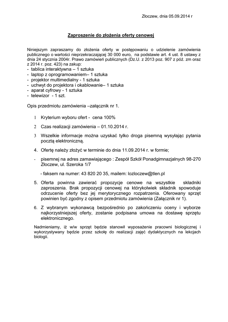 Złoczew, dnia 05.09.2014 r Zaproszenie do złożenia oferty cenowej Niniejszym zapraszamy do złożenia oferty w postępowaniu o udzielenie zamówienia publicznego o wartości nieprzekraczającej 30 000 euro, na podstawie art. 4 ust. 8 ustawy z dnia 24 stycznia 2004r. Prawo zamówień publicznych (Dz.U. z 2013 poz. 907 z póź. zm oraz z 2014 r. poz. 423) na zakup: - tablica interaktywna – 1 sztuka laptop z oprogramowaniem– 1 sztuka projektor multimedialny - 1 sztuka uchwyt do projektora i okablowanie– 1 sztuka aparat cyfrowy - 1 sztuka telewizor - 1 szt. Opis przedmiotu zamówienia –załącznik nr 1. 1 Kryterium wyboru ofert - cena 100% 2 Czas realizacji zamówienia – 01.10.2014 r. 3 Wszelkie informacje można uzyskać tylko droga pisemną wysyłając pytania pocztą elektroniczną. 4. Ofertę należy złożyć w terminie do dnia 11.09.2014 r. w formie; - pisemnej na adres zamawiającego : Zespół Szkół Ponadgimnazjalnych 98-270 Złoczew, ul. Szeroka 1/7 - faksem na numer: 43 820 20 35, mailem: [email protected] 5. Oferta powinna zawierać propozycje cenowe na wszystkie składniki zaproszenia. Brak propozycji cenowej na którykolwiek składnik spowoduje odrzucenie oferty bez jej merytorycznego rozpatrzenia. Oferowany sprzęt powinien być zgodny z opisem przedmiotu zamówienia (Załącznik nr 1). 6. Z wybranym wykonawcą bezpośrednio po zakończeniu oceny i wyborze najkorzystniejszej oferty, zostanie podpisana umowa na dostawę sprzętu elektronicznego. Nadmieniamy, iż w/w sprzęt będzie stanowił wyposażenie pracowni biologicznej i wykorzystywany będzie przez szkołę do realizacji zajęć dydaktycznych na lekcjach biologii.