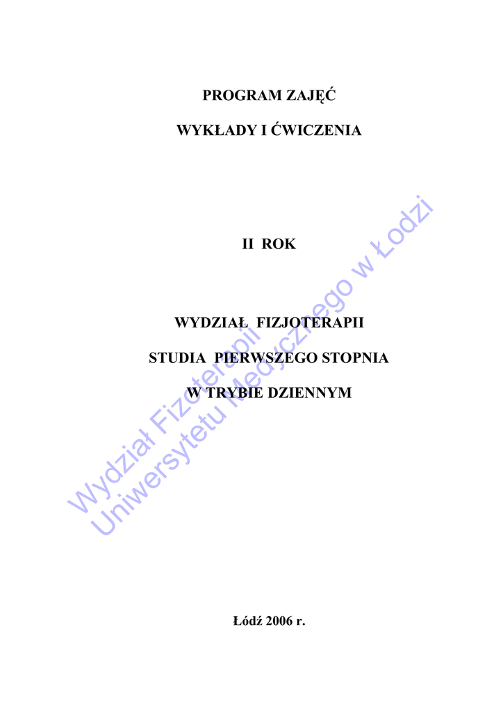 PROGRAM ZAJĘĆ Ło dz i WYKŁADY I ĆWICZENIA eg o w II ROK W U yd ni z w ia er ł F sy iz te ot tu er M ap ed ii yc zn WYDZIAŁ FIZJOTERAPII STUDIA PIERWSZEGO STOPNIA W TRYBIE DZIENNYM Łódź 2006 r. REDAKCJA: prof. dr hab. n. med. Jurek Olszewski dr hab. n. med. Jolanta Kujawa mgr inż. Barbara Zbrzezna W U yd ni z w ia er ł F sy iz te ot tu er M ap ed ii yc zn eg o w Ło dz i mgr Anna Stobiecka Opracowanie programów: prof. dr hab. n. med. Jurek Olszewski dr hab. n. med. Józef Kozak dr hab. n. med. Jolanta Kujawa prof. dr hab. n. med. Krystian Żołyński dr n. human. Piotr Winczewski dr hab. n. med. prof. nadzw. Andrzej Bogucki dr hab. n. med. prof. nadzw. Elżbieta Poziomska-Piątkowska prof. dr hab. n. med. Andrzej Radek prof. dr hab. n. med. Julitta Chojnowska-Jezierska dr hab. n. med. prof. nadzw. Jan Czernicki mgr Kinga Studzińska-Pasieka dr hab. n. med. prof. nadzw. Czesław Jeśman 1 Przedmioty str. Fizjoterapia w otolaryngologii ..............……………....................................................... 3 Kliniczne podstawy fizjoterapii w chirurgii ..................................................................... 11 Fizjoterapia kliniczna w chirurgii ................…………............................................... 19 dz i Kliniczne podstawy fizjoterapii w ortopedii i traumatologii ........................................... 21 Ło Pedagogika ....................................................................................................................... 25 Kliniczne podstawy fizjoterapii w neurologii .....................................................…......... 30 w Metodyka nauczania ruchu .......................…………….................................................... 32 eg o Kliniczne podstawy fizjoterapii w neurochirurgii ........................................................... 45 W U yd ni z w ia er ł F sy iz te ot tu er M ap ed ii yc zn Kliniczne podstawy fizjoterapii w reumatologii .............................................................. 50 Fizjoterapia kliniczna w dysfunkcjach narządu ruchu w reumatologii ............................ 54 Fizjoterapia kliniczna w dysfunkcjach narządu ruchu w ortopedii i traumatologii ......... 57 Fizjoterapia kliniczna w dysfunkcjach narządu ruchu w neurologii i neurochirurgii ...... 62 Kwalifikowana pierwsza pomoc medyczna ..................................................................... 66 Język obcy (2) .................................................................................................................. 71 Fizykoterapia .................................………....................................................................... 72 Socjologia ........................................................................................................................ 77 2 FIZJOTERAPIA W OTOLARYNGOLOGII Rozliczenie godzinowe: Rok studiów II Semestr III łącznie 60 Liczba godzin wykłady ćwiczenia 12 48 seminaria - Forma zaliczenia Egzamin Cele dydaktyczne: W U yd ni z w ia er ł F sy iz te ot tu er M ap ed ii yc zn Treści programowe: eg o w Ło dz i W wyniku realizacji programu nauczania student: stosuje wiadomości o różnych jednostkach chorobowych w otolaryngologii do programowania procesu rehabilitacji, określenia, uwarunkowania jego skuteczności oraz wskazań i przeciwwskazań do stosowania zabiegów fizjoterapeutycznych. Przedstawi podstawowe wiadomości o poszczególnych chorobach z uwzględnieniem mechanizmu i dynamiki zmian, ich odwracalności, mechanizmów kompensacyjnych i powiązań przyczynowo-skutkowych pomiędzy poszczególnymi objawami. Poprowadzi dokumentację kliniczną w stopniu niezbędnym w praktyce fizjoterapeutycznej. Wykłady: (po 2 godz.) Tematy: 1. Urazy w otorynolaryngologii Złamania kości nosa przyczyny, objawy, diagnostyka , leczenie. Krwawienia pourazowe z nosa (złamanie kości nosa i zatok przynosowych, zabiegi w obrębie nosa i zatok przynosowych, stłuczenie nosa, samouszkodzenia, ciała obce). Urazy gardła - mechaniczne – ciało obce w gardle, oparzenia termiczne i chemiczne gardła. Urazy krtani- przyczyny, objawy, postępowanie- metody udrażniające krtań, leczenie farmakologiczne, konikotomia, tracheotomia, intubacja. Uszkodzenia nerwu twarzowego (porażenia wrodzone (zespół Moebiusa, wrodzoną aplasię mięśni), porażenia zapalne o etiologii bakteryjnej (zapalenia ucha środkowego, zarówno ostre jak i przewlekłe, zapalenia ucha zewnętrznego, zapalenie opon mózgowo rdzeniowych), przyczyny wirusowe (półpasiec uszny, mononukleoza zakaźna, poliomyelitis, zespół Guillian-Barre), w przebiegu nowotworów (guzy nerwu twarzowego i ślinianki przyusznej, okolicy kąta mostowo-móżdżkowego i mostu, ucha środkowego, guzy śródpiersia), urazy nerwu twarzowego (jatrogenne np. w przebiegu operacji usznych i ślinianki przyusznej, złamania kości skroniowej, urazy szyi), przyczyny neurologiczne (stwardnienie rozsiane, stwardnienie zanikowe boczne, tętniaki tylnej jamy czaszki, neuropatie metaboliczne). Objawy, diagnostyka ( topodiagnostyka uszkodzeń n. twarzowego) postępowanie. Urazy ucha (małżowiny usznej-krwiak małżowiny usznej, przewodu słuchowego zewnętrznego, jamy bębenkowej, złamania kości skroniowej, uraz akustyczny). 3 2. Metody badania narządu głosu. Choroby zawodowe. Profilaktyka, rehabilitacja Stroboskopia, wideostroboskopia, elektromiografia, laryngomikrostroboskopia, telemikrostroboskopia, laryngofiberoskopia.Przewlekłe przerostowe zapalenie krtani: hipertrofia, hiperplazja, metaplazja, dyskeratoza, parakeratoza, akantoza, zgrubienie kontaktowe, guzki głosowe, polipowaty przerost fałdu głosowego, torbiele, przerost kontaktowy, ziarnina krtaniowa, przewlekłe zapalenie krtani z odczynem hiperplastycznym nabłonka, leukoplakia, modzelowatość krtani, brodawczaki krtań, zaburzenia czynnościowe krtani. w Ło dz i Rehabilitacja chorych po laryngektomii: wytworzenie głosu i mo