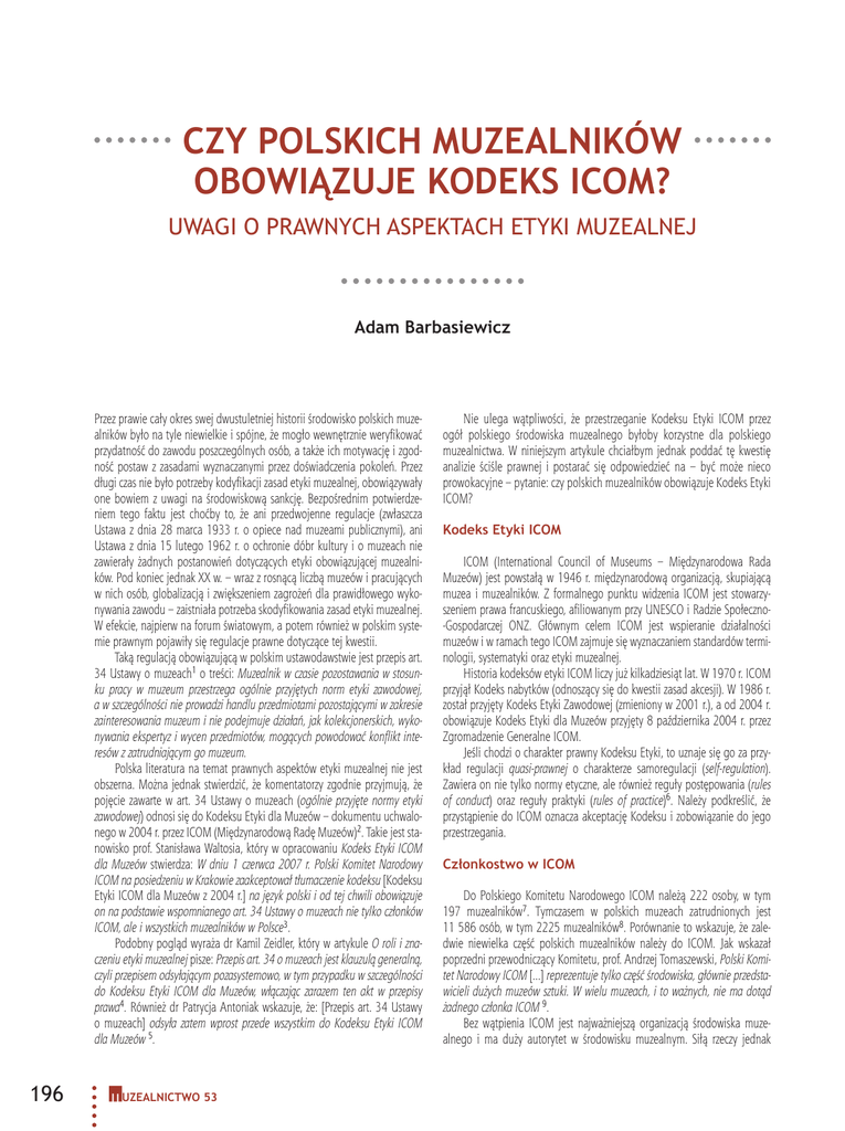 CZY POLSKICH MUZEALNIKÓW OBOWIĄZUJE KODEKS ICOM? UWAGI O PRAWNYCH ASPEKTACH ETYKI MUZEALNEJ Adam Barbasiewicz Przez prawie cały okres swej dwustuletniej historii środowisko polskich muzealników było na tyle niewielkie i spójne, że mogło wewnętrznie weryfikować przydatność do zawodu poszczególnych osób, a także ich motywację i zgodność postaw z zasadami wyznaczanymi przez doświadczenia pokoleń. Przez długi czas nie było potrzeby kodyfikacji zasad etyki muzealnej, obowiązywały one bowiem z uwagi na środowiskową sankcję. Bezpośrednim potwierdzeniem tego faktu jest choćby to, że ani przedwojenne regulacje (zwłaszcza Ustawa z dnia 28 marca 1933 r. o opiece nad muzeami publicznymi), ani Ustawa z dnia 15 lutego 1962 r. o ochronie dóbr kultury i o muzeach nie zawierały żadnych postanowień dotyczących etyki obowiązującej muzealników. Pod koniec jednak XX w. – wraz z rosnącą liczbą muzeów i pracujących w nich osób, globalizacją i zwiększeniem zagrożeń dla prawidłowego wykonywania zawodu – zaistniała potrzeba skodyfikowania zasad etyki muzealnej. W efekcie, najpierw na forum światowym, a potem również w polskim systemie prawnym pojawiły się regulacje prawne dotyczące tej kwestii. Taką regulacją obowiązującą w polskim ustawodawstwie jest przepis art. 34 Ustawy o muzeach1 o treści: Muzealnik w czasie pozostawania w stosunku pracy w muzeum przestrzega ogólnie przyjętych norm etyki zawodowej, a w szczególności nie prowadzi handlu przedmiotami pozostającymi w zakresie zainteresowania muzeum i nie podejmuje działań, jak kolekcjonerskich, wykonywania ekspertyz i wycen przedmiotów, mogących powodować konflikt interesów z zatrudniającym go muzeum. Polska literatura na temat prawnych aspektów etyki muzealnej nie jest obszerna. Można jednak stwierdzić, że komentatorzy zgodnie przyjmują, że pojęcie zawarte w art. 34 Ustawy o muzeach (ogólnie przyjęte normy etyki zawodowej) odnosi się do Kodeksu Etyki dla Muzeów – dokumentu uchwalonego w 2004 r. przez ICOM (Międzynarodową Radę Muzeów)2. Takie jest stanowisko prof. Stanisława Waltosia, który w opracowaniu Kodeks Etyki ICOM dla Muzeów stwierdza: W dniu 1 czerwca 2007 r. Polski Komitet Narodowy ICOM na posiedzeniu w Krakowie zaakceptował tłumaczenie kodeksu [Kodeksu Etyki ICOM dla Muzeów z 2004 r.] na język polski i od tej chwili obowiązuje on na podstawie wspomnianego art. 34 Ustawy o muzeach nie tylko członków ICOM, ale i wszystkich muzealników w Polsce3. Podobny pogląd wyraża dr Kamil Zeidler, który w artykule O roli i znaczeniu etyki muzealnej pisze: Przepis art. 34 o muzeach jest klauzulą generalną, czyli przepisem odsyłającym pozasystemowo, w tym przypadku w szczególności do Kodeksu Etyki ICOM dla Muzeów, włączając zarazem ten akt w przepisy prawa4. Również dr Patrycja Antoniak wskazuje, że: [Przepis art. 34 Ustawy o muzeach] odsyła zatem wprost przede wszystkim do Kodeksu Etyki ICOM dla Muzeów 5. 196 UZEALNICTWO 53 Nie ulega wątpliwości, że przestrzeganie Kodeksu Etyki ICOM przez ogół polskiego środowiska muzealnego byłoby korzystne dla polskiego muzealnictwa. W niniejszym artykule chciałbym jednak poddać tę kwestię analizie ściśle prawnej i postarać się odpowiedzieć na – być może nieco prowokacyjne – pytanie: czy polskich muzealników obowiązuje Kodeks Etyki ICOM? Kodeks Etyki ICOM ICOM (International Council of Museums – Międzynarodowa Rada Muzeów) jest powstałą w 1946 r. międzynarodową organizacją, skupiającą muzea i muzealników. Z formalnego punktu widzenia ICOM jest stowarzyszeniem prawa francuskiego, afiliowanym przy UNESCO i Radzie Społeczno-Gospodarczej ONZ. Głównym celem ICOM jest wspieranie działalności muzeów i w ramach tego ICOM zajmuje się wyznaczaniem standardów terminologii, systematyki oraz etyki muzealnej. Historia kodeksów etyki ICOM liczy już kilkadziesiąt lat. W 1970 r. ICOM przyjął Kodeks nabytków (odnoszący się do kwestii zasad akcesji). W 1986 r. został przyjęty Kodeks Etyki Zawodowej (zmieniony w 2001 r.), a od 2004 r. obowiązuje Kodeks Etyki dla Muzeów przyjęty 8 października 2004 r. przez Zgromadzenie Generalne ICOM. Jeśli chodzi o charakter prawny Kodeksu Etyki, to uznaje się go za przykład regulacji quasi-prawnej o charakterze samoregulacji (self-regulation). Zawiera on nie tylko normy etyczne, ale również reguły postępowania (rules of conduct) oraz reguły praktyki (rules of practice)6. Należy podkreślić, że przystąpienie do ICOM oznacza akceptację Kodeksu i zobowiązanie do jego przestrzegania. Członkostwo w ICOM Do Polskiego Komitetu Narodowego ICOM należą 222 osoby, w tym 197 muzealników7. Tymczasem w polskich muzeach zatrudnionych jest 11 586 osób, w tym 2225 muzealników8. Porównanie to wskazuje, że zaledwie niewielka część polskich muzealników należy do ICOM. Jak wskazał poprzedni przewodniczący Komitetu, prof. Andrzej Tomaszewski, Polski Komitet Narodowy ICOM […] reprezentuje tylko część środowiska, głównie przedstawicieli dużych muzeów sztuki. W wielu muzeach, i to ważnych, nie ma dotąd żadnego członka ICOM 9. Bez wątpienia ICOM jest najważniejszą organizacją środowiska muzealnego i ma duży autorytet w środowisku muzealnym. Siłą rzeczy jednak prawo w muzeach działania ICOM, w tym te związane z etyką zawodową, są kierowane przede wszystkim do członków tej organizacji. Recepcja Kodeksu W tym kontekście trzeba postawić pytanie czy Kodeks Etyki jest znany polskim muzealnikom? Wiadomo, że w 1993 r. Ministerstwo Kultury i Sztuki wysłało tekst ówczesnego Kodeksu Etyki ICOM wszystkim znanym sobie muzeom10. Pomijając już, że ta swoista promulgacja dotyczyła poprzedniego Kodeksu (a więc Kodeksu Etyki Zawodowej z 1986 r.), to objęła ona tylko ówczesne muzea znane ministerstwu, a więc raczej nie wszystkie (w ówczesnym stanie prawnym brak było istniejącego obecnie wykazu muzeów p