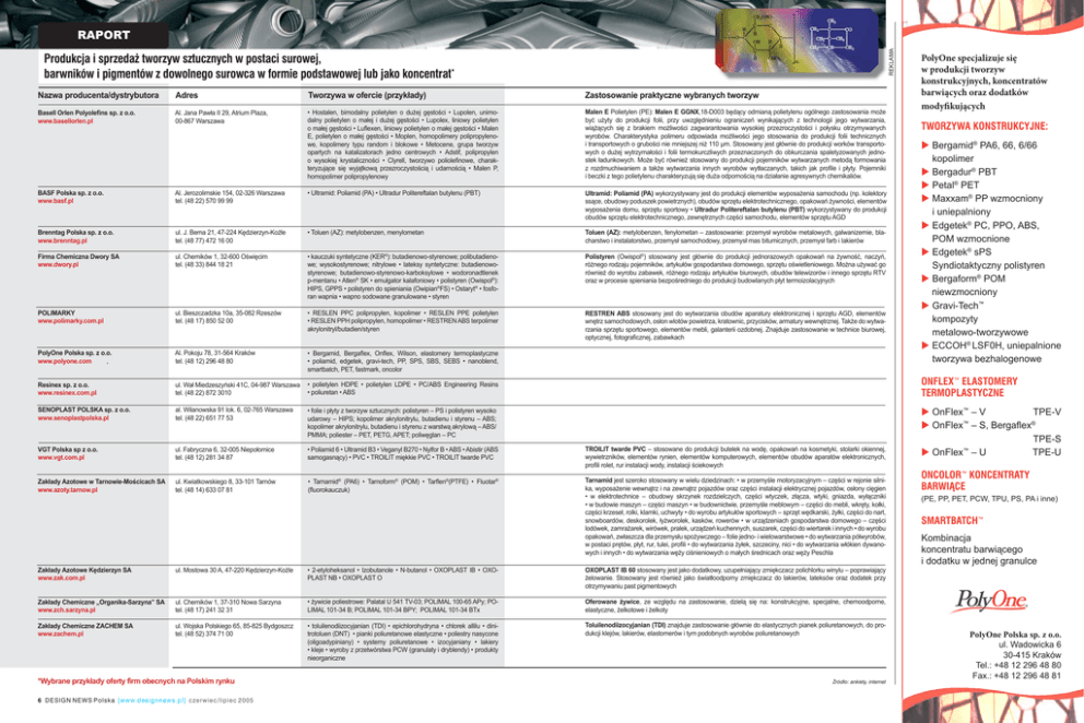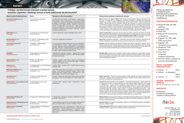 REKLAMA RAPORT Produkcja i sprzedaż tworzyw sztucznych w postaci surowej, barwników i pigmentów z dowolnego surowca w formie podstawowej lub jako koncentrat* Nazwa producenta/dystrybutora Adres Tworzywa w ofercie (przykłady) Zastosowanie praktyczne wybranych tworzyw Basell Orlen Polyolefins sp. z o.o. www.basellorlen.pl Al. Jana Pawła II 29, Atrium Plaza, 00-867 Warszawa • Hostalen, bimodalny polietylen o dużej gęstości • Lupolen, unimodalny polietylen o małej i dużej gęstości • Lupolex, liniowy polietylen o małej gęstości • Luflexen, liniowy polietylen o małej gęstości • Malen E, polietylen o małej gęstości • Moplen, homopolimery polipropylenowe, kopolimery typu random i blokowe • Metocene, grupa tworzyw opartych na katalizatorach jedno centrowych • Adstif, polipropylen o wysokiej krystaliczności • Clyrell, tworzywo poliolefinowe, charakteryzujące się wyjątkową przezroczystością i udarnością • Malen P, homopolimer polipropylenowy Malen E Polietylen (PE): Malen E GGNX,18-D003 będący odmianą polietylenu ogólnego zastosowania może być użyty do produkcji folii, przy uwzględnieniu ograniczeń wynikających z technologii jego wytwarzania, wiążących się z brakiem możliwości zagwarantowania wysokiej przezroczystości i połysku otrzymywanych wyrobów. Charakterystyka polimeru odpowiada możliwości jego stosowania do produkcji folii technicznych i transportowych o grubości nie mniejszej niż 110 µm. Stosowany jest głównie do produkcji worków transportowych o dużej wytrzymałości i folii termokurczliwych przeznaczonych do obkurczania spaletyzowanych jednostek ładunkowych. Może być również stosowany do produkcji pojemników wytwarzanych metodą formowania z rozdmuchiwaniem a także wytwarzania innych wyrobów wytłaczanych, takich jak profile i płyty. Pojemniki i beczki z tego polietylenu charakteryzują się duża odpornością na działanie agresywnych chemikaliów. BASF Polska sp. z o.o. www.basf.pl Al. Jerozolimskie 154, 02-326 Warszawa tel. (48 22) 570 99 99 • Ultramid: Poliamid (PA) • Ultradur Politereftalan butylenu (PBT) Ultramid: Poliamid (PA) wykorzystywany jest do produkcji elementów wyposażenia samochodu (np. kolektory ssące, obudowy poduszek powietrznych), obudów sprzętu elektrotechnicznego, opakowań żywności, elementów wyposażenia domu, sprzętu sportowy • Ultradur Politereftalan butylenu (PBT) wykorzystywany do produkcji obudów sprzętu elektrotechnicznego, zewnętrznych części samochodu, elementów sprzętu AGD Brenntag Polska sp. z o.o. www.brenntag.pl ul. J. Bema 21, 47-224 Kędzierzyn-Koźle tel. (48 77) 472 16 00 • Toluen (AZ): metylobenzen, menylometan Toluen (AZ): metylobenzen, fenylometan – zastosowanie: przemysł wyrobów metalowych, galwanizernie, blacharstwo i instalatorstwo, przemysł samochodowy, przemysł mas bitumicznych, przemysł farb i lakierów Firma Chemiczna Dwory SA www.dwory.pl ul. Chemików 1, 32-600 Oświęcim tel. (48 33) 844 18 21 • kauczuki syntetyczne (KER®): butadienowo-styrenowe; polibutadienowe; wysokostyrenowe; nitrylowe • lateksy syntetyczne: butadienowostyrenowe; butadienowo-styrenowo-karboksylowe • wodoronadtlenek p-mentanu • Atlen® SK • emulgator kalafoniowy • polistyren (Owispol®): HIPS, GPPS • polistyren do spieniania (Owipian®FS) • Ostaryt® • fosforan wapnia • wapno sodowane granulowane • styren Polistyren (Owispol®) stosowany jest głównie do produkcji jednorazowych opakowań na żywność, naczyń, różnego rodzaju pojemników, artykułów gospodarstwa domowego, sprzętu oświetleniowego. Można używać go również do wyrobu zabawek, różnego rodzaju artykułów biurowych, obudów telewizorów i innego sprzętu RTV oraz w procesie spieniania bezpośredniego do produkcji budowlanych płyt termoizolacyjnych POLIMARKY www.polimarky.com.pl ul. Bieszczadzka 10a, 35-082 Rzeszów tel. (48 17) 850 52 00 • RESLEN PPC polipropylen, kopolimer • RESLEN PPE polietylen • RESLEN PPH polipropylen, homopolimer • RESTREN ABS terpolimer akrylonitryl/butadien/styren RESTREN ABS stosowany jest do wytwarzania obudów aparatury elektronicznej i sprzętu AGD, elementów wnętrz samochodowych, osłon wlotów powietrza, kratownic, przycisków, armatury wewnętrznej. Także do wytwarzania sprzętu sportowego, elementów mebli, galanterii ozdobnej. Znajduje zastosowanie w technice biurowej, optycznej, fotograficznej, zabawkach PolyOne Polska sp. z o.o. www.polyone.com , Al. Pokoju 78, 31-564 Kraków tel. (48 12) 296 48 80 • Bergamid, Bergaflex, Onflex, Wilson, elastomery termoplastyczne • poliamid, edgetek, gravi-tech, PP, SPS, SBS, SEBS • nanoblend, smartbatch, PET, fastmark, oncolor Resinex sp. z o.o. www.resinex.com.pl ul. Wał Miedzeszyński 41C, 04-987 Warszawa tel. (48 22) 872 3010 • polietylen HDPE • polietylen LDPE • PC/ABS Engineering Resins • poliuretan • ABS SENOPLAST POLSKA sp. z o.o. www.senoplastpolska.pl al. Wilanowska 91 lok. 6, 02-765 Warszawa tel. (48 22) 651 77 53 • folie i płyty z tworzyw sztucznych: polistyren – PS i polistyren wysoko udarowy – HIPS; kopolimer akrylonitrylu, butadienu i styrenu – ABS; kopolimer akrylonitrylu, butadienu i styrenu z warstwą akrylową – ABS/ PMMA; poliester – PET, PETG, APET; poliwęglan – PC VGT Polska sp z o.o. www.vgt.com.pl ul. Fabryczna 6, 32-005 Niepołomice tel. (48 12) 281 34 87 • Poliamid 6 • Ultramid B3 • Veganyl B270 • Nylfor B • ABS • Abistir (ABS samogasnący) • PVC • TROILIT miękkie PVC • TROILIT twarde PVC TROILIT twarde PVC – stosowane do produkcji butelek na wodę, opakowań na kosmetyki, stolarki okiennej, wywietrzników, elementów rynien, elementów komputerowych, elementów obudów aparatów elektronicznych, profili rolet, rur instalacji wody, instalacji ściekowych Zakłady Azotowe w Tarnowie-Mościcach SA www.azoty.tarnow.pl ul. Kwiatkowskiego 8, 33-101 Tarnów tel. (48 14) 633 07 81 • Tarnamid® (PA6)