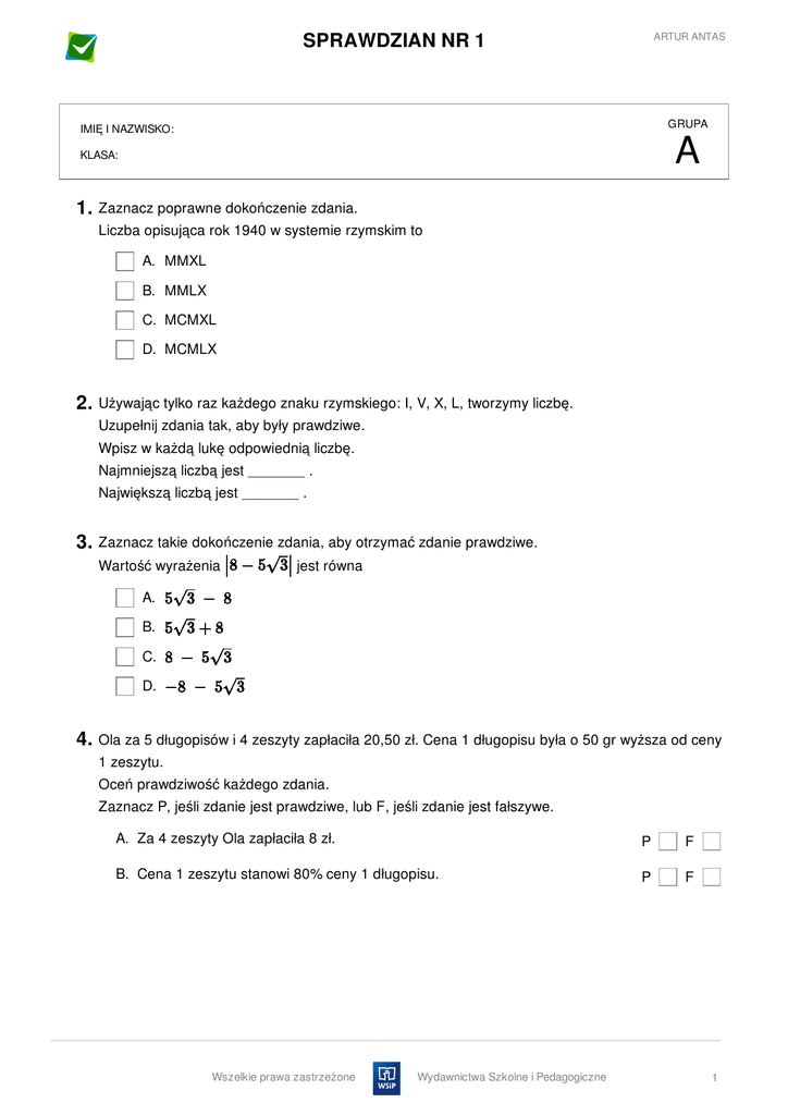 SPRAWDZIAN NR 1 ARTUR ANTAS GRUPA IMIĘ I NAZWISKO: A KLASA: 1. Zaznacz poprawne dokończenie zdania. Liczba opisująca rok 1940 w systemie rzymskim to A. MMXL B. MMLX C. MCMXL D. MCMLX 2. Używając tylko raz każdego znaku rzymskiego: I, V, X, L, tworzymy liczbę. Uzupełnij zdania tak, aby były prawdziwe. Wpisz w każdą lukę odpowiednią liczbę. Najmniejszą liczbą jest ________ . Największą liczbą jest ________ . 3. Zaznacz takie dokończenie zdania, aby otrzymać zdanie prawdziwe. Wartość wyrażenia jest równa A. B. C. D. 4. Ola za 5 długopisów i 4 zeszyty zapłaciła 20,50 zł. Cena 1 długopisu była o 50 gr wyższa od ceny 1 zeszytu. Oceń prawdziwość każdego zdania. Zaznacz P, jeśli zdanie jest prawdziwe, lub F, jeśli zdanie jest fałszywe. A. Za 4 zeszyty Ola zapłaciła 8 zł. P F B. Cena 1 zeszytu stanowi 80% ceny 1 długopisu. P F Wszelkie prawa zastrzeżone Wydawnictwa Szkolne i Pedagogiczne 1 5. Cena kolektora płaskiego w pewnej firmie jest równa 350 €. Ile złotych kosztuje 8 kolektorów płaskich? 1 € = 4,35 zł Zapisz rozwiązanie. 6. Zaznacz poprawne dokończenie zdania. Idąc do szkoły, Antek mija cukiernię. Odległość cukierni od jego domu jest równa odległości domu od szkoły. Odległość tej cukierni od domu Antka stanowi A. 0,3 odległości szkoły od jego domu. B. 0,375 odległości szkoły od jego domu. C. 0,38 odległości szkoły od jego domu. D. 0,8 odległości szkoły od jego domu. 7. Zaznacz poprawne dokończenie zdania. Kasia napisała charakterystykę koleżanki, używając 100 wyrazów, wśród których jest 19 wyrazów czteroliterowych. Wyrazy czteroliterowe użyte w opisie stanowią A. 0,0019 wszystkich wyrazów tego opisu. B. 0,019 wszystkich wyrazów tego opisu. C. 0,19 wszystkich wyrazów tego opisu. D. 1,9 wszystkich wyrazów tego opisu. 8. Uzupełnij zdanie tak, aby było prawdziwe. Wpisz w każdą lukę odpowiednią liczbę. Liczba 14,645 zaokrąglona do jedności jest równa ____, a liczba 34,261 zaokrąglona do części setnych jest równa ____. Wszelkie prawa zastrzeżone Wydawnictwa Szkolne i Pedagogiczne 2 9. Zosia, Kasia i Małgosia obliczyły średnią swoich ocen, a następnie otrzymaną liczbę zaokrągliły do części setnych. Wyniki zapisały w tabeli. Zosia Kasia Małgosia Średnia ocen 5,003 4,8917 4,7905 Zaokrąglenie do części setnych 5,00 4,89 4,80 Zaznacz poprawne dokończenie zdania. Poprawne zaokrąglenie średniej swoich ocen zapisały A. wszystkie trzy dziewczynki. B. tylko Zosia i Kasia. C. tylko Zosia i Małgosia. D. tylko Małgosia i Kasia. 10. Oceń prawdziwość każdego zdania. Zaznacz P, jeśli zdanie jest prawdziwe, lub F, jeśli jest fałszywe. A. Liczba 4,588 zaokrąglona do drugiego miejsca po przecinku jest równa 4,6. P F B. Liczba 0,984 zaokrąglona do części dziesiętnych jest równa 1. F 11. P Oferta klubu fitness FORMA 1 godzina zajęć: 17 zł Karnet miesięczny: stała opłata 25 zł + 12 zł za każdą godzinę uczestnictwa w zajęciach Magda wzięła udział w 4 godzinach zajęć, ale nie zdecydowała się na zakup karnetu. Ile zapłaciła za udział we wszystkich zajęciach? Zapisz rozwiązanie. Wszelkie prawa zastrzeżone Wydawnictwa Szkolne i Pedagogiczne 3 12. Zaznacz poprawną odpowiedź. W latach 1992–2011 na terenie Ojcowskiego Parku Narodowego zinwentaryzowano 737 jaskiń. Które wyrażenie opisuje, ile jaskiń inwentaryzowano średnio w ciągu roku? A. 737 : (2011 – 1992) B. 737 · (2011 – 1992) C. 737 : (2011 – 1992 + 1) D. 737 · (2011 – 1992 + 1) 13. Oferta klubu fitness FORMA 1 godzina zajęć: 17 zł Karnet miesięczny: stała opłata 25 zł + 12 zł za każdą godzinę uczestnictwa w zajęciach Ile kosztowałoby Magdę uczestnictwo w 4 godzinach zajęć, gdyby kupiła karnet? Zapisz rozwiązanie. 14. Oszacuj wartość każdego wyrażenia. Zaznacz poprawne dokończenie zdania. Największą wartość ma wyrażenie A. B. C. D. Wszelkie prawa zastrzeżone Wydawnictwa Szkolne i Pedagogiczne 4 15. Basia ma 200 zł oszczędności. Postanowiła przeznaczyć te pieniądze na bilety wstępu na basen. Bilet uprawniający do godzinnego korzystania z basenu kosztuje 14 zł. Istnieje również możliwość zakupienia karnetu za kwotę 56 zł, który uprawnia do przebywania na basenie 5 razy po jednej godzinie. Przez ile najwięcej godzin może za swoje oszczędności przebywać na tym basenie Basia? Zapisz obliczenia i sformułuj odpowiedź. 16. Zaznacz poprawne dokończenie zdania. Pani Ola kupiła na firanki 8 m materiału po 25,20 zł za metr. Za materiał zapłaciła A. mniej niż 200 zł. B. więcej niż 200 zł, ale mniej niż 210 zł. C. więcej niż 210 zł, ale mniej niż 250 zł. D. więcej niż 250 zł. 17. Pan Tomek chce zainwestować 4000 zł. – Gdy założy lokatę A, za każde zainwestowane 500 zł zyska po roku 60 zł. – Gdy założy lokatę B, za każde zainwestowane 800 zł zyska po roku 90 zł. – Gdy założy lokatę C, za każde zainwestowane 400 zł zyska po roku 50 zł. Zaznacz poprawną odpowiedź. Które zdanie jest prawdziwe? A. Najkorzystniejsze jest założenie lokaty B. B. Korzystniejsze jest założenie lokaty A niż lokaty B. C. Korzystniejsze jest założenie lokaty A niż lokaty C. D. Korzystniejsze jest założenie lokaty B niż lokaty C. 18. W 2008 r. najwięcej czasu przed telewizorami Polacy spędzali w wakacyjne niedziele – średnio 3 godz. 37 min. Z kolei najmniej czasu przed telewizorami Polacy spędzali w wakacyjne piątki – średnio 2 godz. 39 min. Uzupełnij zdanie. Wpisz w lukę odpowiednią liczbę. W wakacyjne niedziele statystyczny Polak spędzał przed telewizorem o ____ minut więcej czasu niż w wakacyjne piątki. Wszelkie prawa zastrzeżone Wydawnictwa Szkolne i Pedagogiczne 5 19. Poznań liczy ok. 550 tys. mieszkańców, czyli blisko 100 tys. mieszkańców więcej niż Gdańsk. W Gdańsku mieszka o prawie 50 tys. mieszkańców więcej niż w Szczecinie. Liczba ludności Torunia to zaledwie połowa