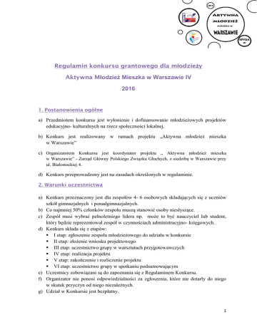 Regulamin konkursu grantowego dla młodzieży Aktywna Młodzież Mieszka w Warszawie IV 2016 1. Postanowienia ogólne a) Przedmiotem konkursu jest wyłonienie i dofinansowanie młodzieżowych projektów edukacyjno- kulturalnych na rzecz społeczności lokalnej. b) Konkurs jest realizowany w ramach projektu „Aktywna młodzież mieszka w Warszawie” c) Organizatorem Konkursu jest koordynator projektu „ Aktywna młodzież mieszka w Warszawie” - Zarząd Główny Polskiego Związku Głuchych, z siedzibą w Warszawie przy ul. Białostockiej 4. d) Konkurs przeprowadzony jest na zasadach określonych w regulaminie. 2. Warunki uczestnictwa a) Konkurs przeznaczony jest dla zespołów 4- 6 osobowych składających się z uczniów szkół gimnazjalnych i ponadgimnazjalnych. b) Co najmniej 50% członków zespołu muszą stanowić osoby niesłyszące. c) Zespół musi wybrać pełnoletniego lidera np. może to być nauczyciel lub student, który będzie reprezentował zespół w czynnościach administracyjno- księgowych. d) Konkurs składa się z etapów: I etap: zgłoszenie zespołu młodzieżowego do udziału w konkursie II etap: złożenie wniosku projektowego III etap: uczestnictwo grupy w warsztatach przygotowawczych IV etap: realizacja projektu V etap: zakończenie i rozliczenie projektu VI etap: uczestnictwo grupy w spotkaniu podsumowującym e) Uczestnicy zobowiązani są do zapoznania się z Regulaminem Konkursu. f) Organizator nie ponosi odpowiedzialności za zgłoszenia, które nie dotarły do niego w skutek przyczyn od niego niezależnych. g) Udział w Konkursie jest bezpłatny. 1 3. Zasady Konkursu a) Projekty konkursowe powinny dotyczyć jednego z poniższych tematów: 1. Aktywna Młodzież działa dla innych, 2. Dlaczego warto znać język Polski?, 3. Kreatywne pomysły zawsze w Warszawie, 4. Warszawa inspiruje do działania. b) Projekt musi odnosić się do przestrzeni Warszawy. c) Do Konkursu mogą być zgłaszane tylko projekty wykonane samodzielnie przez młodzież. d) Działania projektowe będą realizowane nie dłużej niż 4 miesiące w okresie od 01 marca do 30 czerwca 2016. e) Projekt musi odbywać się w mieście stołecznym Warszawa. f) Grupa ma prawo wycofać swój projekt wyłącznie przed podpisaniem umowy. g) Wybrane projekty będą samodzielnie realizowane przez młodzież. 4. Zgłoszenia do Konkursu a) Warunkiem zgłoszenia zespołu do udziału w Konkursie jest dostarczenie wypełnionego i podpisanego formularza zgłoszeniowego oraz wypełnionego i podpisanego wniosku projektowego w zaklejonej kopercie do dnia 16 lutego 2016 roku do godz. 15:00 na adres: Polski Związek Głuchych Zarząd Główny, ul Białostocka 4, 03-741 Warszawa z dopiskiem „Aktywna młodzież 2015” (decyduje data wpłynięcia wniosku) a) Organizator zastrzega sobie prawo odrzucić projekt zgłoszony do konkursu po wskazanym terminie. b) Organizator konkursu nie ponosi odpowiedzialności za ewentualne zaginięcie lub uszkodzenie projektu powstałe w czasie przesyłki. 5. Wymogi formalne i kryteria oceny a) Kryteria oceny: zgodność z obszarami tematycznymi podanymi w punkcie 3a, poprawność merytoryczna, aktywność- zaangażowanie uczestników do działania, realność ekonomiczna projektowanego działania, adekwatność do kontekstu lokalnego. 2 5. Komisja Konkursowa a) Wnioski projektowe ocenia 3 - osobowa Komisja Konkursowa, w składzie powołanym przez Organizatora. b) Komisja będzie czuwać nad prawidłowym przebiegiem konkursu oraz przyzna dofinansowanie do wybranych projektów. c) Komisja Konkursowa zastrzega sobie prawo do innego rozdzielenia wysokości dofinansowania do projektów w tym zmniejszania wysokości przyznanego dofinansowania w stosunku do wnioskowanej kwoty. d) Decyzje Komisji nie podlegają odwołaniu. 6. Nagrody a) Dofinansowanie najlepszych projektów młodzieżowych w wysokości 100% kosztów projektu do kwoty 4000zł. b) Informacja o rozstrzygnięciu konkursu zostanie ogłoszona 19 lutego 2016. c) Informacja o dofinansowaniu zostanie przesłana na adres e-mail wnioskodawcy. d) Organizator zastrzega sobie prawo do opublikowania imienia, nazwiska i informacji o laureatach konkursu grantowego w materiałach reklamowych organizatora oraz w mediach i internecie. 7. Prawa autorskie a) Uczestnicy konkursu nieodpłatnie przenoszą na Organizatora prawa autorskie (niewyłącznie) majątkowe do produktów realizowanych projektów jak również fotografii i materiału filmowego co upoważnia Organizatora do ich wykorzystania na następujących polach eksploatacji: utrwalanie, zwielokrotnianie bez względu na technikę i wielkość nakładu, rozpowszechnianie, zamieszczanie w internecie, nadawanie drogą przewodową i bezprzewodową, wystawianie, publiczne odtworzenie w tym podczas seminariów i konferencji. wykorzystywanie w materiałach wydawniczych, w tym: promocyjnych, informacyjnych oraz szkoleniowych oraz we wszelkiego rodzaju mediach audiowizualnych, prawo do korzystania z materiałów w całości lub części oraz ich łączenia z innymi dziełami, opracowania poprzez dodanie różnych elementów, uaktualnienie, modyfikację, korektę, redakcję, kompilację, adaptację, tłumaczenie na różne języki, zmianę barw, okładek, wielkości i treści całości lub ich części. 3 b) We wszystkich przypadkach autorzy zachowują swoje prawo osobiste jakim jest wiązanie z produktami projektów ich nazwiska. 8. Postanowienia końcowe a) Zgłoszenie zespołu do konkursu jest jednoznaczne z przyjęciem warunków niniejszego Regulaminu. b) Dane osobowe uczestników mogą być przetwarzane przez Organizatora wyłącznie w celu wykonania ich obowiązków związanych z Konkursem oraz w celach informacyjno-marketingowych Organizatora. Dane będą chronione zgodnie z Ustawą o Ochronie Danych Osobowych (Dz. U. Nr 133/97, poz. 883). Uczestnikom Konkursu przysługuje prawo dostępu do treści swoich danych oraz ich poprawiania. c) Organizator nie odpowiada za nieprawidłowe dane