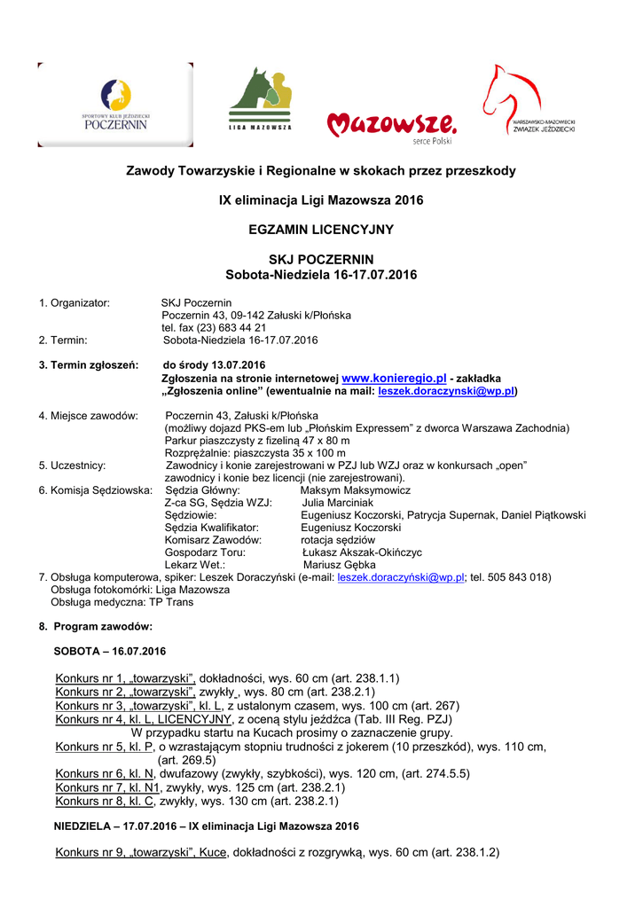 Zawody Towarzyskie i Regionalne w skokach przez przeszkody IX eliminacja Ligi Mazowsza 2016 EGZAMIN LICENCYJNY SKJ POCZERNIN Sobota-Niedziela 16-17.07.2016 1. Organizator: 2. Termin: 3. Termin zgłoszeń: SKJ Poczernin Poczernin 43, 09-142 Załuski k/Płońska tel. fax (23) 683 44 21 Sobota-Niedziela 16-17.07.2016 do środy 13.07.2016 Zgłoszenia na stronie internetowej www.konieregio.pl - zakładka „Zgłoszenia online” (ewentualnie na mail: [email protected]) 4. Miejsce zawodów: Poczernin 43, Załuski k/Płońska (możliwy dojazd PKS-em lub „Płońskim Expressem” z dworca Warszawa Zachodnia) Parkur piaszczysty z fizeliną 47 x 80 m Rozprężalnie: piaszczysta 35 x 100 m 5. Uczestnicy: Zawodnicy i konie zarejestrowani w PZJ lub WZJ oraz w konkursach „open” zawodnicy i konie bez licencji (nie zarejestrowani). 6. Komisja Sędziowska: Sędzia Główny: Maksym Maksymowicz Z-ca SG, Sędzia WZJ: Julia Marciniak Sędziowie: Eugeniusz Koczorski, Patrycja Supernak, Daniel Piątkowski Sędzia Kwalifikator: Eugeniusz Koczorski Komisarz Zawodów: rotacja sędziów Gospodarz Toru: Łukasz Akszak-Okińczyc Lekarz Wet.: Mariusz Gębka 7. Obsługa komputerowa, spiker: Leszek Doraczyński (e-mail: leszek.doraczyń[email protected]; tel. 505 843 018) Obsługa fotokomórki: Liga Mazowsza Obsługa medyczna: TP Trans 8. Program zawodów: SOBOTA – 16.07.2016 Konkurs nr 1, „towarzyski”, dokładności, wys. 60 cm (art. 238.1.1) Konkurs nr 2, „towarzyski”, zwykły , wys. 80 cm (art. 238.2.1) Konkurs nr 3, „towarzyski”, kl. L, z ustalonym czasem, wys. 100 cm (art. 267) Konkurs nr 4, kl. L, LICENCYJNY, z oceną stylu jeźdźca (Tab. III Reg. PZJ) W przypadku startu na Kucach prosimy o zaznaczenie grupy. Konkurs nr 5, kl. P, o wzrastającym stopniu trudności z jokerem (10 przeszkód), wys. 110 cm, (art. 269.5) Konkurs nr 6, kl. N, dwufazowy (zwykły, szybkości), wys. 120 cm, (art. 274.5.5) Konkurs nr 7, kl. N1, zwykły, wys. 125 cm (art. 238.2.1) Konkurs nr 8, kl. C, zwykły, wys. 130 cm (art. 238.2.1) NIEDZIELA – 17.07.2016 – IX eliminacja Ligi Mazowsza 2016 Konkurs nr 9, „towarzyski”, Kuce, dokładności z rozgrywką, wys. 60 cm (art. 238.1.2) Konkurs nr 10, „towarzyski”, Debiuty, dokładności, wys. 60/70 cm (art. 238.1.1) Konkurs nr 11, Kuce i MK, dokładności z rozgrywką, wys. 80 cm (art. 238.1.2) Konkurs nr 12, „towarzyski”, kl. LL, dokładności, z trafieniem w normę czasu, wys. 80 cm (Załącznik S1. Reg. PZJ) Konkurs nr 13, kl. L, LICENCYJNY, z oceną stylu jeźdźca (Tab. III Reg. PZJ) W przypadku startu na Kucach prosimy o zaznaczenie grupy. Konkurs nr 14, kl. L, dwufazowy (dokładności, zwykły), wys. 100 cm (art. 274.5.2) Konkurs nr 15, kl. P, dwufazowy (dokładności, szybkości)i, wys. 110 cm, (art. 274.5.4) Konkurs nr 16, kl. N, zwykły z rozgrywką, wys. 120 cm (art. 238.2.2); Konkurs nr 17, kl. C, zwykły, wys. 130 cm (art. 238.2.1) Konkursy nr 9, 11, 12, 14, 15 i 16 zaliczane do klasyfikacji Ligi Mazowsza Uwaga! Zgodnie z Regulaminem Ligi Mazowsza w konkursie nr 9 obowiązuje certyfikat wzrostu konia podpisany przez uprawnionego przez PZJ lekarza weterynarii, bez konieczności rejestracji certyfikatu w PZJ i wykupu licencji konia. W przypadku konkursu nr 11 obowiązuje oficjalny certyfikat wzrostu konia potwierdzony przez PZJ oraz aktualna licencja PZJ/WZJ. Orientacyjne godziny rozpoczęcia sobotnich konkursów (oraz godziny konkursów niedzielnych) uzależnione są od liczby zgłoszeń i opublikowane będą wraz z sobotnimi wstępnymi listami startowymi w przeddzień zawodów na stronie organizatora www.poczernin.pl oraz www.konieregio.pl „Wyniki online” z poszczególnych konkursów dostępne będą na stronie www.konieregio.pl w zakładce lub boksie „Wyniki online”! 9. Zawody rozgrywane zgodnie z Przepisami i Regulaminem PZJ. Zawodników i konie obowiązuje dokumentacja wg regulaminów i przepisów PZJ. Osoby bez licencji (niezarejestrowane), w konkursach „open” (towarzyskich), obowiązują: aktualne badania lekarskie, ubezpieczenie NNW oraz w przypadku osób niepełnoletnich zgoda rodziców lub opiekunów prawnych. Konkursy „open” (towarzyskie) rozgrywaną są zgodnie z Uchwałą PZJ z dnia 20.12.2013 oraz z równą dbałością o konie, zawodników i rywalizację sportową jak konkursy ZR. 10. W przypadku koni w konkursach „open” – wymagany jest minimum paszport urzędowy z aktualnymi szczepieniami. 11. Zgodnie z Regulaminem B PZJ 2016: - w czasie zawodów ZTiR-B dozwolony jest dwukrotny start konia w ciągu jednego dnia zawodów (art. 4 pkt. 2 - tabela) - w tym samym konkursie, dwukrotny start konia - pod tym samym lub różnymi zawodnikami - jest dozwolony w konkursach do klasy L1 włącznie. Jeżeli na tym samym koniu, w tym samym konkursie startuje ten sam zawodnik, to w konkursach, w których o zwycięstwie decyduje czas przejazdu zalicza się tylko wynik pierwszego startu (art. 4 pkt. 3). 12. Nie przewiduje się odprawy technicznej. Zawodnicy zobowiązani są do przedstawienia dokumentów i wniesienia opłat na min. 1 godzinę przed rozpoczęciem konkursów. 13. Opłaty: - Wpisowe: Sobota - 120 PLN / koń. Niedziela - 120 PLN / koń Sobota-Niedziela – 200 PLN / koń - Startowe: Sobota: konkursy 1, 2 – 10 PLN, 3, 4, 5. – 20 PLN, 6, 7 – 25 PLN, 8 – 30 PLN Niedziela: 13, 14, 15 – 20 PLN, 16 – 25 PLN, 17 – 30 PLN - zgodne z Przepisami B PZJ zmiany na listach startowych powinny być wniesione do 30 minut przed rozpoczęciem konkursu. Po tym terminie i w innych przypadkach obowiązuje opłata manipulacyjna w wysokości 30 PLN, 14. Boksy : 120 PLN / jeden dzień; 200 PLN / zawody (liczba ograniczona). Rezerwacja do wtorku 13.07.2016 na stronie www.konieregio.pl zakładka „Zgłoszenia online” lub telefonicznie: Eugeniusz Koczorski, tel. 601 397 770 Obowiązkowa przedpłata na konto z dopiskiem „za boks” na numer konta: 83 1160 2202 0000 0001 3543 8761 15. Nagrody: - flots i nagrody rzeczowe lub finans