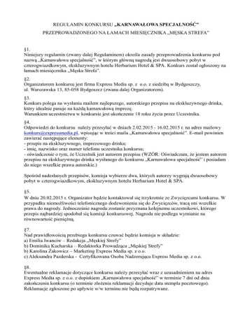 REGULAMIN KONKURSU „KARNAWAŁOWA SPECJALNOŚĆ” PRZEPROWADZONEGO NA ŁAMACH MIESIĘCZNIKA „MĘSKA STREFA” §1. Niniejszy regulamin (zwany dalej Regulaminem) określa zasady przeprowadzenia konkursu pod nazwą „Karnawałowa specjalność”, w którym główną nagrodą jest dwuosobowy pobyt w czterogwiazdkowym, ekskluzywnym hotelu Herbarium Hotel & SPA. Konkurs został ogłoszony na łamach miesięcznika „Męska Strefa”. §2. Organizatorem konkursu jest firma Express Media sp. z o.o. z siedzibą w Bydgoszczy, ul. Warszawska 13, 85-058 Bydgoszcz (zwana dalej Organizatorem). §3. Konkurs polega na wysłaniu mailem najlepszego, autorskiego przepisu na ekskluzywnego drinka, który idealnie pasuje na każdą karnawałową imprezę. Warunkiem uczestnictwa w konkursie jest ukończenie 18 roku życia przez Uczestnika. §4. Odpowiedzi do konkursu należy przesyłać w dniach 2.02.2015 - 16.02.2015 r. na adres mailowy [email protected], wpisując w treści maila „Karnawałowa specjalność”. E-mail powinien zawierać następujące elementy: - przepis na ekskluzywnego, imprezowego drinka; - imię, nazwisko oraz numer telefonu uczestnika konkursu; - oświadczenie o tym, że Uczestnik jest autorem przepisu (WZÓR: Oświadczam, że jestem autorem przepisu na ekskluzywnego drinka wysłanego do konkursu „Karnawałowa specjalność” i posiadam do niego wszelkie prawa autorskie.) Spośród nadesłanych przepisów, komisja wybierze dwa, których autorzy wygrają dwuosobowy pobyt w czterogwiazdkowym, ekskluzywnym hotelu Herbarium Hotel & SPA. §5. W dniu 20.02.2015 r. Organizator będzie kontaktował się trzykrotnie ze Zwycięzcami konkursu. W przypadku niemożliwości telefonicznego dodzwonienia się do Zwycięzców, tracą oni wszelkie prawa do nagrody. Jednocześnie nagroda zostanie przyznana kolejnemu uczestnikowi, którego przepis najbardziej spodobał się komisji konkursowej. Nagroda nie podlega wymianie na równowartość pieniężną. §7. Nad prawidłowością przebiegu konkursu czuwać będzie komisja w składzie: a) Emilia Iwanciw – Redakcja „Męskiej Strefy” b) Dominika Kucharska – Redaktorka Prowadząca „Męskiej Strefy” b) Karolina Żakowicz – Marketing Express Media sp. z o.o. c) Aleksandra Pazderska - Certyfikowana Osoba Nadzorująca Express Media sp. z o.o. §8. Ewentualne reklamacje dotyczące konkursu należy przesyłać wraz z uzasadnieniem na adres Express Media sp. z o.o. z dopiskiem „Karnawałowa specjalność” w terminie 7 dni od dnia zakończenia konkursu (o terminie złożenia reklamacji decyduje data stempla pocztowego). Reklamacje zgłoszone po upływie w/w terminu nie będą rozpatrywane. §9. Termin rozpatrzenia reklamacji przez Organizatora wynosi 30 dni od dnia ich otrzymania przez Organizatora. §10. Organizator nie ponosi odpowiedzialności za: a) problemy w funkcjonowaniu konkursu, jeżeli nastąpiły one wskutek zdarzeń, których Organizator przy zachowaniu należytej staranności nie był w stanie przewidzieć, lub którym nie mogli zapobiec, w szczególności w przypadku problemów związanych ze zdarzeniami losowymi o charakterze siły wyższej; b) przerwy w funkcjonowaniu konkursu zaistniałe z przyczyn technicznych lub niezależnych od Organizatora; c) udział w konkursie niezgodnie z postanowieniami niniejszego Regulaminu i szkody tym spowodowane; d) jakość usług podczas pobytu w Herbarium Hotel & SPA. §11. Organizator zastrzega sobie prawo zmiany postanowień Regulaminu w razie zmiany przepisów prawnych lub z innej ważnej przyczyny, w szczególności jeżeli zmiana pozwoli na sprawne i zgodne z przepisami przeprowadzenie konkursu. §12. Udział w konkursie jest równoznaczny z akceptacją niniejszego regulaminu. Niniejszy Regulamin zostanie udostępniony do wglądu w siedzibie Express Media sp. z o.o. oraz pod adresem www.express.bydgoski.pl i www.nowosci.com.pl. §13. Organizator informuje, że przekazane dane osobowe Uczestnika konkursu będą przetwarzane w celu przeprowadzenia konkursu. Uczestnik wyraża zgodę na przetwarzanie jego danych osobowych w tym celu przez Organizatora. Powyższa zgoda obejmuje również zgodę na ewentualną nieodpłatną publikację imienia i nazwiska oraz zdjęcia Laureatów na stronach internetowych oraz gazety. Uczestnik wyraża również zgodę na przetwarzanie jego danych osobowych przez Organizatora konkursu dla innych celów marketingowych. Administratorem zbioru danych osobowych jest Express Media sp. z o.o. z siedzibą w Bydgoszczy przy ul. Warszawskiej 13. Administrator danych osobowych informuje, że podanie danych osobowych jest dobrowolne, choć warunkuje możliwość udziału w konkursach, oraz że Uczestnikowi przysługuje prawo dostępu do jego danych oraz ich poprawiania.
