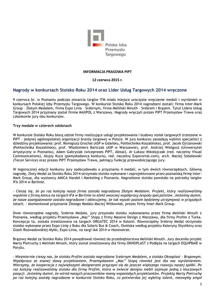 INFORMACJA PRASOWA PIPT 12 czerwca 2015 r. Nagrody w konkursach Stoisko Roku 2014 oraz Lider Usług Targowych 2014 wręczone 9 czerwca br. w Poznaniu podczas otwarcia targów ITM miało miejsce uroczyste wręczenie medali i wyróżnień w konkursach Polskiej Izby Przemysłu Targowego. W konkursie Stoisko Roku 2014 nagrodzeni zostali: firma Inter-Mark Group – Złotym Medalem, firma Expo Linia – Srebrnym, firma Meliński Minuth – Srebrem i Brązem. Tytuł Lidera Usług Targowych 2014 przyznany został firmie MAXPOL z Warszawy. Nagrody wręczyli prezes PIPT Przemysław Trawa oraz członkowie jury obu konkursów. Trzy medale w czterech odsłonach W konkursie Stoisko Roku biorą udział firmy realizujące usługi projektowania i budowy stoisk targowych zrzeszone w PIPT - jedynej ogólnopolskiej organizacji branży targowej w Polsce. W jury konkursu zasiadają wybitni specjaliści z dziedziny projektowania: prof. Remigiusz Grochal (ASP w Gdańsku, Politechnika Koszalińska), prof. Jacek Ojrzanowski (Politechnika Koszalińska), prof. Włodzimierz Bartczak (ASP w Warszawie), prof. Andrzej Wielgosz (Uniwersytet Artystyczny w Poznaniu), Adam Gabrysiak (wiceprezes PIPT, Abisal), dr Łukasz Mikołajczak (red. naczelny Visual Communications), Alojzy Kuca (pomysłodawca konkursu, red. naczelny Expovortal.com), arch. Maciej Sobolewski (Tecon Service) oraz prezes PIPT Przemysław Trawa, pełniący funkcję przewodniczącego jury. W tegorocznej edycji konkursu jury zadecydowało o przyznaniu 4 medali, w tym dwóch równorzędnych. Główną nagrodę, Złoty Medal za Stoisko Roku 2014 otrzymało stoisko wykonane i zaprojektowane przez poznańską firmę InterMark Group, dla wystawcy AMICA Handel i Marketing z Poznania. Nagrodzone stoisko powstało na potrzeby targów IFA 2014 w Berlinie. – Cieszę się, że po raz kolejny nasza firma została nagrodzona Złotym Medalem. Projekt, który realizowaliśmy wspólnie z firmą Amica na targach IFA w Berlinie to efekt owocnej współpracy zespołu specjalistów. Jesteśmy dumni, że nasze zaangażowanie zostało nagrodzone i obiecujemy, że tak wysoki poziom będziemy utrzymywać w przyszłych latach. – skomentował przyznanie Złotego Medalu Maciej Witkowiak, prezes firmy Inter-Mark Group. Dwie równorzędne nagrody, Srebrne Medale, jury przyznało stoisku wykonanemu przez firmę Meliński Minuth z Poznania, według projektu Przemysława „Mac” Stopy z firmy Massive Design z Warszawy, dla firmy Profim z Turka. Koncepcja ta, została zrealizowana na targach ORGATEC 2014 w Kolonii. Równorzędny Srebrny Medal otrzymało stoisko wykonane przez Expo Linię z Buku dla Solaris Bus & Coach, Owińska według projektu Kateryny Shyshkiny oraz Gizeli Rozwadowskiej-Mylki, Expo-Linia, na targi IAA 2014 w Hanowerze. Brązowy Medal za Stoisko Roku 2014 powędrował również do przedsiębiorstwa Meliński Minuth. Jury doceniło projekt Marty Pietruchy z Meliński Minuth, który został zrealizowany dla firmy OKNOPLAST z Podłęża na targach EQUIPBAIE w Paryżu. – Niezmiernie cieszy nas, że stoisko Profim zostało nagrodzone Srebrnym Medalem, a stoisko Oknoplast – Brązowym. Współpraca ze znanej sławy projektantem, Przemysławem „Mac” Stopą również jest dla nas wyróżnieniem. Wierzymy, że kooperacja z największymi designerami przyczyni się do jeszcze większego rozwoju naszej spółki. Po raz kolejny realizowaliśmy stoisko dla firmy Profim, która w świecie designu mebli zajmuje jedną z kluczowych pozycji. Jesteśmy dumni, że wśród naszych pracowników mamy wspaniałych projektantów. Projekty Marty Pietruchy po raz kolejny zostały nagrodzone w konkursie Stoisko Roku, co potwierdza jej wybitny talent, niezwykły zmysł 1 artystyczny oraz pasję do wykonywanej pracy. – nie krył zadowolenia z otrzymanych nagród Andrzej Meliński, prezes Meliński Minuth. Jury oceniało nadesłane projekty pod kątem nowatorskich rozwiązań architektonicznych w wystawiennictwie, zastosowania nowych technologii i materiałów oraz nowoczesnej myśli wystawienniczej, z uwzględnieniem aspektów marketingowych. Targi mają swoich liderów Konkurs Lider Usług Targowych organizowany jest dla członków PIPT – projektantów i wykonawców stoisk targowych. Głównym celem konkursu jest podnoszenie jakości usług targowych oraz promocja przedsiębiorstw wdrażających nowoczesną myśl wystawienniczą. W skład jury konkursu Lider Usług Targowych 2014 weszli: arch. Ryszard Grajewski – wybitny projektant architektury wystawienniczej, Członek Honorowy PIPT, oraz laureaci poprzednich edycji: Włodzimierz Gola (PROMOCJA) oraz Jan Lisiak i Piotr Wojewodzic (INEXPO Poznańska Agencja Targowa). Lider z doświadczeniem Tegoroczny laureat – MAXPOL – to firma z 25 letnim doświadczeniem, Członek Polskiej Izby Przemysłu Targowego od momentu jej powołania. Swoim klientom oferuje szeroki wachlarz usług związanych z projektowaniem i budową stoisk targowych skierowanych zarówno do indywidualnych wystawców jak i dla narodowych wystąpień. Ponadto oferuje szereg usług logistycznych, począwszy od rezerwacji przelotu i pobytu w hotelu, na pomocy przy spedycji eksponatów na targi skończywszy. – Bardzo się cieszymy, ze zostaliśmy Liderem Usług Targowych 2014. Dotychczas w konkursie zostaliśmy uhonorowani trzykrotnie. Od początku istnienia staramy się pracować na najwyższym poziomie i coraz lepiej obsługiwać naszych wystawców. Nasza działalność wykracza poza granice Europy, obsługujemy klientów również na innych kontynentach. Nasi wystawcy doceniają fakt, że zapewniamy im kompleksową obsługę od A do Z i to kompleksowe podejście czyni nas liderem usług targowych. – nie krył zadowolenia z rozstrzygnięcia Konkursu Wojciech Ryttel, Dyrektor ds. Marketingu MAXPOL. Jury zadecydowało również o przyznaniu dwóch wyróżnień firmom Meliński Minuth sp. z o.o., oraz Międzynarodowym Targom Poznańskim sp. z o.o. IDEAEXPO, z Poznania.