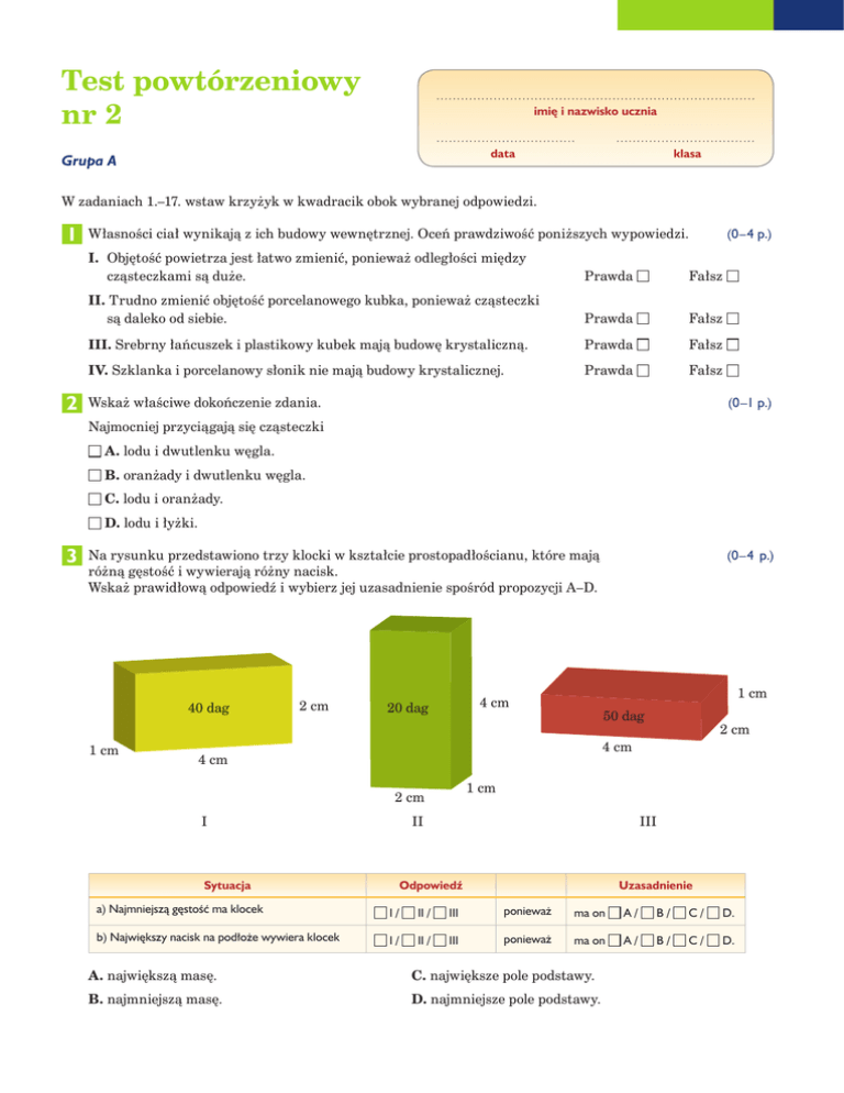 Test powtórzeniowy nr 2 .............................................................................. imię i nazwisko ucznia .................................. data Grupa A .................................. klasa W zadaniach 1.–17. wstaw krzyżyk w kwadracik obok wybranej odpowiedzi. 1 Własności ciał wynikają z ich budowy wewnętrznej. Oceń prawdziwość poniższych wypowiedzi. (0–4 p.) I. Objętość powietrza jest łatwo zmienić, ponieważ odległości między cząsteczkami są duże. Prawda Fałsz II. Trudno zmienić objętość porcelanowego kubka, ponieważ cząsteczki są daleko od siebie. Prawda Fałsz III. Srebrny łańcuszek i plastikowy kubek mają budowę krystaliczną. Prawda Fałsz IV. Szklanka i porcelanowy słonik nie mają budowy krystalicznej. Prawda Fałsz 2 Wskaż właściwe dokończenie zdania. (0–1 p.) Najmocniej przyciągają się cząsteczki A. lodu i dwutlenku węgla. B. oranżady i dwutlenku węgla. C. lodu i oranżady. D. lodu i łyżki. 3 Na rysunku przedstawiono trzy klocki w kształcie prostopadłościanu, które mają (0–4 p.) różną gęstość i wywierają różny nacisk. Wskaż prawidłową odpowiedź i wybierz jej uzasadnienie spośród propozycji A–D. 40 dag 1 cm 2 cm 1 cm 4 cm 20 dag 50 dag 2 cm 4 cm 4 cm 1 cm 2 cm I II Sytuacja III Odpowiedź Uzasadnienie a) Najmniejszą gęstość ma klocek I / II / III ponieważ ma on A / B/ C/ D. b) Największy nacisk na podłoże wywiera klocek I / II / III ponieważ ma on A / B/ C/ D. A. największą masę. C. największe pole podstawy. B. najmniejszą masę. D. najmniejsze pole podstawy. 4 Do naczynia z wodą wstawiono rurkę. Poziom wody w naczyniu zaznaczono poprawnie na rysunku I II A. I. III B. II. C. III. IV D. IV. 5 Kiedy gimnastyczka wywiera najmniejsze ciśnienie na podłoże? Dlaczego? (0–2 p.) Wskaż właściwą odpowiedź i wybierz jej uzasadnienie spośród propozycji A–D. I II (0–1 p.) III Najmniejsze ciśnienie wywiera gimnastyczka ćwicząca w pozycji przedstawionej na rysunku ponieważ A / B / C / D. I / II / III, A. działa wtedy na podłoże najmniejszą siłą nacisku. B. powierzchnia jej styku z podłożem jest najmniejsza. C. powierzchnia jej styku z podłożem jest największa. D. działa wtedy na podłoże największą siłą nacisku. 6 Wskaż właściwe dokończenie zdania. (0–1 p.) Kaloryfery montuje się zazwyczaj blisko podłogi, ponieważ dzięki takiemu ich umieszczeniu ogrzewane jest powietrze w całym pomieszczeniu. Dzieje się tak za sprawą A. konwekcji. B. promieniowania. C. przewodnictwa. D. resublimacji. Informacja do zadań 7. i 8. Na poniższym wykresie przedstawiono zależność temperatury od ciepła dostarczonego do 1 kg wody podczas jej gotowania. 140 120 III II 100 80 I 60 40 20 0 336 672 1008 1344 1680 2016 2352 2688 3024 Q [kJ] 7 Wybierz właściwą odpowiedź i jej uzasadnienie spośród propozycji A–D. a) Ogrzewaniu wody odpowiada A / B / C / D. b) Wrzeniu wody odpowiada A / B / C / D. I / I / II / II / (0–4 p.) III odcinek wykresu, ponieważ z wykresu można odczytać, że III odcinek wykresu, ponieważ z wykresu można odczytać, że A. dostarczone ciepło powoduje wzrost jej temperatury. B. odebrane ciepło powoduje spadek jej temperatury. C. dostarczone ciepło nie zmienia jej temperatury. D. dostarczone ciepło powoduje spadek jej temperatury. 8 Wskaż właściwe dokończenie zdania. (0–1 p.) Ilość energii potrzebna do ogrzania 3 kg wody od temperatury 20°C do temperatury 100°C wynosi A. 11,2 kJ. B. 112 kJ. C. 336 kJ. D. 1008 kJ. 9 Poniżej przedstawiono pary wyrażeń, pomiędzy którymi zachodzi związek: jedno z nich opisuje przyczynę, a drugie – skutek. Wstaw krzyżyk w kwadracik obok wyrażenia opisującego skutek. 1. schnięcie ubrań – 2. podnoszenie się słupka cieczy w termometrze – 3. tworzenie się kostek lodu – 4. pocieranie dłoni – parowanie wody rozszerzalność temperaturowa cieczy oddawanie przez wodę energii wzrost energii wewnętrznej dłoni (0–4 p.) Informacja do zadań 10. i 11. kg Sześcienną kostkę o krawędzi 0,05 m i gęstości 11 000 m3 włożono do naczynia z wodą. Gęstość wody wynosi kg 1000 m3 . 10 Wskaż właściwe dokończenie zdania. (0–1 p.) Kostka po włożeniu do wody A. zanurzy się w niej minimalnie. B. zanurzy się w niej do połowy swojej wysokości. C. będzie się w niej unosić całkowicie zanurzona. D. opadnie na dno naczynia. 11 Wskaż właściwe dokończenie zdania. (0–1 p.) Wartość siły wyporu działającej na całkowicie zanurzoną kostkę wynosi A. 1,25 N. B. 13,75 N. C. 25 N. D. 27,5 N. 12 Wiedząc, że aby ogrzać 0,5 kg ołowiu od temperatury 20°C do 40°C, należy dostarczyć (0–1 p.) 1,3 kJ energii, oblicz ciepło właściwe ołowiu. Wskaż poprawną odpowiedź. J A. 65 kg · °C J B. 130 kg · °C J J C. 260 kg · °C D. 1300 kg · °C 13 Wskaż właściwe dokończenie zdania. (0–1 p.) Gęstość prostopadłościanu wynosi g A. 0,5 cm3 . 3 cm g B. 0,9 cm3 . g C. 3 cm3 . 2 cm g 0,5 cm 0,009 kg D. 9 cm3 . Informacja do zadań 14.–16. Robotnik podnosi ładunek za pomocą maszyny prostej (patrz rysunek). F=? m = 25 kg 14 Wskaż właściwe dokończenie zdania. (0–1 p.) Robotnik podnosi ładunek za pomocą A. kołowrotu. B. bloczka ruchomego. C. bloczka nieruchomego. D. dźwigni jednostronnej. 15 Wskaż właściwe dokończenie zdania. (0–1 p.) Robotnik, podnosząc ładunek, działa siłą o wartości A. 25 N. B. 125 N. C. 250 N. D. 500 N. 16 Wskaż właściwe dokończenie zdania. (0–1 p.) Praca wykonana przez robotnika przy podnoszeniu ładunku na wysokość 4 m wynosi A. 0,25 kJ. B. 1 kJ. C. 2,5 kJ. D. 100 kJ. 17 Zosia włożyła do wody trzy sześciany o jednakowej objętości i różnej masie, na które działały różne siły wyporu (patrz rysunek). III II I Wskaż właściwą odpowiedź i wybierz spośród propozycji A–D informację, na podstawie której wysnuwasz swój wniosek. a) Największa siła wyporu działa na sześcian 