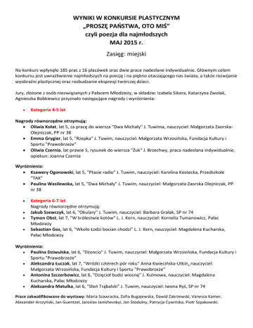 WYNIKI W KONKURSIE PLASTYCZNYM „PROSZĘ PAŃSTWA, OTO MIŚ” czyli poezja dla najmłodszych MAJ 2015 r. Zasięg: miejski Na konkurs wpłynęło 185 prac z 16 placówek oraz dwie prace nadesłane indywidualnie. Głównym celem konkursu jest uwrażliwienie najmłodszych na poezję i na piękno otaczającego nas świata, a także rozwijanie wyobraźni plastycznej oraz rozbudzanie ekspresji twórczej dzieci. Jury, złożone z osób niezwiązanych z Pałacem Młodzieży, w składzie: Izabela Sikora, Katarzyna Zwolak, Agnieszka Bobkiewicz przyznało następujące nagrody i wyróżnienia: Kategoria 4-5 lat Nagrody równorzędne otrzymują: Oliwia Kołat, lat 5, za pracę do wiersza "Dwa Michały" J. Tuwima, nauczyciel: Małgorzata ZaorskaOlejniczak, PP nr 38 Emma Grygier, lat 5, "Rzepka" J. Tuwim, nauczyciel: Małgorzata Wrzosińska, Fundacja Kultury i Sportu "Prawobrzeże" Oliwia Czernia, lat prawie 5, rysunek do wiersza "Żuk" J. Brzechwy, praca nadesłana indywidualnie, opiekun: Joanna Czernia Wyróżnienia: Ksawery Ogonowski, lat 5, "Ptasie radio" J. Tuwim, nauczyciel: Karolina Kostecka, Przedszkole "TAK" Paulina Wasilewska, lat 5, "Dwa Michały" J. Tuwim, nauczyciel: Małgorzata Zaorska Olejniczak, PP nr 38 Kategoria 6-7 lat Nagrody równorzędne otrzymują: Jakub Szewczyk, lat 6, "Okulary" J. Tuwim, nauczyciel: Barbara Gralak, SP nr 74 Tymon Obst, lat 7, "W królestwie kotów" L. J. Kern, nauczyciel: Kornelia Tumanowicz, Pałac Młodzieży Sebastian Gos, lat 6, "Wkoło Łodzi bocian chodzi" L. J. Kern, nauczyciel: Magdalena Kucharska, Pałac Młodzieży Wyróżnienia: Paulina Dziwulska, lat 6, "Dżoncio" J. Tuwim, nauczyciel: Małgorzata Wrzosińska, Fundacja Kultury i Sportu "Prawobrzeże" Aleksandra Łuczak, lat 7, "Wróżki czterech pór roku" Anna Kwiecińska-Utkin, nauczyciel: Małgorzata Wrzosińska, Fundacja Kultury i Sportu "Prawobrzeże" Antonina Szczerbowicz, lat 6, "Dzięcioł budzi wiosnę" J. Kulmowa, nauczyciel: Magdalena Kucharska, Pałac Młodzieży Aleksandra Matulka, lat 6, "Słoń Trąbalski" J. Tuwim, nauczyciel: Iwona Ryś, SP nr 74 Prace zakwalifikowane do wystawy: Maria Szawracka, Zofia Bugajewska, Dawid Zakrzewski, Vanessa Kamer, Alexander Arszyński, Jan Guentzel, Jaroslav Janishevskyi, Jan Stodulny, Patrycja Cywińska, Piotr Szpakowski. Oficjalne podsumowanie konkursu oraz otwarcie wystawy odbędzie się dnia 30 maja (w sobotę) o godz. 11.00, podczas imprezy z cyklu "Sobota w Pałacu".