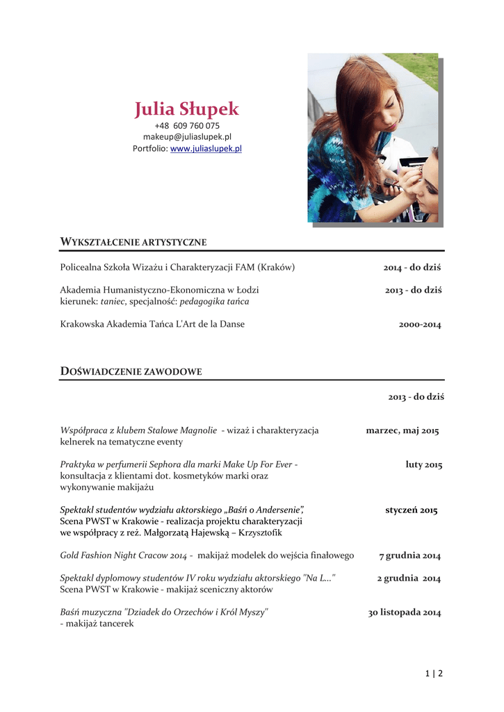 Julia Słupek +48 609 760 075 [email protected] Portfolio: www.juliaslupek.pl WYKSZTAŁCENIE ARTYSTYCZNE Policealna Szkoła Wizażu i Charakteryzacji FAM (Kraków) 2014 - do dziś Akademia Humanistyczno-Ekonomiczna w Łodzi kierunek: taniec, specjalność: pedagogika tańca 2013 - do dziś Krakowska Akademia Tańca L'Art de la Danse 2000-2014 DOŚWIADCZENIE ZAWODOWE 2013 - do dziś Współpraca z klubem Stalowe Magnolie - wizaż i charakteryzacja kelnerek na tematyczne eventy Praktyka w perfumerii Sephora dla marki Make Up For Ever konsultacja z klientami dot. kosmetyków marki oraz wykonywanie makijażu Spektakl studentów wydziału aktorskiego „Baśń o Andersenie”, Scena PWST w Krakowie - realizacja projektu charakteryzacji we współpracy z reż. Małgorzatą Hajewską – Krzysztofik marzec, maj 2015 luty 2015 styczeń 2015 Gold Fashion Night Cracow 2014 - makijaż modelek do wejścia finałowego 7 grudnia 2014 Spektakl dyplomowy studentów IV roku wydziału aktorskiego "Na L..." Scena PWST w Krakowie - makijaż sceniczny aktorów 2 grudnia 2014 Baśń muzyczna "Dziadek do Orzechów i Król Myszy" - makijaż tancerek 30 listopada 2014 1|2 Małopolskie Targi Ślubne 2014, współpraca z firmą Magia Kwiatów - charakteryzacja modelki na królową śniegu Koncert "Zapomniana Piosenka" w ramach XI Ogólnopolskiego Festiwalu Piosenki Retro im. M. Fogga, Studio Faraf ka - makeup lat 20. i 30. 15 listopada 2014 25 października 2014 "Trampkarz", etiuda filmowa studenta Wydziału Radia i Telewizji wrzesień 2014 Uniwersytetu Śląskiego w Katowicach (reż. Tomasz Sikora) - makijaż dzienny Edyty Torhan oraz charakteryzacja głównego bohatera (pobicie) Gala Baletowa Krakowskiej Akademii Tańca L'Art de la Danse, Teatr Ludowy w Krakowie - makijaż sceniczny tancerek "E/motion", etiuda filmowa w choreografii Moniki Myśliwiec - wizaż tancerek czerwiec 2014 styczeń 2014 makijaż ślubny oraz okazjonalny dla prywatnych klientów wizaż do sesji zdjęciowych współpraca z firmą fotograficzną "Anais Photography" OSIĄGNIĘCIA Edytorial "Harmony" w IpressMagazine (http://www.ipressmagazine.com/editorials-28.html) Edytorial "The Italian Madness" w Magazynie E-makeupownia listopad 2015 październik 2015 Edytorial "Simplicity" w IpressMagazine http://www.ipressmagazine.com/editorials-24.html wrzesień 2015 Edytorial "Milky fantasy" w Magazynie E-makijaż sierpień 2015 Edytorial "A little joke" w Neveralazy Magazine grudzień 2014 2|2