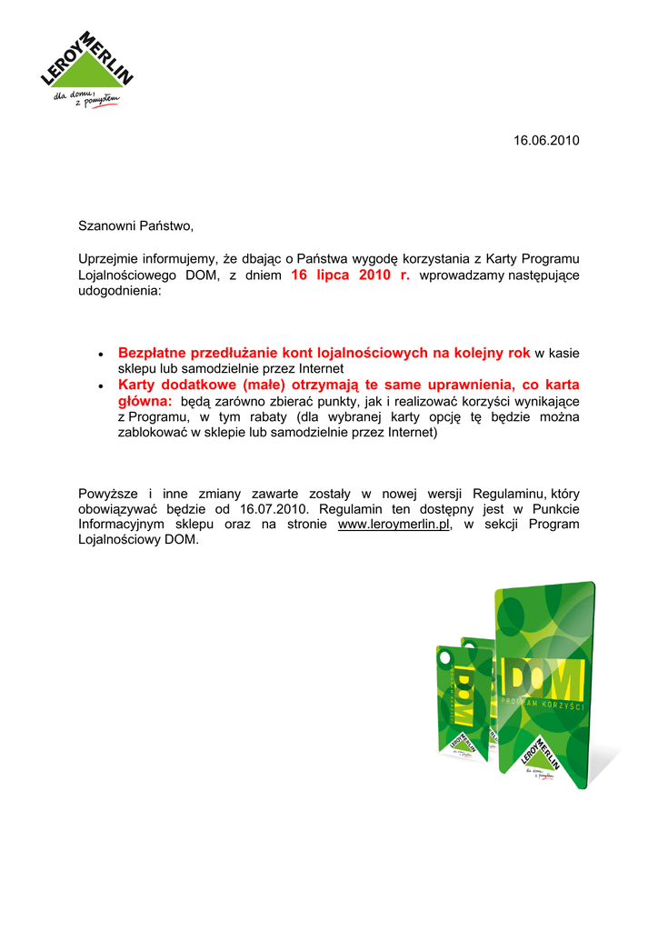 16.06.2010 Szanowni Państwo, Uprzejmie informujemy, że dbając o Państwa wygodę korzystania z Karty Programu Lojalnościowego DOM, z dniem 16 lipca 2010 r. wprowadzamy następujące udogodnienia: • Bezpłatne przedłużanie kont lojalnościowych na kolejny rok w kasie sklepu lub samodzielnie przez Internet • Karty dodatkowe (małe) otrzymają te same uprawnienia, co karta główna: będą zarówno zbierać punkty, jak i realizować korzyści wynikające z Programu, w tym rabaty (dla wybranej karty opcję tę będzie można zablokować w sklepie lub samodzielnie przez Internet) Powyższe i inne zmiany zawarte zostały w nowej wersji Regulaminu, który obowiązywać będzie od 16.07.2010. Regulamin ten dostępny jest w Punkcie Informacyjnym sklepu oraz na stronie www.leroymerlin.pl, w sekcji Program Lojalnościowy DOM. Regulamin Programu Lojalnościowego DOM Niniejszy Regulamin określa zasady funkcjonowania Programu DOM, organizowanego przez Leroy Merlin Polska Sp. z o.o. W szczególności Regulamin niniejszy określa prawa i obowiązki Organizatora Programu oraz uczestniczących w nim osób. Użyte w Regulaminie określenia oznaczają: 1. LMP – Leroy – Merlin Polska Sp. z o.o. z siedzibą w Warszawie, przy ul. Targowej 72, wpisana do rejestru przedsiębiorców Krajowego Rejestru Sądowego przez Sąd Rejonowy dla Miasta Stołecznego Warszawy, XIII Wydział Gospodarczy KRS pod numerem 0000053665, NIP: 11300-89-950, o kapitale zakładowym w wysokości 51 000 000 zł. 2. Program – program organizowany przez LMP, przeprowadzany w jej sklepach znajdujących się na terenie Rzeczypospolitej Polskiej, który polega na tym, że Klient, będący Uczestnikiem Programu, nagradzany jest za nabywanie towarów i usług na własne potrzeby w sklepach LMP poprzez przyznawanie Punktów. Punkty uprawniają Uczestnika do otrzymania Rabatów i innych korzyści określonych w niniejszym Regulaminie oraz w materiałach marketingowych LMP. 3. Uczestnik – pełnoletni Klient LMP, będący osobą fizyczną, nabywający towar w sklepie LMP w celu niezwiązanym z działalnością zarobkową lub gospodarczą, który przystąpił do Programu zgodnie z postanowieniami niniejszego Regulaminu. Na podstawie odrębnej zgody wybranego sklepu LMP Uczestnikami Programu mogą być także inne podmioty. 4. Karty Programu – pakiet Kart, składający się z Karty Głównej i minimum dwóch Kart Dodatkowych, przypisanych do jednego Konta Uczestnika. Funkcję Karty Programu może pełnić także Karta Kredytowa VISA LM, jeżeli zostanie przypisana do Konta Uczestnika. Karta Programu identyfikuje Uczestnika Programu, potwierdza uczestnictwo w Programie i służy do zbierania przyznawanych w Programie Punktów oraz wykorzystywania przewidzianych w Programie korzyści (np. Rabatów). 5. Konto Uczestnika – oznacza Konto utworzone dla Uczestnika zgodnie z niniejszym Regulaminem. Na Koncie Uczestnika ujawnia się stan Konta, czyli aktualną liczbę Punktów zebranych przez Uczestnika, uwzględniającą Punkty przyznane, odjęte i unieważnione. 6. Formularz Rejestracyjny – Formularz, na którym Uczestnik zgłasza zamiar przystąpienia do Programu, akceptuje jego warunki, podaje swoje dane osobowe oraz wyraża zgodę na przetwarzanie podanych danych osobowych. 7. Regulamin – niniejszy Regulamin Programu. 8. Rabat Lojalnościowy – Rabat przyznawany Uczestnikowi Programu w zamian za Punkty zdobyte w ramach Programu, na zasadach określonych w Regulaminie. 9. Rabat Powitalny – Rabat przyznawany Uczestnikowi Programu jednorazowo po przystąpieniu do Programu i aktywacji Konta, zgodnie z rozdziałem II Regulaminu. 10. Rabat – Rabat Lojalnościowy lub Rabat Powitalny. I. Postanowienia ogólne 1.1. Organizatorem Programu jest LMP. 1.2. Celem Programu jest ułatwienie Uczestnikom relacji z doradcami LMP i promocja towarów oferowanych przez Organizatora. 1.3. Uczestnictwo w Programie i podanie związanych z nim danych jest całkowicie dobrowolne. 1.4. Program organizowany jest we wszystkich sklepach prowadzonych przez LMP pod marką „Leroy-Merlin” na terenie Polski. II. Przystąpienie do Programu 2.1. Uczestnikiem Programu może być osoba fizyczna, która ukończyła 18 lat, posiadająca pełną zdolność do czynności prawnych. 2.2. W celu przystąpienia do Programu należy zapoznać się z Regulaminem, wypełnić w sposób kompletny i zgodny z prawdą Formularz Rejestracyjny, a następnie podpisać go i złożyć we właściwym sklepie LMP, a także uiścić jednorazową opłatę za uczestnictwo w Programie w wysokości 20 zł. Wniesienie powyższej opłaty jest warunkiem skutecznego przystąpienia do Programu i aktywacji Konta Uczestnika w ramach Programu. 2.3. W Formularzu Rejestracyjnym Uczestnik dobrowolnie podaje swoje dane osobowe niezbędne do prawidłowej realizacji Programu, wyrażając jednocześnie zgodę na ich przechowywanie, przetwarzanie i wykorzystywanie przez LMP w celach marketingowych oraz związanych z realizacją Programu. Jednocześnie Uczestnik upoważnia LMP do udostępniania swoich danych Partnerom oraz zezwala im na ich przechowywanie, przetwarzanie i wykorzystywanie w celach marketingowych oraz związanych z realizacją Programu, w tym także na otrzymywanie od Organizatora informacji handlowych drogą elektroniczną. Wyrażenie zgody jest warunkiem wzięcia udziału w Programie. W przypadku braku podpisu na Formularzu Rejestracyjnym Organizator upoważniony jest do skontaktowania się z osobą, której dane zostały podane w formularzu, w celu poinformowania o braku podpisu, jego konsekwencjach i sposobie uzupełnienia powyższego braku. 2.4. Uczestnik, dla celów korespondencyjnych, zobowiązany jest podać numer telefonu komórkowego, adres e-mailowy, a w przypadku, gdy nie posiada dostępu do Internetu bądź telefonu komórkowego, może wskazać adres pocztowy, który nie może być adresem skrytki pocztowej. 2.5. Poprzez wypełnienie Formularza Rejestracyjnego i złożenie na 