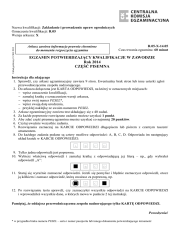 Ukáad graficzny © CKE 2013 Nazwa kwalifikacji: Zakáadanie i prowadzenie upraw ogrodniczych Oznaczenie kwalifikacji: R.05 Wersja arkusza: X R.05-X-14.05 Czas trwania egzaminu: 60 minut Arkusz zawiera informacje prawnie chronione do momentu rozpoczĊcia egzaminu EGZAMIN POTWIERDZAJĄCY KWALIFIKACJE W ZAWODZIE Rok 2014 CZĉĝû PISEMNA Instrukcja dla zdającego 1. SprawdĨ, czy arkusz egzaminacyjny zawiera 9 stron. Ewentualny brak stron lub inne usterki zgáoĞ przewodniczącemu zespoáu nadzorującego. 2. Do arkusza doáączona jest KARTA ODPOWIEDZI, na której w oznaczonych miejscach: – wpisz oznaczenie kwalifikacji, – zamaluj kratkĊ z oznaczeniem wersji arkusza, – wpisz swój numer PESEL*, – wpisz swoją datĊ urodzenia, – przyklej naklejkĊ ze swoim numerem PESEL. 3. Arkusz egzaminacyjny zawiera test skáadający siĊ z 40 zadaĔ. 4. Za kaĪde poprawnie rozwiązane zadanie moĪesz uzyskaü 1 punkt. 5. Aby zdaü czĊĞü pisemną egzaminu musisz uzyskaü co najmniej 20 punktów. 6. Czytaj uwaĪnie wszystkie zadania. 7. Rozwiązania zaznaczaj na KARCIE ODPOWIEDZI dáugopisem lub piórem z czarnym tuszem/ atramentem. 8. Do kaĪdego zadania podane są cztery moĪliwe odpowiedzi: A, B, C, D. Odpowiada im nastĊpujący ukáad kratek w KARCIE ODPOWIEDZI: A B C D 9. Tylko jedna odpowiedĨ jest poprawna. 10. Wybierz wáaĞciwą odpowiedĨ i zamaluj kratkĊ z odpowiadającą jej literą – np., gdy wybraáeĞ odpowiedĨ „A”: A B C D 11. Staraj siĊ wyraĨnie zaznaczaü odpowiedzi. JeĪeli siĊ pomylisz i báĊdnie zaznaczysz odpowiedĨ, otocz ją kóákiem i zaznacz odpowiedĨ, którą uwaĪasz za poprawną, np. A B C D 12. Po rozwiązaniu testu sprawdĨ, czy zaznaczyáeĞ wszystkie odpowiedzi na KARCIE ODPOWIEDZI i wprowadziáeĞ wszystkie dane, o których mowa w punkcie 2 tej instrukcji. PamiĊtaj, Īe oddajesz przewodniczącemu zespoáu nadzorującego tylko KARTĉ ODPOWIEDZI. Powodzenia! * w przypadku braku numeru PESEL – seria i numer paszportu lub innego dokumentu potwierdzającego toĪsamoĞü Zadanie 1. Truskawki najszybciej dojrzeją, jeĞli bĊdą uprawiane na zboczu o wystawie A. B. C. D. zachodniej. wschodniej. póánocno-wschodniej. poáudniowo-zachodniej. Zadanie 2. W póánocno wschodniej Polsce, nie naleĪy zakáadaü sadów jabáoniowych na podkáadce A. B. C. D. A2 M7 P 22 M 26 Zadanie 3. Jednoroczne okulanty jabáoni najlepiej sadziü A. B. C. D. w maju. w czerwcu. w listopadzie. w paĨdzierniku. Zadanie 4. Najlepszym stanowiskiem do uprawy borówki wysokiej są gleby A. B. C. D. ciĊĪkie o wysokim pH. lekkie o obojĊtnym pH. próchniczne o niskim pH. próchniczne o wysokim pH. Zadanie 5. W pierwszym roku po posadzeniu drzew w sadzie, naleĪy wykonywaü nawoĪenie A. B. C. D. fosforowe w rzĊdach drzew. azotowe na caáą powierzchniĊ sadu. azotowe, indywidualnie pod kaĪde drzewo. potasowe, indywidualnie pod kaĪde drzewo. Strona 2 z 9 Zadanie 6. Nadmierne nawoĪenie azotem máodych drzew jabáoni powoduje A. B. C. D. zahamowanie wzrostu wegetatywnego drzew. przyspieszenie wejĞcia w okres owocowania. wiĊkszą odpornoĞü na choroby grzybowe. wiĊkszą wraĪliwoĞü na przemarzanie. Zadanie 7. Krzewy malin odmiany Polana najkorzystniej jest prowadziü w formie A. B. C. D. swobodnie rosnącej w rzĊdach. swobodnie rosnącej na caáej powierzchni. szpaleru z okrĊcaniem pĊdów wokóá drutów. szpaleru z przywiązywaniem pĊdów do drutów. Zadanie 8. W celu ochrony kwitnących jabáoni przed nocnymi przymrozkami, w sadzie produkcyjnym naleĪy A. B. C. D. zamgáawiaü drzewa wodą. podlewaü drzewa roztworem mocznika. opryskiwaü drzewa regulatorami wzrostu. malowaü pnie biaáą farbą z dodatkiem wapna. Zadanie 9. Podczas rozmnaĪania krzewów owocowych przez odkáady pionowe, jedną z wykonywanych czynnoĞci, jest przyciĊcie pĊdów A. B. C. D. tuĪ nad ziemią. o 1/2 ich dáugoĞci. o sam wierzchoáek. 2 – 3 oczka nad ziemią. Zadanie 10. ZdjĊcie przedstawia A. B. C. D. mszycĊ wiĞniową. nasionnicĊ trzeĞniówkĊ. przĊdziorka chmielowca. owocówkĊ ĞliwkóweczkĊ. Strona 3 z 9 Zadanie 11. Jasnozielone plamy na liĞciach, przebarwienia na skórce owoców oraz czerwienienie miąĪszu Ğliwek, to objawy A. B. C. D. torbieli. ospowatoĞci. brunatnej zgnilizny. czerwonej plamistoĞci. Zadanie 12. Chwast wystĊpujący w uprawach sadowniczych, widoczny na zdjĊciu, to A. B. C. D. mlecz polny. komosa biaáa. ostroĪeĔ polny. gwiazdnica pospolita. Zadanie 13. Do zwalczania mszyc w uprawie wiĞni, naleĪy dobraü pestycyd z grupy A. B. C. D. repelentów. akarycydów. insektycydów. nematocydów. Zadanie 14. Gruszki od jesieni do wiosny naleĪy przechowywaü w temperaturze A. B. C. D. –2,5°C –0,5°C 2,5°C 4,5°C Zadanie 15. Okulanty w sadzie naleĪy posadziü w rozstawie 2 m x 2,5 m. Oblicz koszt zakupu drzewek do obsadzenia 50 arów, przyjmując cenĊ jednego drzewka 12 zá. A. B. C. D. 12000 zá 2400 zá 1200 zá 240 zá Strona 4 z 9 Zadanie 16. Którą z metod siewu naleĪy zastosowaü przy uprawie pietruszki? A. B. C. D. a b c d Zadanie 17. Przed wysiewem nasion warzyw siewnikiem precyzyjnym, naleĪy najpierw wykonaü zabieg A. B. C. D. moczenia. stratyfikacji. zaprawiania. otoczkowania. Zadanie 18. Czosnek naleĪy rozmnaĪaü poprzez A. B. C. D. podziaá karp. wysiew nasion. drobne cebulki. wysadzenie rozsady. Zadanie 19. W pierwszym roku po oborniku nie naleĪy uprawiaü A. B. C. D. grochu. buraków. ogórków. ziemniaków. Zadanie 20. W multiplatach produkuje siĊ rozsadĊ A. B. C. D. fasoli. selera. marchwi. buraków. Zadanie 21. Nasiona kminku naleĪy zbieraü A. B. C. D. latem w drugim roku uprawy. jesienią w drugim roku uprawy. latem w pierwszym roku uprawy. jesienią w pierwszym roku uprawy. Strona 5 z 9 Zadanie 22. Przygotowanie podáoĪa do produkcji pieczarek rozpoczyna siĊ od A. B. C. D. fermentacji. pasteryzacji. wysiewu grzybni. sczesania okrywy grzybni. Zadanie 23. W gospodarstwach warzywniczych produkujących metodami ekologi