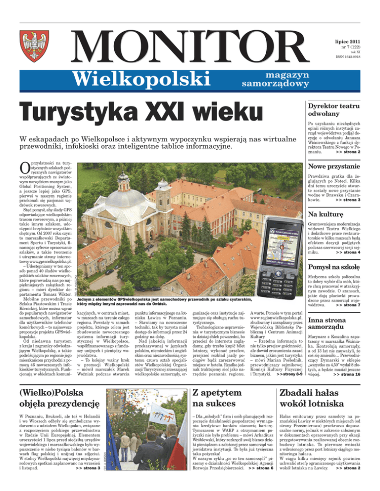lipiec 2011 nr 7 (122) rok XI ISSN 1642-0918 Turystyka XXI wieku Dyrektor teatru odwołany W eskapadach po Wielkopolsce i aktywnym wypoczynku wspierają nas wirtualne przewodniki, infokioski oraz inteligentne tablice informacyjne. O Nowe przystanie Prawdziwa gratka dla żeglujących po Noteci. Kilka dni temu uroczyście otwarte zostały nowe przystanie wodne w Drawsku i Czarnkowie. >> strona 3 Na kulturę Gruntowniejsza modernizacja widowni Teatru Wielkiego i dodatkowe prace restauratorskie w kilku muzeach będą efektem decyzji podjętych podczas czerwcowej sesji sejmiku. >> strona 4 Pomysł na szkołę Medyczna szkoła policealna to dobry wybór dla osób, które chcą pracować w atrakcyjnym zawodzie. O szansach, jakie dają placówki prowadzone przez samorząd województwa. >> strona 7 FOT. M. KULECZKA przydatności na turystycznych szlakach podręcznych nawigatorów współpracujących ze światowym narzędziem znanym jako Global Positioning System, a jeszcze lepiej jako GPS, pierwsi w naszym regionie przekonali się pasjonaci wędrówek rowerowych. Stąd pomysł, aby ślady GPS odpowiadające wielkopolskim trasom rowerowym, a później także innym szlakom, udostępnić bezpłatnie wszystkim chętnym. Od 2007 roku czyni to marszałkowski Departament Sportu i Turystyki, finansując cyfrowe opracowanie szlaków, a także tworzenie i utrzymanie strony internetowej www.gpswielkopolska.pl. – Udostępniamy w ten sposób ponad 40 śladów wielkopolskich szlaków rowerowych, które poprowadzą nas po najpiękniejszych zakątkach regionu – mówi dyrektor departamentu Tomasz Wiktor. Mobilne przewodniki po Szlaku Piastowskim i Trasie Kórnickiej, które można wgrać do popularnych nawigatorów samochodowych, informator dla użytkowników telefonów komórkowych – to najnowsze propozycje projektu GPSwielkopolska. Od niedawna turystom z kraju i zagranicy odwiedzającym Wielkopolskę, a także podróżującym po regionie jego mieszkańcom przychodzi z pomocą 46 nowoczesnych infokiosków turystycznych. Funkcjonują w obiektach komuni- Po uzyskaniu niezbędnych opinii różnych instytucji zarząd województwa podjął decyzję o odwołaniu Janusza Wiśniewskiego z funkcji dyrektora Teatru Nowego w Poznaniu. >> strona 2 Jednym z elementów GPSwielkopolska jest samochodowy przewodnik po szlaku cysterskim, który między innymi zaprowadzi nas do Owińsk. kacyjnych, w centrach miast, w muzeach na terenie całego regionu. Powstały w ramach projektu, którego celem jest zbudowanie nowoczesnego systemu informacji turystycznej w Wielkopolsce, współfinansowanego z funduszy unijnych i pieniędzy województwa. – To kolejny ważny krok w promocji Wielkopolski – mówił marszałek Marek Woźniak podczas otwarcia punktu informacyjnego na lotnisku Ławica w Poznaniu. – Stawiamy na nowoczesne techniki, tak by turysta miał dostęp do informacji przez 24 godziny na dobę. Nad jakością informacji przekazywanej w językach polskim, niemieckim i angielskim oraz niezawodnością systemu czuwa sztab specjalistów Wielkopolskiej Organizacji Turystycznej zrzeszającej wielkopolskie samorządy, or- ganizacje oraz instytucje zajmujące się obsługą ruchu turystycznego. Technologiczne usprawnienia w turystycznym biznesie to dzisiaj chleb powszedni, bo przecież do internetu zaglądamy, gdy trzeba kupić bilet lotniczy, wykonać przelew, przejrzeć rozkład jazdy pociągów bądź zarezerwować miejsce w hotelu. Rzadko jednak traktujemy sieć jako narzędzie poznania regionu. A warto. Pomoże w tym portal www.regionwielkopolska.pl, zbudowany i zarządzany przez Wojewódzką Bibliotekę Publiczną i Centrum Animacji Kultury. – Rzetelna informacja to nie tylko przejaw gościnności, ale dowód zrozumienia zasad biznesu, jakim jest turystyka – mówi Marian Poślednik, przewodniczący sejmikowej Komisji Kultury Fizycznej i Turystyki. >>strony 8-9 Inna strona samorządu Marynarz z Koszalina zapatrzony w marszałka Woźniaka. Kontrolują samorządy, a od 13 lat nie zauważyli, że coś się zmieniło… Przewodniczący Dymarski w sklepie „wszystko za 4,50” wydał 8 złotych, a będzie musiał jeszcze więcej. >> strona 16 Z apetytem na sukces Zbadali hałas wokół lotniska W Poznaniu, Brukseli, ale też w Holandii i we Włoszech odbyły się symboliczne wydarzenia z udziałem Wielkopolan, związane z rozpoczęciem polskiego przewodnictwa w Radzie Unii Europejskiej. Elementem uroczystości 1 lipca przed siedzibą urzędów wojewódzkiego i marszałkowskiego było wypuszczenie w niebo tysiąca balonów w barwach flag polskiej i unijnej (na zdjęciu). W stolicy Wielkopolski najwięcej międzynarodowych spotkań zaplanowano na wrzesień i listopad. >> strona 3 – Dla „młodych” firm i osób planujących rozpoczęcie działalności gospodarczej wymagania kredytowe banków stanowią barierę. Tymczasem w WARP z otrzymaniem pożyczki nie było problemu – mówi Arkadiusz Wróblewski, który rozkręcił swój biznes dzięki pieniądzom z założonej przez samorząd województwa instytucji. To była już tysięczna taka pożyczka! W naszym cyklu „po co ten samorząd?” piszemy o działalności Wielkopolskiej Agencji Rozwoju Przedsiębiorczości. >> strona 6 Hałas emitowany przez samoloty na poznańskiej Ławicy w niektórych miejscach (od strony Przeźmierowa) przekracza dopuszczalne normy, jednak w zakresie założonym w dokumentach opracowanych przy okazji przygotowywania realizowanej obecnie rozbudowy lotniska. To pierwsze wnioski z wdrożonego przez port lotniczy ciągłego monitoringu hałasu. W ciągu kilku miesięcy sejmik powinien uchwalić strefę ograniczonego użytkowania wokół lotniska na Ławicy. >> strona 2 FOT. A. BOIŃSKI (Wielko)Polska objęła prezydencję 2 Monitor Wielkopolski | lipiec 2011 www.monitorwielkopolski.pl aktualności na wstêpie Poznański Czerwiec 1956 – ludzka tragedia i duma – Poznańskie Krzyże są dowodem ludzkiej tragedii, ale i naszą dumą, bo to tu po 