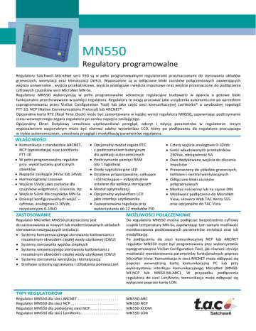 MN550 Regulatory programowalne Regulatory Satchwell MicroNet serii 550 są w pełni programowalnymi regulatorami przeznaczonymi do sterowania układów grzewczych, wentylacji oraz klimatyzacji (AHU). Wyposażone są w odłączane bloki zacisków połączeniowych zawierających wejścia uniwersalne , wyjścia przekaźnikowe, wyjścia analogowe i wejścia impulsowe oraz wejście przeznaczone do podłączenia cyfrowych czujników serii MicroNet MN‐Sx. Regulatory MN550 wykorzystują w pełni programowalne sekwencje regulacyjne budowane w oparciu o gotowe bloki funkcjonalne przechowywane w pamięci regulatora. Regulatory te mogą pracować jako urządzenia autonomiczne po uprzednim zaprogramowaniu przez VisiSat Configuration Tool) lub jako część sieci komunikacyjnej LonWorks® o swobodnej topologii FTT‐10, NCP (Native Communications Protocol) lub ARCNET®. Opcjonalna karta RTC (Real Time Clock) może być zamontowana w każdej wersji regulatora MN550, zapewniając podtrzymanie czasu wewnętrznego zegara regulatora po zaniku napięcia zasilającego. Opcjonalny Ekran Dotykowy umożliwia użytkownikowi przegląd, odczyt i edycję parametrów w regulatorze. Innym wyposażeniem opcjonalnym może być również zdalny wyświetlacz LCD, który po podłączeniu do regulatora pracującego w trybie autonomicznym, umożliwia przegląd i modyfikację parametrów regulatora. WŁAŚCIWOŚCI • Komunikacja z standardzie ARCNET, NCP (optoizolacja) oraz LonWorks FTT‐10 • W pełni programowalny regulator przy wykorzystaniu graficznych obiektów • Napięcie zasilające 24Vac lub 24Vdc • Harmonogramy czasowe • Wyjście 15Vdc jako zasilanie dla czujników wilgotności, ciśnienia, itp. • Wejście S‐link dla czujników MN‐Sx • Dziesięć konfigurowalnych wejść – cyfrowe, analogowe 0‐10Vdc, rezystancyjne 0‐10kΩ • Opcjonalny moduł zegara RTC z podtrzymaniem bateryjnym dla aplikacji autonomicznych • Podtrzymanie pamięci RAM (do 1 tygodnia) • Diody sygnalizacyjne LED • Działanie proporcjonalne, całkujące i różniczkujące – indywidualnie ustalane dla aplikacji sterujących • Moduł optymalizacji • Opcjonalny wyświetlacz LCD jako interfejs użytkownika • Zaawansowana regulacja przy wykorzystaniu do 12 modułów PID • Cztery wyjścia analogowe 0‐10Vdc • Sześć wbudowanych przekaźników 230Vac, obciążalność 5A • Dwa dedykowane wejścia do zliczania impulsów • Przeznaczony do układów grzewczych, kotłowni i central wentylacyjnych • Odłączane bloki zacisków połączeniowych • Montaż naścienny lub na szynie DIN • Możliwość podłączenia do MicroNet View, serwera Web TAC Xenta 555 oraz opcjonalne do TAC Vista ZASTOSOWANIE MOŻLIWOŚCI POŁĄCZENIOWE Regulator MicroNet MN550 przeznaczony jest do zastosowania w nowych lub modernizowanych układach sterowania następujących instalacji: • Systemy kompensacyjnego sterowania kotłowniami z niezależnym obwodem ciepłej wody użytkowej (CWU) • Systemy sterowania węzłów cieplnych • Systemy sekwencyjnego sterowania kotłowniami z niezależnym obwodem ciepłej wody użytkowej (CWU) • Systemy sterowania wentylacją i klimatyzacją • Strefowe systemy ogrzewania i chłodzenia pomieszczeń Do regulatora MN550 można podłączyć bezpośrednio cyfrowy czujnik temperatury MN‐Sx, zapewniając tym samym możliwość monitorowania podstawowych parametrów instalacji oraz ich modyfikację. Po podłączeniu do sieci komunikacyjnej NCP lub ARCNET regulator MN550 może być programowany przy wykorzystaniu oprogramowania VisiSat Configuration Tool, jak również istnieje możliwość monitorowania parametrów funkcjonalnych poprzez MicroNet View. Komunikacja w sieci ARCNET może odbywać się poprzez wewnętrzną kartę komunikacyjną PC lub przy wykorzystaniu interfejsu komunikacyjnego MicroNet (MN50‐ MI‐NCP lub MN50‐MI‐ARC). W przypadku podłączenia regulatora do sieci LonWorks, komunikacja może odbywać się wyłącznie poprzez kartę LON. TYPY REGULATORÓW Regulator MN550 dla sieci ARCNET . . . . . . . . . . . . . . . . . . . . Regulator MN550 dla sieci NCP . . . . . . . . . . . . . . . . . . . . . . . Regulator MN550 dla podwójnej sieci NCP. . . . . . . . . . . . . . . . Regulator MN550 dla sieci LonWorks . . . . . . . . . . . . . . . . . . MN550‐ARC MN550‐NCP MN550‐XCOM MN550‐LON DANE TECHNICZNE Zasilanie . . . . . . . . . . . . . . . . . . . . . . . . . . . . . . . . Maksymalny pobór mocy . . . . . . . . . . . . . . . . . . Zabezpieczenie . . . . . . . . . . . . . . . . .. . . . . . . . . . Temperatura otoczenia Transport i składowanie . . . . . . . . . . . . . . . . . . . Działanie . . . . . . . . . . . . . . . . . . . . . . . . . . . . . . . . Wilgotność Działanie i składowanie . . . . . . . . . . . . . . . . . . . . Obudowa . . . . . . . . . . . . . . . . . . . . . . . . . . . . . . . Stopień ochrony . . . . . . . . . . . . . . . . . . . . . . . . . Wymiary i ciężar . . . . . . . . . . . . . . . . . . . . . . . . . Montaż . . . . . . . . . . . . . . . . . . . . . . . . . . . . . . . . . Zaciski podłączeniowe . . . . . . . . . . . . . . . . . . . . Opcjonalny moduł zegara RTC Dokładność przy +25°C . . . . . . . . . . . . . . . . . . . . Bateria . . . . . . . . . . . . . . . . . . . . . . . . . . . . . . . . . Komunikacja NCP . . . . . . . . . . . . . . . . . . . . . . . . . . . . . . . . . . . . ARCNET. . . . . . . . . . . . . . . . . . . . . . . . . . . . . . . . . LonWorks . . . . . . . . . . . . . . . . . . . . . . . . . . . . . . . Zgodność z dokumentami normatywnymi CE . . . . . . . . . . . . . . . . . . . . . . . . . . . . . . . . . . . . . EMC . . . . . . . . . . . . . . . . . . . . . . . . . . . . . . . . . . . LDV . . . . . . . . . . . . . . . . . . . . . . . . . . . . . . . . . . . . 24Vac, 50/60Hz (z transformatora zgodnego z EN 61558), lub 24Vdc. 12VA przy 24Vac, 6.5W przy 24Vdc Bezpiecznik 1A ‐20°C do +70°C 0°C do +50°C (przy z