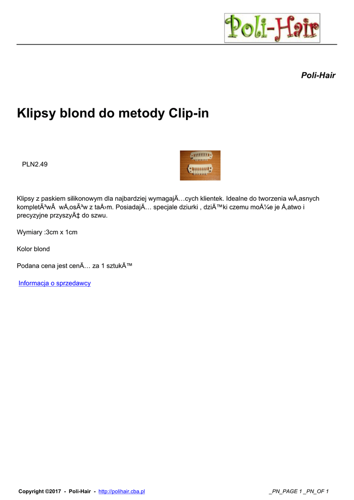 Poli-Hair Klipsy blond do metody Clip-in PLN2.49 Klipsy z paskiem silikonowym dla najbardziej wymagajÄ…cych klientek. Idealne do tworzenia wÅ‚asnych kompletów wÅ‚osów z taÅ›m. PosiadajÄ… specjale dziurki , dziÄ™ki czemu może je Å‚atwo i precyzyjne przyszyć do szwu. Wymiary :3cm x 1cm Kolor blond Podana cena jest cenÄ… za 1 sztukÄ™ Informacja o sprzedawcy Copyright ©2017 - Poli-Hair - http://polihair.cba.pl _PN_PAGE 1 _PN_OF 1