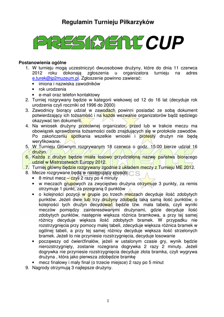 Regulamin Turnieju Piłkarzyków CUP Postanowienia ogólne 1. W turnieju mogą uczestniczyć dwuosobowe drużyny, które do dnia 11 czerwca 2012 roku dokonają zgłoszenia u organizatora turnieju na adres [email protected]. Zgłoszenie powinno zawierać: • imiona i nazwiska zawodników • rok urodzenia • e-mail oraz telefon kontaktowy 2. Turniej rozgrywany będzie w kategorii wiekowej od 12 do 16 lat (decyduje rok urodzenia czyli roczniki od 1996 do 2000) 3. Zawodnicy biorący udział w zawodach powinni posiadać ze sobą dokument potwierdzający ich tożsamość i na każde wezwanie organizatorów bądź sędziego okazywać ten dokument. 4. Na wniosek drużyny przeciwnej organizator, przed lub w trakcie meczu ma obowiązek sprawdzenia tożsamości osób znajdujących się w protokole zawodów. Po zakończeniu spotkania wszelkie wnioski i protesty drużyn nie będą weryfikowane. 5. W Turnieju Głównym rozgrywanym 18 czerwca o godz. 15:00 bierze udział 16 drużyn. 6. Każda z drużyn będzie miała losowo przydzieloną nazwę państwa biorącego udział w Mistrzostwach Europy 2012. 7. Turniej główny będzie rozgrywany zgodnie z układem meczy z Turnieju ME 2012. 8. Mecze rozgrywane będą w następujący sposób: • 8 minut mecz – czyli 2 razy po 4 minuty • w meczach grupowych za zwycięstwo drużyna otrzymuje 3 punkty, za remis otrzymuje 1 punkt, za przegraną 0 punktów • o kolejności pozycji w grupie po trzech meczach decyduje ilość zdobytych punktów. Jeżeli dwie lub trzy drużyny zdobędą taką samą ilość punktów, o kolejności tych drużyn decydować będzie tzw. mała tabela, czyli wyniki meczów pomiędzy zainteresowanymi drużynami, gdzie decyduje ilość zdobytych punktów, następnie większa różnica bramkowa, a przy tej samej różnicy decyduje większa ilość zdobytych bramek. W przypadku nie rozstrzygnięcia przy pomocy małej tabeli, zdecyduje większa różnica bramek w ogólnej tabeli, a przy tej samej różnicy decyduje większa ilość strzelonych bramek. Jeżeli to nie przyniesie rozstrzygnięcia, decyduje losowanie • począwszy od ćwierćfinałów, jeżeli w ustalonym czasie gry, wynik będzie nierozstrzygnięty, zostanie rozegrana dogrywka 2 razy 2 minuty. Jeżeli dogrywka nie przyniesie rozstrzygnięcia decyduje złota bramka, czyli wygrywa drużyna , która jako pierwsza zdobędzie bramkę • mecz finałowy i mały finał (o trzecie miejsce) 2 razy po 5 minut 9. Nagrody otrzymują 3 najlepsze drużyny. 1 I. Drużyny 1. Drużyna składa się z dwóch zawodników. 2. Zawodnika wpisanego jako pierwszego uznaje się za kapitana. 3. Za wszystkie sprawy formalne dotyczące drużyny odpowiedzialny jest kapitan drużyny. 4. Ilość drużyn w Turnieju Głównym jest ograniczona do 16. 5. Jeżeli ilość zgłoszonych drużyn do turnieju będzie większa niż 16, dnia 12 czerwca na stronie www.jp2muzeum.pl zostanie umieszczona informacja o terminie eliminacji. 6. Ze względu na amatorski charakter turnieju, nie mogą w nim brać udziału osoby sklasyfikowane w aktualnym rankingu Polskiego Związku Futbolu Stołowego. II. Przepisy gry w piłkarzyki. 1. Rozpoczęcie gry Jeżeli drużyna nie rozpocznie gry w ciągu 3 minut od trzeciego wyczytania, przegrywa mecz walkowerem 2.Mecz 1. Mecze rozgrywane są jedną piłką 2. Przed rozpoczęciem meczu losowane są strony, na których grają drużyny (rzut monetą) 3. Mecz uważa się za rozpoczęty w momencie, gdy wrzucona przez sędziego piłka dotknie dwóch różnych piłkarzyków bądź piłkarzyka i bandy 3. Bramki – zdobycie punktu 1. Bramka zostaje zdobyta w momencie wpadnięcia piłki do bramki przeciwnika, 2. Bramka nie zostaje uznana jeśli: • piłka wypadnie z bramki, • zostanie zdobyta w wyniku wykonania obrotu przekraczającego 360 stopni, • zostanie strzelona z pierwszej piłki (przed otwarciem stołu). 4. Martwa Piłka 1. Za martwą piłkę uznaje się piłkę będącą poza zasięgiem piłkarzyków obu drużyn. 2. Poruszanie stołem, uderzanie w drążki lub ich wyginanie jest karane żółtą kartką. 3. Martwa piłka znajdująca się pomiędzy bramkarzem a linią obrońców, serwowana jest z linii obrony, w której się znajduje gracz lub sędzia. 4. Martwa piłka znajdująca się w innym miejscu, niż opisane w punkcie c) jest serwowana z linii pomocy drużyny, która ostatnia serwowała od środka pola. 5. Upomnienia 1. Ostrzeżenie – pierwsze ostrzeżenie (od momentu przyznania pierwszego ostrzeżenia do zakończenia meczu, przy stole obecny jest organizator/sędzia). 2. Żółta kartka – jako drugie ostrzeżenie, skutkuje przyznaniem bramki drużynie przeciwnej. 3. Żółtą kartkę zawodnik może w czasie jednego meczu otrzymać maksymalnie 2 razy. 4. Trzecia żółta kartka automatycznie skutkuje kartką czerwoną, czyli dyskwalifikacją z dalszej części meczu. 5. Czerwona kartka – przyznawana za złośliwe i powtarzające się łamanie regulaminu oraz reguł fair play, wyklucza zawodnika z udziału w dalszej części meczu. 2 6. Mecz kontynuuje drugi zawodnik. 7. Otrzymanie czerwonej kartki przez drugiego zawodnika wyklucza drużynę z dalszej gry w turnieju. 8. W PRZYPADKU RAŻĄCEGO ŁAMANIA ZASAD REGULAMINU SĘDZIA MOŻE WYKLUCZYĆ DRUŻYNĘ Z DALSZYCH ROZGRYWEK TURNIEJU. 6. Ściana 1. Jeżeli przeciwnik jest w posiadaniu piłki, zabronione jest uderzanie w bandę w szczególności zabronione jest szybkie, regularne uderzanie w jedną lub naprzemiennie w obie bandy, także wówczas, gdy przeciwnik nie jest w posiadaniu piłki. 2. W przypadku łamania tego zakazu sędzia może ukarać zawodnika lub drużynę żółtą kartką. 7. Zmiany pozycji 1. Podczas meczu jest dozwolona zmiana pozycji (napastnik/obrońca) w dowolnym momencie meczu. pomiędzy zawodnikami 8. Kręcenie drążkiem (motylki) 2. Obrót piłkarzyka o więcej niż 360 stopni przed lub po uderzeniu w piłkę jest zabroniony. 3. Bramka zdobyta z naruszeniem przepisu a) nie jest uznawana, a grę r