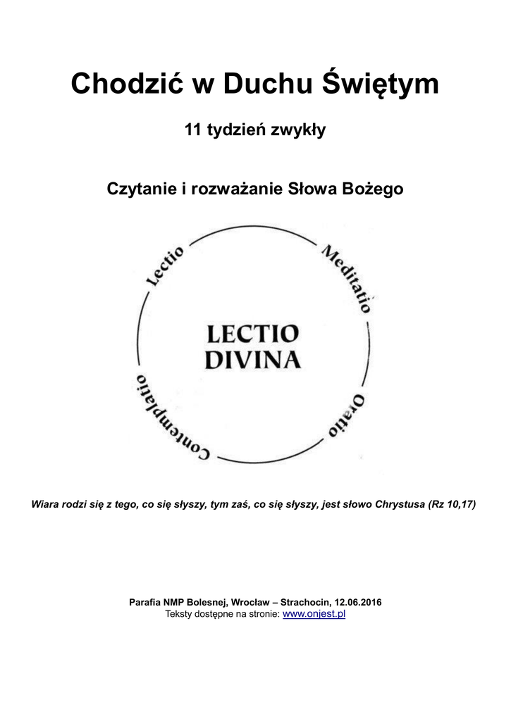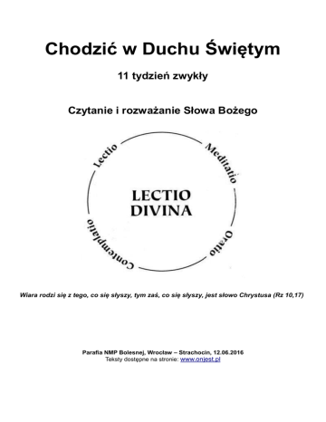 Chodzić w Duchu Świętym 11 tydzień zwykły Czytanie i rozważanie Słowa Bożego Wiara rodzi się z tego, co się słyszy, tym zaś, co się słyszy, jest słowo Chrystusa (Rz 10,17) Parafia NMP Bolesnej, Wrocław – Strachocin, 12.06.2016 Teksty dostępne na stronie: www.onjest.pl Rysunek tygodnia: Opracowanie rozważań: Jolanta Prokopiuk, Łukasz Kneć, Wojciech Doliński, Monika Mosior, Jolanta Mikos, Krzysztof Mikos, Marcin Kusio, Maria Kusio, Przemek Rożnowski, Ewelina Rożnowska Korekta: Jerzy Prokopiuk Rysunek: Marta Stańco Asysta kościelna: ks. Wojciech Jaśkiewicz Aplikacja mobilna Android: Tomek Romanowski Niniejsze rozważania przygotowują osoby ze wspólnoty „On Jest”, Ruchu Światło – Życie Czytania zamieszczone w aneksie: www.liturgia.wiara.pl Lectio divina – metoda osobistego studium Pisma Świętego Mnisi znali dwa sposoby medytacji Słowa Bożego: ruminatio – przetrawianie Słowa Bożego poprzez jego ciągłe powtarzanie oraz lectio divina – Bożą lekturę, w której chodziło o to, aby wszystkie słowa Biblii rozumieć jako drogę do Boga, jako opis drogi duchowej. Kluczowe jest tu pytanie: kim jestem, co jest tajemnicą mojego życia, kim i czym stałem się dzięki Jezusowi Chrystusowi? Kiedy bowiem poprzez medytację poczuję, kim jestem, zmieni się także moje działanie w świecie. Kilka uwag o miejscu modlitwy, czasie oraz pozycji modlitewnej. 1. Miejsce – idealne to kościół czy kaplica z wystawionym Najświętszym Sakramentem. W praktyce będzie to każde miejsce, w którym znajdziemy choć odrobinę wyciszenia. 2. Czas – przynajmniej kwadrans. Dobrze jeśli będzie to pół godziny. Pora dnia nie jest istotna, ważne tylko, byśmy byli przytomni i w czasie modlitwy nie zasnęli. 3. Pozycja w czasie modlitwy – godna i wygodna. Można klęczeć, siedzieć na małej ławeczce, można też zwyczajnie usiąść na wygodnym krześle przy stole. Przebieg lectio divina Istotą tej metody jest jej podział na kilka części: 1. Czytanie (lectio), 2. Medytację (meditatio), 3. Modlitwę (oratio) i trwanie przed Bogiem (contemplatio). 4. Działanie (actio) Całość powinna być poprzedzona chwilą wyciszenia, skupienia, prośbą skierowaną do Ducha Świętego o dobre owoce. Na zakończenie powinniśmy podziękować Bogu oraz dokonać refleksji nad naszą modlitwą – jak się czuliśmy, co było dobre w tej modlitwie a co należałoby w niej poprawić w przyszłości. Lectio – Czytaj z wiarą i uważnie święty tekst, jak gdyby dyktował go dla ciebie Duch Święty. Wybieramy dłuższy fragment tekstu. Nie zakładamy, że przeczytamy go w całości. Może się zdarzyć, że już pierwszy werset będzie tym fragmentem nad którym powinniśmy zatrzymać się dłużej. Czytam Pismo Święte powoli i uważnie, nie po to, by pomnożyć swoją wiedzę, lecz by spotkać Boga w Jego Słowie. W czytaniu chodzi bowiem o znalezienie takiego fragmentu (zwykle będzie to jeden werset), który nas poruszy. To poruszenie może mieć bardzo różny charakter. Może to być ciekawość, niezrozumienie, pociecha, piękno, niepokój. Poruszenie jest świadectwem, że ten werset jest dla nas osobiście ważny. Bardzo ważną informacją jest złość lub agresja rodząca się podczas czytania Słowa Bożego. Oznacza ona bowiem, że Jezus w Słowie Bożym dotyka jakiejś nieuporządkowanej dziedziny naszego życia. Jest bardzo istotne zwrócenie uwagi na uczucia, które nam towarzyszą. Nie mamy wpływu na uczucia, które się rodzą. Są ważne ponieważ, ukazują nam one stan naszego serca. Nie ma uczuć dobrych i złych, ponieważ są one obojętne moralnie. Jeżeli rodzi się uczucie zazdrości lub niechęci to nie jest to grzechem. Materią grzechu będzie dopiero nasza odpowiedź na to uczucie. Znalezienie tekstu, który Cię porusza jest sygnałem, że kończy się etap lectio. Meditatio – Staraj się zrozumieć dogłębnie tekst. Pytaj siebie: „Co Bóg mówi do mnie?”. Pierwotne, łacińskie znaczenie tego słowa to „powtarzanie”. W tej części koncentrujemy się na znalezionym urywku. Czytamy go wielokrotnie, powoli, jakby smakując – całość wersetu lub jego fragmenty. Czytając możemy akcentować różne części i wyrazy wersetu. Prawdopodobnie nauczymy się w ten sposób wersetu na pamięć. Powtarzajmy go zatem także w myśli – może nam pomóc zamknięcie oczu. Angażujmy na tym etapie nie tylko rozum ale także i serce. Można się zastanowić, dlaczego ten fragment mnie zainteresował, pytać się co ten fragment mi mówi, objawia, komunikuje. Ważne jest aby medytować tylko jeden fragment. Jeśli poruszyło cię więcej fragmentów, zatrzymaj się na pierwszym, pozostałe w tej medytacji cię nie interesują. Oratio – Teraz ty mów do Boga a jeśli zabraknie Ci słów to trwaj przed nim bez słów (contemplatio). Na pewnym etapie medytacji zamienia się ona w modlitwę. Będzie ona miała spontaniczny charakter. Otwórz przed Bogiem serce, aby mówić Mu o przeżyciach, które rodzi w tobie słowo. Módl się prosto i spontanicznie. Czasami będzie to nasza aktywność, ale możemy też być „porwani” przez Boże natchnienie. Wtedy modlitwa stanie się bardziej działaniem Boga w nas niż naszym działaniem. Trudno przewidzieć, co przyniesie modlitwa, jaki dokładnie charakter i kierunek przybierze. Może to być zarówno przebłaganie, prośba jak i dziękczynienie i uwielbienie. Może mieć także charakter krótkiej, żarliwej modlitwy, proszącej Boga, by ukoił moja tęsknotę, by pozwolił się doświadczyć i ujrzeć. Na lub po etapie oratio - Twojej modlitwy do Boga, którą wzbudziło rozważanie danego fragmentu - może przyjść czas, że braknie Ci słów. Trwaj wtedy przy Bogu bez słów - wtedy modlisz się samą swoją obecnością a Duch Święty działający w Tobie będzie kierował do Boga taką modlitwę, która Jemu się podoba: "Podobnie także Duch przychodzi z pomocą naszej słabości