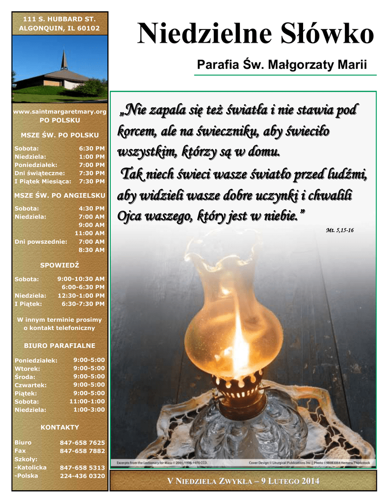 111 S. HUBBARD ST. ALGONQUIN, IL 60102 Niedzielne Słówko Parafia Św. Małgorzaty Marii www.saintmargaretmary.org PO POLSKU MSZE ŚW. PO POLSKU Sobota: Niedziela: Poniedziałek: Dni świąteczne: I Piątek Miesiąca: 6:30 1:00 7:00 7:30 7:30 PM PM PM PM PM MSZE ŚW. PO ANGIELSKU Sobota: Niedziela: Dni powszednie: 4:30 7:00 9:00 11:00 7:00 8:30 PM AM AM AM AM AM „Nie zapala się też światła i nie stawia pod korcem, ale na świeczniku, aby świeciło wszystkim, którzy są w domu. Tak niech świeci wasze światło przed ludźmi, aby widzieli wasze dobre uczynki i chwalili Ojca waszego, który jest w niebie.” Mt. 5,15-16 SPOWIEDŹ Sobota: Niedziela: I Piątek: 9:00-10:30 AM 6:00-6:30 PM 12:30-1:00 PM 6:30-7:30 PM W innym terminie prosimy o kontakt telefoniczny BIURO PARAFIALNE Poniedziałek: Wtorek: Środa: Czwartek: Piątek: Sobota: Niedziela: 9:00-5:00 9:00-5:00 9:00-5:00 9:00-5:00 9:00-5:00 11:00-1:00 1:00-3:00 KONTAKTY Biuro Fax Szkoły: -Katolicka -Polska 847-658 7625 847-658 7882 847-658 5313 224-436 0320 V NIEDZIELA ZWYKŁA – 9 LUTEGO 2014 Niedzielne Słówko Od Proboszcza „Wy jesteście solą ziemi. Lecz jeśli sól utraci swój smak , czymże ją posolić?.... Wy jesteście światłem świata.” Drodzy Przyjaciele! Odkrywca Troi, Henry Schliemann, prowadząc w XIX wieku wykopaliska na terenach dzisiejszej Turcji, w swoim dzienniku napisał o Grekach-chrześcijanach, którzy nie chcieli pracować w niedzielę i podczas świąt religijnych: „Nawet gdybym im płacił tysiąc franków za godzinę, ludzie ci – choć są biedni i ochoczo podejmują każdą pracę – nie daliby się przekonać do pracy podczas świąt, nawet jeśli przypada akurat święto najpośledniejszego ze świętych”. Schliemann nie krył zdziwienia, że nie udało mu się tych ludzi zmotywować pieniędzmi do pracy w niedzielę. Dla wielkiego odkrywcy był to szok, że ktoś może kierować się klarownymi zasadami i, że nawet duże pieniądze nie potrafią ich złamać. A co z naszym osobistym świadectwem wiary. Czy jesteśmy światłem, czy staramy się być solą? Współcześnie, na ziemi co trzy minuty jest okrutnie, męczeńsko zabijany chrześcijanin za dawanie świadectwa wiary. Rocznie ginie w ten sposób sto siedemdziesiąt tysięcy chrześcijan. Dlaczego? Na jakiej zasadzie? Jedynie na tej, że są światłem świata, a świat, który chce żyć w ciemności, nie może tego światła znieść. Na tej zasadzie, że są solą ziemi i chcą nadać światu i jego życiu odpowiedni smak. Świat czuje, jak niezwykły jest to smak, ale nie stać go na wysiłek, aby w swoje życie ten smak wprowadzić, dlatego zabija. To jest bardzo ważne. Nasze świadectwo przynależności do Chrystusa na samym początku może być bardzo niedoskonałe, ale my identyfikujemy się z Chrystusem i On o tym wie. I świat też to rozpoznaje, i to wystarcza, abyśmy się stali przedmiotem niezwykle zaciekłego ataku. Ale musimy pamiętać, że moc świadectwa o światłości i o soli nie należy do nas, ani nie dzieje się naszą mocą. To jest światło Chrystusa i to jest smak Chrystusa. Trzeba, abyśmy się starali, by w żaden sposób tego światła nie zaciemniać, a dzieje się to zawsze przez grzech. Musimy robić wszystko, by w żaden sposób tego smaku nie psuć. Niech nam w tym zadaniu pomoże modlitwa św. Franciszka z Asyżu: O Panie, uczyń z nas narzędzia Twojego pokoju, Abyśmy siali miłość tam, gdzie panuje nienawiść; Wybaczenie tam, gdzie panuje krzywda; Jedność tam, gdzie panuje zwątpienie; Nadzieję tam, gdzie panuje rozpacz; Światło tam, gdzie panuje mrok; Radość tam, gdzie panuje smutek. Spraw abyśmy mogli, Nie tyle szukać pociechy, co pociechę dawać; Nie tyle szukać zrozumienia, co rozumieć; Nie tyle szukać miłości, co kochać; Albowiem dając, otrzymujemy; Wybaczając, zyskujemy przebaczenie, A umierając, rodzimy się do wiecznego życia. Przez Chrystusa Pana naszego. O. Piotr Sarnicki OFM Conv Słowa Ewangelii według św. Mateusza 5,13 - 16 Jezus powiedział do swoich uczniów: „Wy jesteście solą ziemi. Lecz jeśli sól utraci swój smak, czymże ją posolić? Na nic się już nie przyda, chyba na wyrzucenie i podeptanie przez ludzi. Wy jesteście światłem świata. Nie może się ukryć miasto położone na górze. Nie zapala się też światła i nie stawia pod korcem, ale na świeczniku, aby świeciło wszystkim, któ rzy są w domu. Tak niech świeci wasze światło przed ludźmi, aby widzieli wasze dobre uczynki i chwalili Ojca waszego, który jest w niebie”. Niedzielne Słówko Ogłoszenia W poniedziałek 10-go zapraszamy na Mszę św. o godzinie 7 i adorację. Po adoracji spotkanie biblijne. W przyszłą sobotę 15-go lutego spotkanie grupy młodzieżowej o 5 wieczorem i Msza Święta młodzieżowa o 6.30. Po Mszy zapraszamy na pączki. W sobotę 1-go marca organizujemy Bal Karna- wałowy dla dzieci. w biuletynie. Szczegółowe informacje Dzisiaj po Mszy Świętej mierzenie ciśnienia krwi. MYŚLI DNIA Światło nadaje światu jasność, sprawia, że mogę zrozumieć siebie - mówi ojciec Paweł Trzonek. Czyny człowieka powinny stać się światłem dla innych ludzi; takim, które doprowadzi ich do Boga. „Zamiast przeklinać ciemności, spróbuj zapalić chociażby maleńką świeczkę" - radzi mędrzec. ŚWIATOWY DZIEŃ MAŁŻEŃSTW Modlitwa o odrodzenie małżeństwa Panie, przedstawiam Ci nasze małżeństwo mojego męża (moją żonę) i mnie. Dziękuję, że nas połączyłeś, że podarowałeś nas sobie nawzajem i umocniłeś nasz związek swoim sakramentem. Dziękuję Ci za to, że kochamy się - choć niekoniecznie i nie zawsze potrafimy to okazać... Panie, w tej chwili nasze małżeństwo nie jest takie, jakim Ty chciałbyś je widzieć. Potrzebuje uzdrowienia. Jednak dla Ciebie, który kochasz nas oboje, nie ma rzeczy niemożliwych. Dlatego proszę Cię: o dar szczerej rozmowy, o "przemycie oczu", abyśmy spojrzeli na siebie oczami T