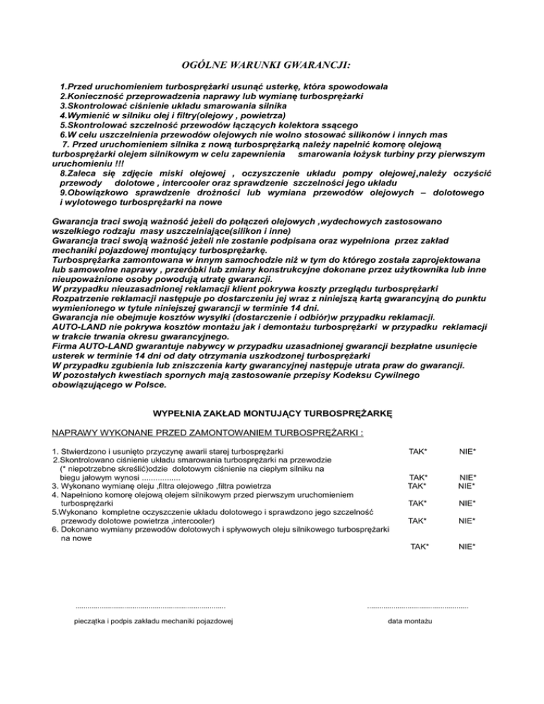 OGÓLNE WARUNKI GWARANCJI: 1.Przed uruchomieniem turbosprężarki usunąć usterkę, która spowodowała 2.Konieczność przeprowadzenia naprawy lub wymianę turbosprężarki 3.Skontrolować ciśnienie układu smarowania silnika 4.Wymienić w silniku olej i filtry(olejowy , powietrza) 5.Skontrolować szczelność przewodów łączących kolektora ssącego 6.W celu uszczelnienia przewodów olejowych nie wolno stosować silikonów i innych mas 7. Przed uruchomieniem silnika z nową turbosprężarką należy napełnić komorę olejową turbosprężarki olejem silnikowym w celu zapewnienia smarowania łożysk turbiny przy pierwszym uruchomieniu !!! 8.Zaleca się zdjęcie miski olejowej , oczyszczenie układu pompy olejowej,należy oczyścić przewody dolotowe , intercooler oraz sprawdzenie szczelności jego układu 9.Obowiązkowo sprawdzenie drożności lub wymiana przewodów olejowych – dolotowego i wylotowego turbosprężarki na nowe Gwarancja traci swoją ważność jeżeli do połączeń olejowych ,wydechowych zastosowano wszelkiego rodzaju masy uszczelniające(silikon i inne) Gwarancja traci swoją ważność jeżeli nie zostanie podpisana oraz wypełniona przez zakład mechaniki pojazdowej montujący turbosprężarkę. Turbosprężarka zamontowana w innym samochodzie niż w tym do którego została zaprojektowana lub samowolne naprawy , przeróbki lub zmiany konstrukcyjne dokonane przez użytkownika lub inne nieupoważnione osoby powodują utratę gwarancji. W przypadku nieuzasadnionej reklamacji klient pokrywa koszty przeglądu turbosprężarki Rozpatrzenie reklamacji następuje po dostarczeniu jej wraz z niniejszą kartą gwarancyjną do punktu wymienionego w tytule niniejszej gwarancji w terminie 14 dni. Gwarancja nie obejmuje kosztów wysyłki (dostarczenie i odbiór)w przypadku reklamacji. AUTO-LAND nie pokrywa kosztów montażu jak i demontażu turbosprężarki w przypadku reklamacji w trakcie trwania okresu gwarancyjnego. Firma AUTO-LAND gwarantuje nabywcy w przypadku uzasadnionej gwarancji bezpłatne usunięcie usterek w terminie 14 dni od daty otrzymania uszkodzonej turbosprężarki W przypadku zgubienia lub zniszczenia karty gwarancyjnej następuje utrata praw do gwarancji. W pozostałych kwestiach spornych mają zastosowanie przepisy Kodeksu Cywilnego obowiązującego w Polsce. WYPEŁNIA ZAKŁAD MONTUJĄCY TURBOSPRĘŻARKĘ NAPRAWY WYKONANE PRZED ZAMONTOWANIEM TURBOSPRĘŻARKI : 1. Stwierdzono i usunięto przyczynę awarii starej turbosprężarki 2.Skontrolowano ciśnienie układu smarowania turbosprężarki na przewodzie (* niepotrzebne skreślić)odzie dolotowym ciśnienie na ciepłym silniku na biegu jałowym wynosi ................. 3. Wykonano wymianę oleju ,filtra olejowego ,filtra powietrza 4. Napełniono komorę olejową olejem silnikowym przed pierwszym uruchomieniem turbosprężarki 5.Wykonano kompletne oczyszczenie układu dolotowego i sprawdzono jego szczelność przewody dolotowe powietrza ,intercooler) 6. Dokonano wymiany przewodów dolotowych i spływowych oleju silnikowego turbosprężarki na nowe .......................................................................... pieczątka i podpis zakładu mechaniki pojazdowej TAK* NIE* TAK* TAK* NIE* NIE* TAK* NIE* TAK* NIE* TAK* NIE* .................................................. data montażu