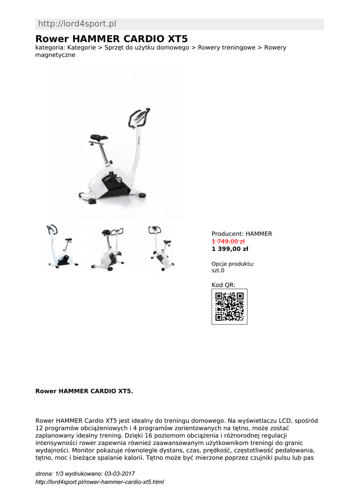 http://lord4sport.pl Rower HAMMER CARDIO XT5 kategoria: Kategorie > Sprzęt do użytku domowego > Rowery treningowe > Rowery magnetyczne Producent: HAMMER 1 749,00 zł 1 399,00 zł Opcje produktu: szt.0 Kod QR: Rower HAMMER CARDIO XT5. Rower HAMMER Cardio XT5 jest idealny do treningu domowego. Na wyświetlaczu LCD, spośród 12 programów obciążeniowych i 4 programów zorientowanych na tętno, może zostać zaplanowany idealny trening. Dzięki 16 poziomom obciążenia i różnorodnej regulacji intensywności rower zapewnia również zaawansowanym użytkownikom treningi do granic wydajności. Monitor pokazuje równolegle dystans, czas, prędkość, częstotliwość pedałowania, tętno, moc i bieżące spalanie kalorii. Tętno może być mierzone poprzez czujniki pulsu lub pas strona: 1/3 wydrukowano: 03-03-2017 http://lord4sport.pl/rower-hammer-cardio-xt5.html telemetryczny (do wyboru). Rower napędzany jest przez pasek rowkowy, a ok. 8 kg koło zamachowe, które jest regulowane przez układ hamulcowy z magnesem trwałym, zapewnia precyzyjną kontrolę obciążenia. Dla komfortowego treningu można kilkukrotnie regulować położenie siodełka i kierownicy. Dzięki wymiarom 113 x 54 x 133 cm (dł. x szer. x wys.) ergometr zajmuje mało miejsca i może być również użytkowany w małych mieszkaniach. Ćwicząc na rowerku HAMMER Cardio XT5 ukształtujesz, oraz ujędrnisz swoje ciało jak również poprawisz swoją wytrzymałość i wydajność. Trening na rowerku zapewnia: Szybkie i ukierunkowane wyniki treningowe Stałą redukcję tkanki tłuszczowe i wagi Idealne tonowanie ciała i ujędrnienie tkanki Ulepszoną witalność i motywację w życiu codziennym Funkcje komputera: Zakres regulacji mocy: 35-260 Watt Wyświetlane funkcje: Dystans, Czas, Prędkość, RPM, Ilość spalonych kalorii Pomiar pulsu poprzez sensory dotykowe Górna granica pulsu regulowana Pomiar tk. tłuszczowej Tętno recovery z Fitness Test Programy treningowe: 12 Wyświetlacz: standardowy Programy sterowane tętnem: 4 Kontrola wytrzymałości: komputerowa Ilość użytkowników: 1 Dane techniczne: Regulacja kierownicy i siodełka Rolki transportowe Wysokiej jakości łożyska System hamowania: magnetyczny System napędu: pas klinowy Przełożenie: 1:8 Waga koła zamachowego: 8 kg Kontrola obciążenia: niezależna Zasilanie: 230 V, 50 Hz Max.waga użytkownika: 130 kg Waga rowerka: 28 kg Wymiary: 101 x 55 x 133 cm Pozostałe informacje: Gwarancja 36 miesięcy Numer katalogowy: 4843 strona: 2/3 wydrukowano: 03-03-2017 http://lord4sport.pl/rower-hammer-cardio-xt5.html Paragon lub faktura vat strona: 3/3 wydrukowano: 03-03-2017 http://lord4sport.pl/rower-hammer-cardio-xt5.html
