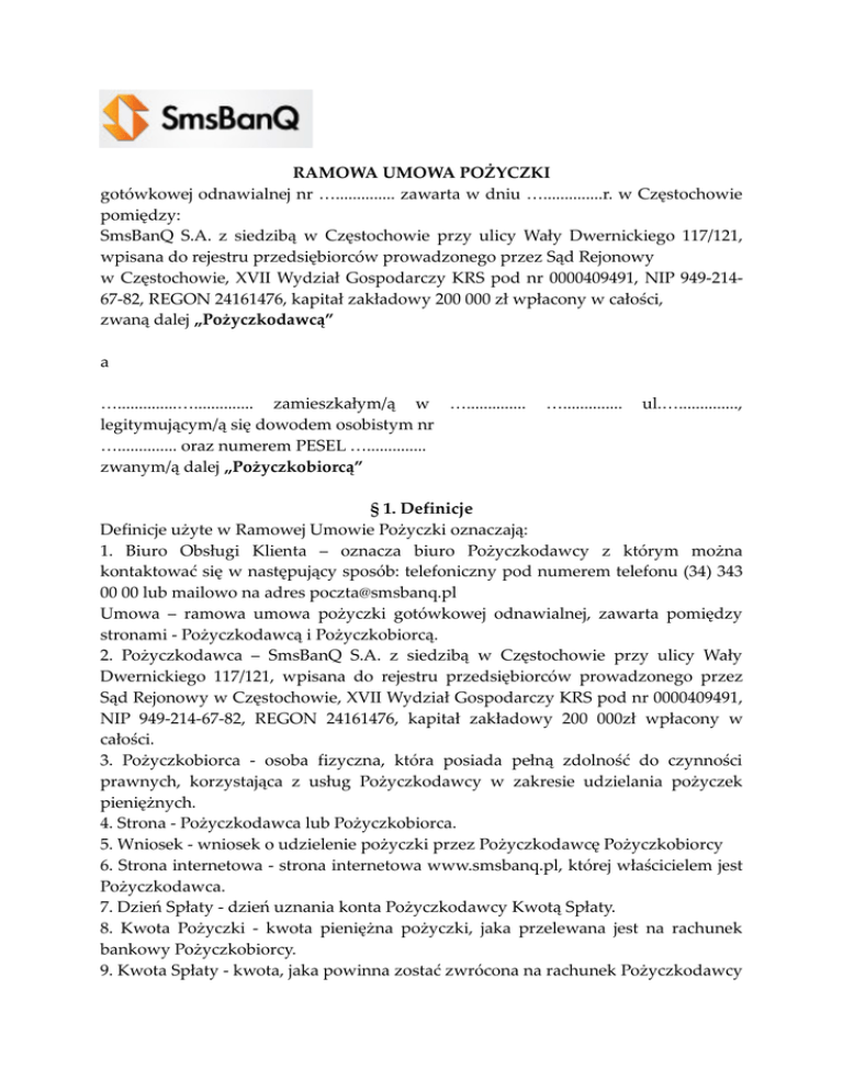 RAMOWA UMOWA POŻYCZKI gotówkowej odnawialnej nr ….............. zawarta w dniu …..............r. w Częstochowie pomiędzy: SmsBanQ S.A. z siedzibą w Częstochowie przy ulicy Wały Dwernickiego 117/121, wpisana do rejestru przedsiębiorców prowadzonego przez Sąd Rejonowy w Częstochowie, XVII Wydział Gospodarczy KRS pod nr 0000409491, NIP 949-21467-82, REGON 24161476, kapitał zakładowy 200 000 zł wpłacony w całości, zwaną dalej „Pożyczkodawcą” a …..............….............. zamieszkałym/ą w ….............. legitymującym/ą się dowodem osobistym nr ….............. oraz numerem PESEL ….............. zwanym/ą dalej „Pożyczkobiorcą” ….............. ul.….............., § 1. Definicje Definicje użyte w Ramowej Umowie Pożyczki oznaczają: 1. Biuro Obsługi Klienta – oznacza biuro Pożyczkodawcy z którym można kontaktować się w następujący sposób: telefoniczny pod numerem telefonu (34) 343 00 00 lub mailowo na adres [email protected] Umowa – ramowa umowa pożyczki gotówkowej odnawialnej, zawarta pomiędzy stronami - Pożyczkodawcą i Pożyczkobiorcą. 2. Pożyczkodawca – SmsBanQ S.A. z siedzibą w Częstochowie przy ulicy Wały Dwernickiego 117/121, wpisana do rejestru przedsiębiorców prowadzonego przez Sąd Rejonowy w Częstochowie, XVII Wydział Gospodarczy KRS pod nr 0000409491, NIP 949-214-67-82, REGON 24161476, kapitał zakładowy 200 000zł wpłacony w całości. 3. Pożyczkobiorca - osoba fizyczna, która posiada pełną zdolność do czynności prawnych, korzystająca z usług Pożyczkodawcy w zakresie udzielania pożyczek pieniężnych. 4. Strona - Pożyczkodawca lub Pożyczkobiorca. 5. Wniosek - wniosek o udzielenie pożyczki przez Pożyczkodawcę Pożyczkobiorcy 6. Strona internetowa - strona internetowa www.smsbanq.pl, której właścicielem jest Pożyczkodawca. 7. Dzień Spłaty - dzień uznania konta Pożyczkodawcy Kwotą Spłaty. 8. Kwota Pożyczki - kwota pieniężna pożyczki, jaka przelewana jest na rachunek bankowy Pożyczkobiorcy. 9. Kwota Spłaty - kwota, jaka powinna zostać zwrócona na rachunek Pożyczkodawcy (Kwota Pożyczki powiększona o prowizję i odsetki). 10. Monit - SMS-owe, e-mailowe, telefoniczne lub pisemne wezwanie Pożyczkobiorcy do zapłaty Kwoty Spłaty. 11. Doradca - pracownik Pożyczkodawcy. 12. Ustawa o ochronie niektórych praw konsumentów - ustawa z dnia 20 marca 2000 r. O ochronie niektórych praw konsumentów oraz o odpowiedzialności za szkodę wyrządzoną przez produkt niebezpieczny (Dz. U. z dnia 31 marca 2000 r. Nr 22 poz. 271). 13. Ustawa o kosztach sądowych w sprawach cywilnych - ustawa z dnia 28 lipca 2005 r. O kosztach sądowych w sprawach cywilnych (Dz. U. z dnia 1 września 2005 r. Nr 167 poz. 1398). 14. Ustawa o komornikach sądowych i egzekucji - Ustawa z dnia 29 sierpnia 1997 r. O komornikach sądowych i egzekucji (Dz. U. z 2006 r. Nr 167, poz. 1191) ze zmianami wprowadzonymi ustawą z dnia 24 maja 2007 r. o zmianie ustawy o komornikach sądowych i egzekucji oraz niektórych innych ustaw (Dz. U. Nr 112, poz. 769). 15. Ustawa o kredycie konsumenckim - Ustawa z dnia 12 maja 2011 r. o kredycie konsumenckim (Dz. U. Nr 126 , poz. 715 ). 16. Ustawa o ochronie danych osobowych - Ustawa z dnia 29 sierpnia 1997 r. O ochronie danych osobowych (Dz. U. Nr 133, poz. 883). 17. Weryfikacja – działania podejmowane przez Pożyczkodawcę w celu potwierdzenia danych Pożyczkobiorcy, podanych przez niego podczas procesu Rejestracji oraz zasięgnięcie informacji w BIG InfoMonitor S.A., KRD BIG S.A., ERIF BIG S.A., a także weryfikacja danych właściciela konta bankowego, z którego przelana została Opłata Rejestracyjna, weryfikacja telefoniczna. 18. Kwota pożyczki – kwota pieniężna jaka przelewana jest przez Pożyczkodawcę na rachunek bankowy Pożyczkobiorcy w ramach wykonania umowy. § 2. Warunki ogólne umowy. 1. Poniższa umowa określa szczegółowe warunki udzielania Pożyczkobiorcy Kwot Pożyczek przez Pożyczkodawcę. 2. Umowa zostaje zawarta poprzez przelew pierwszej Kwoty Pożyczki na rachunek bankowy Pożyczkobiorcy nr ….............. przez Pożyczkodawcę. 3. Pożyczkobiorca ma obowiązek odesłania podpisanej Umowy w terminie 5 dni od dnia jej otrzymania. Za datę odesłania liczy się datę nadania pisma w Urzędzie Pocztowym lub u innego operatora pocztowego. § 3. Warunki udzielania pożyczek 1. Pożyczkodawca udziela pożyczek pieniężnych (kwot pożyczki) wyłącznie osobom spełniającym łącznie poniższe warunki: a) osobom fizycznym, które posiadają pełną zdolność do czynności prawnych; b) mającym stałe zameldowanie na terenie Polski; c) posiadającym źródło dochodu pozwalające na spłatę zaciągniętego zobowiązania; d) osobom, które są obywatelami Polski w wieku pomiędzy 20 a 75 rokiem życia; e) posiadającym telefon komórkowy działający u jednego z operatorów publicznych działających na terytorium RP; f) posiadającym prywatny, indywidualny rachunek bankowy w jednym z banków posiadających siedzibę w RP; g) przeszły pozytywnie Weryfikację; h) nie posiadają żadnych zobowiązań wobec SmsBanQ S.A. wynikających z już udzielonych pożyczek. 2. Pożyczkodawca może przyznać pożyczkę również pomimo niespełnienia któregoś z powyższych warunków, jeżeli oceni pozytywnie zdolność kredytową Pożyczkobiorcy Walutą, w jakiej udzielane są kwoty pożyczki przez Pożyczkodawcę jest polski złoty (PLN). 3. Pożyczkodawca udziela pożyczek przelewając na rachunek Pożyczkobiorcy środki równe Kwocie Pożyczki. 4. Pożyczkobiorca dokonuje spłat pożyczek wyłącznie wpłacając lub przelewając Kwotę Spłaty na rachunek Pożyczkodawcy do Dnia Spłaty. 5. Kwota Pożyczki jest udzielana wyłącznie po zarejestrowaniu się na stronie internetowej www.smsbanq.pl. § 4. Rejestracja 1. Pożyczkobiorca rejestruje się poprzez poprawne wypełnienie formularza rejestracyjnego dostępnego na stronie internetowej www.smssanq