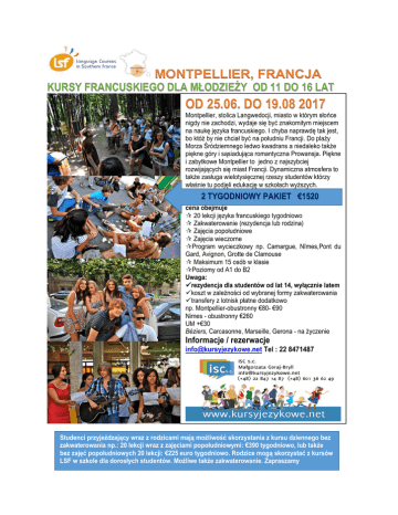 MONTPELLIER, FRANCJA KURSY FRANCUSKIEGO DLA MŁODZIEŻY OD 11 DO 16 LAT OD 25.06. DO 19.08 2017 Montpellier, stolica Langwedocji, miasto w którym słońce nigdy nie zachodzi, wydaje się być znakomitym miejscem na naukę języka francuskiego. I chyba naprawdę tak jest, bo któż by nie chciał być na południu Francji. Do plaży Morza Śródziemnego ledwo kwadrans a niedaleko także piękne góry i sąsiadująca romantyczna Prowansja. Piękne i zabytkowe Montpellier to jedno z najszybciej rozwijających się miast Francji. Dynamiczna atmosfera to także zasługa wielotysięcznej rzeszy studentów którzy właśnie tu podjęli edukację w szkołach wyższych. 2 TYGODNIOWY PAKIET €1520 cena obejmuje 20 lekcji języka francuskiego tygodniowo Zakwaterowanie (rezydencja lub rodzina) Zajęcia popołudniowe Zajęcia wieczorne Program wycieczkowy np. Camargue, Nîmes,Pont du Gard, Avignon, Grotte de Clamouse Maksimum 15 osób w klasie Poziomy od A1 do B2 Uwaga: rezydencja dla studentów od lat 14, wyłącznie latem koszt w zależności od wybranej formy zakwaterowania transfery z lotnisk płatne dodatkowo np. Montpellier-obustronny €80- €90 Nimes - obustronny €260 UM +€30 Béziers, Carcasonne, Marseille, Gerona - na życzenie Informacje / rezerwacje [email protected] Tel : 22 8471487 Studenci przyjeżdzający wraz z rodzicami mają możliwość skorzystania z kursu dziennego bez zakwaterowania np.: 20 lekcji wraz z zajęciami popołudniowymi: €390 tygodniowo, lub także bez zajęć popołudniowych 20 lekcji: €225 euro tygodniowo. Rodzice mogą skorzystać z kursów LSF w szkole dla dorosłych studentów. Możliwe także zakwaterowanie. Zapraszamy