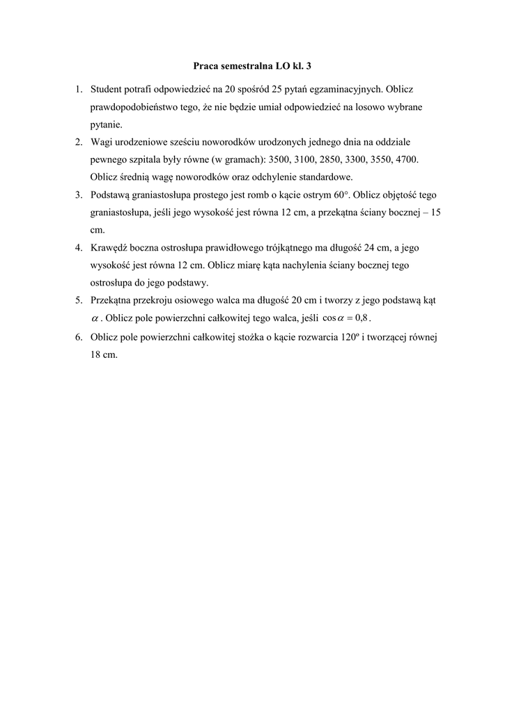 Praca semestralna LO kl. 3 1. Student potrafi odpowiedzieć na 20 spośród 25 pytań egzaminacyjnych. Oblicz prawdopodobieństwo tego, że nie będzie umiał odpowiedzieć na losowo wybrane pytanie. 2. Wagi urodzeniowe sześciu noworodków urodzonych jednego dnia na oddziale pewnego szpitala były równe (w gramach): 3500, 3100, 2850, 3300, 3550, 4700. Oblicz średnią wagę noworodków oraz odchylenie standardowe. 3. Podstawą graniastosłupa prostego jest romb o kącie ostrym 60Oblicz objętość tego graniastosłupa, jeśli jego wysokość jest równa 12 cm, a przekątna ściany bocznej – 15 cm. 4. Krawędź boczna ostrosłupa prawidłowego trójkątnego ma długość 24 cm, a jego wysokość jest równa 12 cm. Oblicz miarę kąta nachylenia ściany bocznej tego ostrosłupa do jego podstawy. 5. Przekątna przekroju osiowego walca ma długość 20 cm i tworzy z jego podstawą kąt . Oblicz pole powierzchni całkowitej tego walca, jeśli cos 0,8 . 6. Oblicz pole powierzchni całkowitej stożka o kącie rozwarcia 120º i tworzącej równej 18 cm.