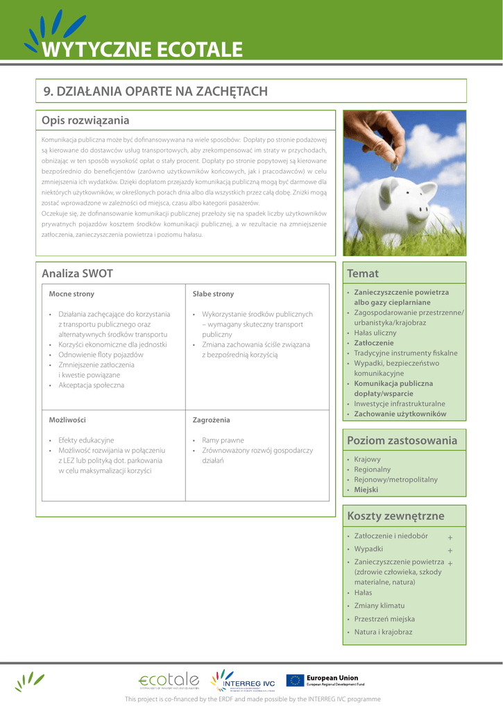 WYTYCZNE ECOTALE 9. DZIAŁANIA OPARTE NA ZACHĘTACH Opis rozwiązania Komunikacja publiczna może być dofinansowywana na wiele sposobów: Dopłaty po stronie podażowej są kierowane do dostawców usług transportowych, aby zrekompensować im straty w przychodach, obniżając w ten sposób wysokość opłat o stały procent. Dopłaty po stronie popytowej są kierowane bezpośrednio do beneficjentów (zarówno użytkowników końcowych, jak i pracodawców) w celu zmniejszenia ich wydatków. Dzięki dopłatom przejazdy komunikacją publiczną mogą być darmowe dla niektórych użytkowników, w określonych porach dnia albo dla wszystkich przez całą dobę. Zniżki mogą zostać wprowadzone w zależności od miejsca, czasu albo kategorii pasażerów. Oczekuje się, że dofinansowanie komunikacji publicznej przełoży się na spadek liczby użytkowników prywatnych pojazdów kosztem środków komunikacji publicznej, a w rezultacie na zmniejszenie zatłoczenia, zanieczyszczenia powietrza i poziomu hałasu. Analiza SWOT Temat Mocne strony Słabe strony •• Działania zachęcające do korzystania z transportu publicznego oraz alternatywnych środków transportu •• Korzyści ekonomiczne dla jednostki •• Odnowienie floty pojazdów •• Zmniejszenie zatłoczenia i kwestie powiązane •• Akceptacja społeczna •• Wykorzystanie środków publicznych – wymagany skuteczny transport publiczny •• Zmiana zachowania ściśle związana z bezpośrednią korzyścią Możliwości Zagrożenia •• Efekty edukacyjne •• Możliwość rozwijania w połączeniu z LEZ lub polityką dot. parkowania w celu maksymalizacji korzyści •• Ramy prawne •• Zrównoważony rozwój gospodarczy działań •• Zanieczyszczenie powietrza albo gazy cieplarniane •• Zagospodarowanie przestrzenne/ urbanistyka/krajobraz •• Hałas uliczny •• Zatłoczenie •• Tradycyjne instrumenty fiskalne •• Wypadki, bezpieczeństwo komunikacyjne •• Komunikacja publiczna dopłaty/wsparcie •• Inwestycje infrastrukturalne •• Zachowanie użytkowników Poziom zastosowania •• •• •• •• Krajowy Regionalny Rejonowy/metropolitalny Miejski Koszty zewnętrzne •• Zatłoczenie i niedobór + •• Wypadki + •• Zanieczyszczenie powietrza + (zdrowie człowieka, szkody materialne, natura) •• Hałas •• Zmiany klimatu •• Przestrzeń miejska •• Natura i krajobraz This project is co-financed by the ERDF and made possible by the INTERREG IVC programme WYTYCZNE ECOTALE Sugestie metodologiczne Składnik kosztów Koszt zewnętrzny wydłużenie czasu podróży Zatłoczenie x wartość czasu x wielkość i niedobór ruchu Elementy kosztów Funkcja/nośnik kosztów Proponowane techniki szacowania czas podróży (cel, środek transportu, długość przejazdów pasażerskich, środek transportu oraz rodzaj towaru do transportu) rodzaj infrastruktury bezpieczeństwo wielkość i skład strumienia ruchu uciążliwość rodzaj sieci (miejska, międzymiastowa, metropolitalna - liczba pasów) Potrzebne dane stosunek prędkość/ przepływ WTP/WTA w celu oszacowania wartości czasu w przypadku zatłoczenia Istotne kwestie dot. wyceny stosunek prędkość/ przepływ elastyczność popytu marginalne koszty społeczne wartość czasu spadek wartości poziom przepustowości w czasie dodatkowe koszty paliwa poziom ruchu koszt alternatywny WTP w celu oszacowania kosztów związanych z niedoborem koszty środowiskowe opóźnienie bezpośrednie i wywołane koszt wzrasta nieznacznie wraz z ruchem i w zależności od sytuacji (czas-miejsce) przepustowość koszt alternatywny natężenie ruchu koszty leczenia Wypadki Szkody materialne, koszty administracyjne i medyczne, straty produkcyjne i oszacowanie kosztów dla przyjaciół/ krewnych podejście do ryzyka WTP/WTA w celu oszacowania wartości statystycznego życia ludzkiego rodzaj infrastruktury utrata produktywności rozkład prędkości dzień/noc utrata życia ludzkiego baza danych wypadków i ich skutków (obrażenia ciężkie/lekkie, ofiary śmiertelne...) koszt zasobów dla celów poprawy stanu zdrowia wartość życia ludzkiego efekty zewnętrzne pogoda Koszty zanieczyszczenia powietrza są powodowane przez emisję cząstek stałych (PM), NOx, ZanieczyszSO2 i VOC. Koszty czenie zanieczyszczenia powietrza powietrza są także generowane przez przemysł, rolnictwo i gospodarstwa domowe. szkody w budynkach poziom ruchu dane dotyczące emisji wg rodzaju zanieczyszczeń szkody w rolnictwie lokalizacja - narażenie struktura pojazdów szkody dla zdrowia człowieka gęstość zaludnienia i osiedli ocena ilościowa szkód koszt naprawy rodzaj silnika - zasilanie paliwem dane dot. sieci szkody w ekosystemach cechy kierowców Zalecenia / komentarze Wykonalność pod względem technicznym Łatwo Akceptacja społeczeństwa Średnio Poczucie sprawiedliwości Tak Działania oparte na zachętach stanowią rodzinę nietechnicznych możliwości ograniczenia emisji i wpływu ruchu ulicznego i transportu. W kontekście ekonomicznym każde działanie ma spełniać określone cele. W zależności od rodzaju działania i polityki cele odnosi się do różnych kontekstów przestrzennych i czasowych. Ustalenie poziomu dopłat do komunikacji publicznej jest oczywiście faktem politycznym, a zatem nie może być oparty wyłącznie na badaniach naukowych i faktach technicznych. Ponadto wprowadzenie mocno subsydiowanych rozwiązań z zakresu komunikacji publicznej dla użytkowników jest wyraźnie powiązane z argumentem o zapobieganiu wykluczeniu społecznemu. Z drugiej jednak strony ma istotne wady związane z efektem odbicia, który czyni skutki środowiskowe mniej atrakcyjnymi, niż oczekiwano. Istnieją jednak poważne argumenty przemawiające za darmową komunikacją publiczną (albo istotnie obniżonymi opłatami) dla określonych grup użytkowników, takich jak uczniowie/studenci i osoby starsze, w szczególności biorąc pod uwagę przejazdy poz