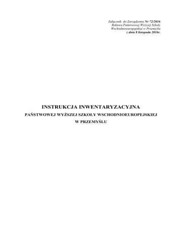 Załącznik do Zarządzenia Nr 72/2016 Rektora Państwowej Wyższej Szkoły Wschodnioeuropejskiej w Przemyślu z dnia 8 listopada 2016r. INSTRUKCJA INWENTARYZACYJNA PAŃSTWOWEJ WYŻSZEJ SZKOŁY WSCHODNIOEUROPEJSKIEJ W PRZEMYŚLU I. ZASADY OGÓLNE Instrukcja określa cel, metody, zakres przeprowadzania inwentaryzacji w PWSW w Przemyślu oraz kompetencje i zadania osób odpowiedzialnych za inwentaryzację Cel inwentaryzacji 1. Głównym celem inwentaryzacji jest ustalenie rzeczywistego stanu składników aktywów i pasywów jednostki, porównanie go ze stanem wynikającym z ewidencji i doprowadzenie, w przypadku stwierdzonych rozbieżności, do przywrócenia zgodności między nimi, poprzez dokonanie w księgach roku obrotowego, na który przypada termin inwentaryzacji, odpowiednich zapisów księgowych. 2. Przeprowadzenie inwentaryzacji ma także na celu dokonanie oceny: a) przydatności gospodarczej posiadanych przez jednostkę składników majątkowych, b) osób, którym powierzono mienie jednostki, a więc osób odpowiedzialnych materialnie, zwłaszcza w zakresie ich kompetencji, uczciwości, stopnia przygotowania do pełnienia określonej funkcji oraz ich rozliczenie za powierzone im mienie, c) stanu zabezpieczenia rzeczowych składników aktywów i gotówki przed niekorzystnymi wypadkami (takimi jak zdarzenia losowe, np. pożar, powódź, kradzież z włamaniem), a także przed negatywnym działaniem wpływów atmosferycznych (np. przed psuciem się), d) przeciwdziałania nieprawidłowościom w gospodarce majątkiem Uczelni. Sposoby przeprowadzania inwentaryzacji 1. Ustalenia rzeczywistego stanu aktywów i pasywów dokonuje się drogą: a) spisu z natury, b) uzgodnienia sald z bankami (stanu środków na rachunkach bankowych, lokat, kredytów itp.), c) uzgodnienia sald należności i zobowiązań, d) uzgodnienia sald rozrachunków, d) porównania stanów wynikających z ksiąg rachunkowych z danymi wynikającymi z odpowiednich dokumentów, ich analizy oraz weryfikacji. 2. Drogą spisu z natury inwentaryzuje się: a) aktywa pieniężne (gotówkę, czeki, papiery wartościowe itp.) z wyłączeniem zgromadzonych na rachunkach bankowych, a) rzeczowe składniki majątkowe (środki trwałe, pozostałe środki trwałe, księgozbiory itp.), b) maszyny i urządzenia wchodzące w skład środków trwałych w budowie, c) nieruchomości zaliczone do inwestycji. 3. Drogą uzgodnienia sald inwentaryzuje się: a) aktywa pieniężne zgromadzone na rachunkach bankowych, b) zobowiązania i należności, z wyjątkiem należności: – spornych i wątpliwych, – od osób nieprowadzących ksiąg rachunkowych, – z tytułów publicznoprawnych, c) należności z tytułu udzielonych pożyczek. 4. Drogą porównania danych ksiąg rachunkowych z odpowiednimi dokumentami oraz analizy i weryfikacji stanów i ich realnej wartości inwentaryzuje się: a) środki trwałe, do których dostęp jest znacznie utrudniony, grunty, b) należności sporne i wątpliwe, c) należności i zobowiązania wobec osób nieprowadzących ksiąg rachunkowych, d) należności i zobowiązania z tytułów publicznoprawnych, e) wartości niematerialne i prawne, f) inwestycje zaliczane do finansowych aktywów trwałych, g) rozliczenia międzyokresowe kosztów i przychodów, h) kapitały, fundusze i rezerwy. Metody przeprowadzania inwentaryzacji w PWSW w Przemyślu 1. Inwentaryzacja może być przeprowadzona metodą: a) pełną, b) ciągłą, c) uproszczoną 2. Inwentaryzację przeprowadza się w formie: a) okresowej (np. wymaganej ustawą o rachunkowości), b) doraźnej (nadzwyczajnej) dokonywanej z reguły drogą spisu z natury, np. w związku z wypadkami losowymi (powódź, pożar, włamanie, kradzież) lub w związku ze zmianą osób odpowiedzialnych materialnie. 2. Najczęściej przeprowadzaną inwentaryzacją okresową pełną jest inwentaryzacja roczna składników aktywów i pasywów. 3. Doraźna inwentaryzacja może zostać przeprowadzona w związku z: a) rozliczeniem osoby materialnie odpowiedzialnej, b) kontrolą organów zewnętrznych (np. organów podatkowych, biegłego rewidenta), c) wypadkami i zdarzeniami losowymi (np. powódź, pożar, gradobicie, kradzież, włamanie), d) z inicjatywy Rektora, Kanclerza i Kwestora 4. W razie zaistnienia zdarzeń losowych, konieczności zmiany osób odpowiedzialnych materialnie, kontroli przydatności pracowników itp., inwentaryzację przeprowadza się drogą spisu z natury, przy zastosowaniu metody pełnej. 5. Inwentaryzację metodą uproszczoną można przeprowadzać pod warunkiem, że skutki uproszczeń nie wpłyną negatywnie na stosowanie określonych ustawą zasad rachunkowości zobowiązujących do rzetelnego i jasnego przedstawiania sytuacji majątkowej, finansowej oraz wyniku finansowego. Terminy przeprowadzania inwentaryzacji 1. Uczelnia przeprowadza inwentaryzację: a) na ostatni dzień każdego roku obrotowego: - aktywów pieniężnych (gotówki, czeków, papierów wartościowych itp.), - materiałów i towarów odpisywanych w koszty w dniu ich zakupu, - aktywów pieniężnych zgromadzone na rachunkach bankowych, -inwestycji, - należności spornych i wątpliwych, - należności od osób nieprowadzących ksiąg rachunkowych, - należności z tytułów publicznoprawnych, - zobowiązań, - rozliczeń międzyokresowych kosztów i przychodów, - kapitałów i funduszy, - rezerw. b) raz w ciągu dwóch lat - materiałów, towarów, wyrobów gotowych znajdujących się na terenie strzeżonym i objętych ewidencją ilościowo-wartościową c) raz w ciągu czterech lat –sporządza się spis z natury środków trwałych oraz pozostałych środków trwałych, jak też znajdujących się na terenie strzeżonym innych środków trwałych oraz maszyn i urządzeń, wchodzących w skład środków trwałych w budowie. 2. W ostatnim kwartale roku obrotowego, do 15. dnia następnego roku obrotowego, pod warunkiem że ustalenie stanu następuje przez dopisanie lub odpisanie od stanu stwier