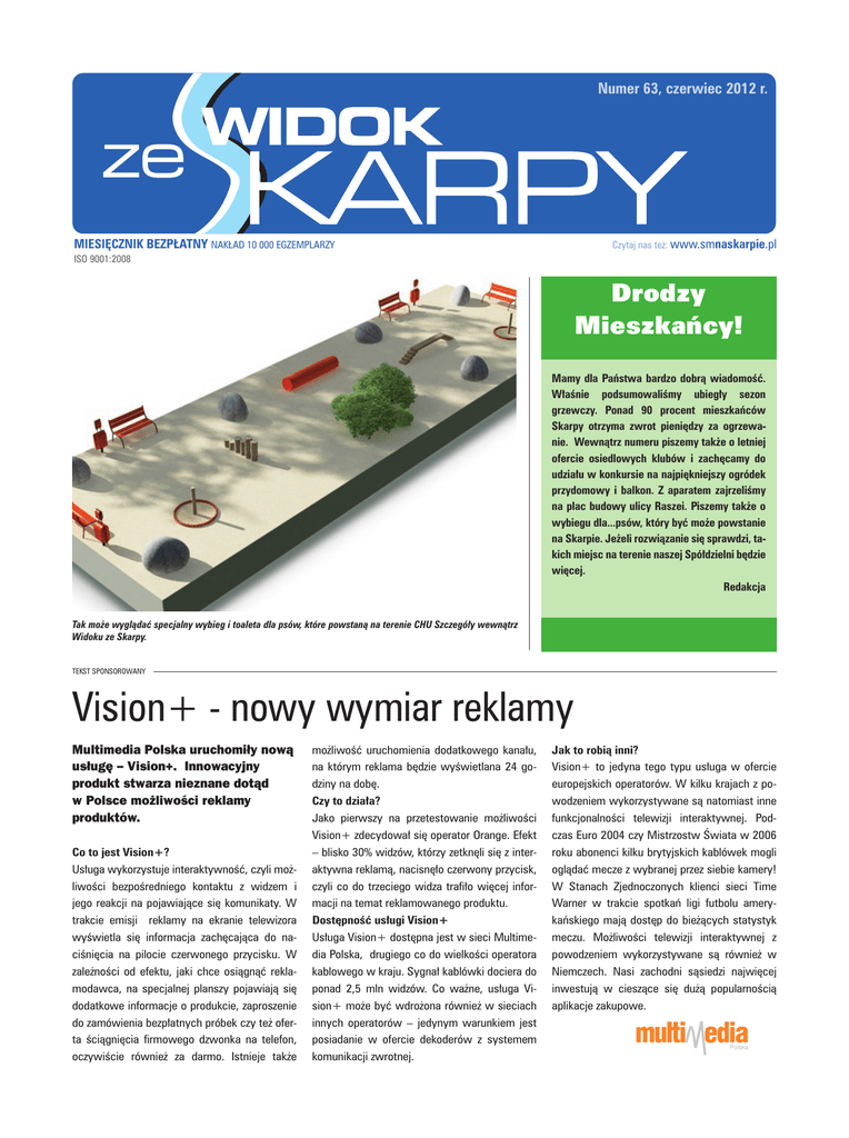 Magazyn mieszkańców SM „Na Skarpie” Numer 63, czerwiec 2012 r. MIESIĘCZNIK BEZPŁATNY NAKŁAD 10 000 EGZEMPLARZY Czytaj nas też: www.smnaskarpie.pl ISO 9001:2008 Drodzy Mieszkańcy! Mamy dla Państwa bardzo dobrą wiadomość. Właśnie podsumowaliśmy ubiegły sezon grzewczy. Ponad 90 procent mieszkańców Skarpy otrzyma zwrot pieniędzy za ogrzewanie. Wewnątrz numeru piszemy także o letniej ofercie osiedlowych klubów i zachęcamy do udziału w konkursie na najpiękniejszy ogródek przydomowy i balkon. Z aparatem zajrzeliśmy na plac budowy ulicy Raszei. Piszemy także o wybiegu dla...psów, który być może powstanie na Skarpie. Jeżeli rozwiązanie się sprawdzi, takich miejsc na terenie naszej Spółdzielni będzie więcej. Redakcja Tak może wyglądać specjalny wybieg i toaleta dla psów, które powstaną na terenie CHU Szczegóły wewnątrz Widoku ze Skarpy. TEKST SPONSOROWANY Vision+ - nowy wymiar reklamy Multimedia Polska uruchomiły nową usługę – Vision+. Innowacyjny produkt stwarza nieznane dotąd w Polsce możliwości reklamy produktów. Co to jest Vision+? Usługa wykorzystuje interaktywność, czyli możliwości bezpośredniego kontaktu z widzem i jego reakcji na pojawiające się komunikaty. W trakcie emisji reklamy na ekranie telewizora wyświetla się informacja zachęcająca do naciśnięcia na pilocie czerwonego przycisku. W zależności od efektu, jaki chce osiągnąć reklamodawca, na specjalnej planszy pojawiają się dodatkowe informacje o produkcie, zaproszenie do zamówienia bezpłatnych próbek czy też oferta ściągnięcia firmowego dzwonka na telefon, oczywiście również za darmo. Istnieje także możliwość uruchomienia dodatkowego kanału, na którym reklama będzie wyświetlana 24 godziny na dobę. Czy to działa? Jako pierwszy na przetestowanie możliwości Vision+ zdecydował się operator Orange. Efekt – blisko 30% widzów, którzy zetknęli się z interaktywna reklamą, nacisnęło czerwony przycisk, czyli co do trzeciego widza trafiło więcej informacji na temat reklamowanego produktu. Dostępność usługi Vision+ Usługa Vision+ dostępna jest w sieci Multimedia Polska, drugiego co do wielkości operatora kablowego w kraju. Sygnał kablówki dociera do ponad 2,5 mln widzów. Co ważne, usługa Vision+ może być wdrożona również w sieciach innych operatorów – jedynym warunkiem jest posiadanie w ofercie dekoderów z systemem komunikacji zwrotnej. Jak to robią inni? Vision+ to jedyna tego typu usługa w ofercie europejskich operatorów. W kilku krajach z powodzeniem wykorzystywane są natomiast inne funkcjonalności telewizji interaktywnej. Podczas Euro 2004 czy Mistrzostw Świata w 2006 roku abonenci kilku brytyjskich kablówek mogli oglądać mecze z wybranej przez siebie kamery! W Stanach Zjednoczonych klienci sieci Time Warner w trakcie spotkań ligi futbolu amerykańskiego mają dostęp do bieżących statystyk meczu. Możliwości telewizji interaktywnej z powodzeniem wykorzystywane są również w Niemczech. Nasi zachodni sąsiedzi najwięcej inwestują w cieszące się dużą popularnością aplikacje zakupowe.