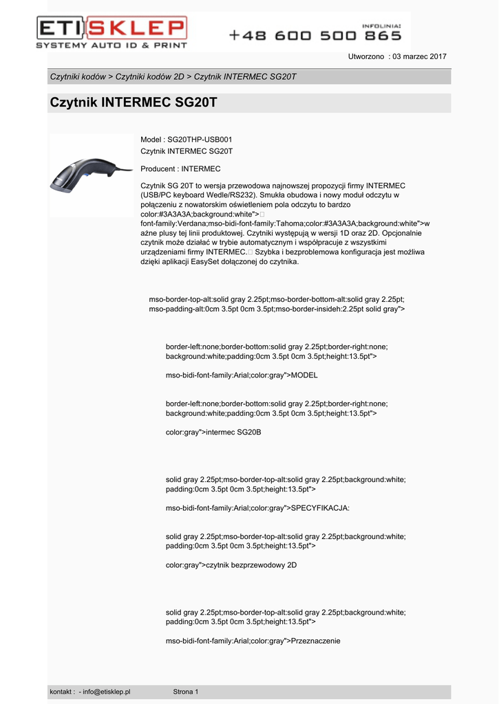 Utworzono : 03 marzec 2017 Czytniki kodów > Czytniki kodów 2D > Czytnik INTERMEC SG20T Czytnik INTERMEC SG20T Model : SG20THP-USB001 Czytnik INTERMEC SG20T Producent : INTERMEC Czytnik SG 20T to wersja przewodowa najnowszej propozycji firmy INTERMEC (USB/PC keyboard Wedle/RS232). Smukła obudowa i nowy moduł odczytu w połączeniu z nowatorskim oświetleniem pola odczytu to bardzo color:#3A3A3A;background:white">� font-family:Verdana;mso-bidi-font-family:Tahoma;color:#3A3A3A;background:white">w ażne plusy tej linii produktowej. Czytniki występują w wersji 1D oraz 2D. Opcjonalnie czytnik może działać w trybie automatycznym i współpracuje z wszystkimi urządzeniami firmy INTERMEC.�Szybka i bezproblemowa konfiguracja jest możliwa dzięki aplikacji EasySet dołączonej do czytnika. mso-border-top-alt:solid gray 2.25pt;mso-border-bottom-alt:solid gray 2.25pt; mso-padding-alt:0cm 3.5pt 0cm 3.5pt;mso-border-insideh:2.25pt solid gray"> border-left:none;border-bottom:solid gray 2.25pt;border-right:none; background:white;padding:0cm 3.5pt 0cm 3.5pt;height:13.5pt"> mso-bidi-font-family:Arial;color:gray">MODEL border-left:none;border-bottom:solid gray 2.25pt;border-right:none; background:white;padding:0cm 3.5pt 0cm 3.5pt;height:13.5pt"> color:gray">intermec SG20B solid gray 2.25pt;mso-border-top-alt:solid gray 2.25pt;background:white; padding:0cm 3.5pt 0cm 3.5pt;height:13.5pt"> mso-bidi-font-family:Arial;color:gray">SPECYFIKACJA: solid gray 2.25pt;mso-border-top-alt:solid gray 2.25pt;background:white; padding:0cm 3.5pt 0cm 3.5pt;height:13.5pt"> color:gray">czytnik bezprzewodowy 2D solid gray 2.25pt;mso-border-top-alt:solid gray 2.25pt;background:white; padding:0cm 3.5pt 0cm 3.5pt;height:13.5pt"> mso-bidi-font-family:Arial;color:gray">Przeznaczenie kontakt : - [email protected] Strona 1 Utworzono : 03 marzec 2017 Czytniki kodów > Czytniki kodów 2D > Czytnik INTERMEC SG20T Czytnik INTERMEC SG20T solid gray 2.25pt;mso-border-top-alt:solid gray 2.25pt;background:white; padding:0cm 3.5pt 0cm 3.5pt;height:13.5pt"> color:gray">handel, biuro, apteka solid gray 2.25pt;mso-border-top-alt:solid gray 2.25pt;background:white; padding:0cm 3.5pt 0cm 3.5pt;height:201.0pt"> mso-bidi-font-family:Arial;color:gray">Rodzaj�odczytywanych kodów solid gray 2.25pt;mso-border-top-alt:solid gray 2.25pt;background:white; padding:0cm 3.5pt 0cm 3.5pt;height:201.0pt"> Arial;color:gray;mso-ansi-language:EN-US">1D: Codabar, Code 11, Code 39, Code 93/93i, Code 128 / GS1-128, EAN/UPC, GS1 DataBar Limited, GS1 Composite (linear only), GS1 DataBar Expanded, GS1 DataBar Omnidirectional, Interleaved 2 of 5, Matrix 2 of 5, MSI, Plessey, Standard 2 of 5, Telepen 2D: Australian Post, Aztec, BPO, Canada Post, Codablock A, Codablock F, DataMatrix, Dutch Post, EAN/UPC, GS1 Composite, GS1 DataBar Stacked, Infomail, Intelligent Mail, Japan Post, Maxicode, Micro PDF417, Multicode, PDF417, Planet, Postnet, QR Code, Sweden Post, TLC 39 solid gray 2.25pt;mso-border-top-alt:solid gray 2.25pt;background:white; padding:0cm 3.5pt 0cm 3.5pt;height:13.5pt"> mso-bidi-font-family:Arial;color:gray">Typ modułu solid gray 2.25pt;mso-border-top-alt:solid gray 2.25pt;background:white; padding:0cm 3.5pt 0cm 3.5pt;height:13.5pt"> color:gray">imager 2D solid gray 2.25pt;mso-border-top-alt:solid gray 2.25pt;background:white; padding:0cm 3.5pt 0cm 3.5pt;height:22.5pt"> mso-bidi-font-family:Arial;color:gray">Szybkość odczytu solid gray 2.25pt;mso-border-top-alt:solid gray 2.25pt;background:white; padding:0cm 3.5pt 0cm 3.5pt;height:22.5pt"> color:gray">bdb. kontakt : - [email protected] Strona 2 Utworzono : 03 marzec 2017 Czytniki kodów > Czytniki kodów 2D > Czytnik INTERMEC SG20T Czytnik INTERMEC SG20T solid gray 2.25pt;mso-border-top-alt:solid gray 2.25pt;background:white; padding:0cm 3.5pt 0cm 3.5pt;height:22.5pt"> mso-bidi-font-family:Arial;color:gray">Odległość odczytu solid gray 2.25pt;mso-border-top-alt:solid gray 2.25pt;background:white; padding:0cm 3.5pt 0cm 3.5pt;height:22.5pt"> color:gray">6 do 21cm solid gray 2.25pt;mso-border-top-alt:solid gray 2.25pt;background:white; padding:0cm 3.5pt 0cm 3.5pt;height:22.5pt"> mso-bidi-font-family:Arial;color:gray">Sygnalizacja odczytu solid gray 2.25pt;mso-border-top-alt:solid gray 2.25pt;background:white; padding:0cm 3.5pt 0cm 3.5pt;height:22.5pt"> color:gray">dźwiękowa / świetlna solid gray 2.25pt;mso-border-top-alt:solid gray 2.25pt;background:white; padding:0cm 3.5pt 0cm 3.5pt;height:13.5pt"> mso-bidi-font-family:Arial;color:gray">Interfejsy solid gray 2.25pt;mso-border-top-alt:solid gray 2.25pt;background:white; padding:0cm 3.5pt 0cm 3.5pt;height:13.5pt"> color:gray">RS232 /�PS2 /�USB solid gray 2.25pt;mso-border-top-alt:solid gray 2.25pt;background:white; padding:0cm 3.5pt 0cm 3.5pt;height:22.5pt"> mso-bidi-font-family:Arial;color:gray">Łączność solid gray 2.25pt;mso-border-top-alt:solid gray 2.25pt;background:white; padding:0cm 3.5pt 0cm 3.5pt;height:22.5pt"> color:gray">przewodowy kontakt : - [email protected] Strona 3 Utworzono : 03 marzec 2017 Czytniki kodów > Czytniki kodów 2D > Czytnik INTERMEC SG20T Czytnik INTERMEC SG20T solid gray 2.25pt;mso-border-top-alt:solid gray 2.25pt;background:white; padding:0cm 3.5pt 0cm 3.5pt;height:13.5pt"> mso-bidi-font-family:Arial;color:gray">Zasilanie solid gray 2.25pt;mso-border-top-alt:solid gray 2.25pt;background:white; padding:0cm 3.5pt 0cm 3.5pt;height:13.5pt"> color:gray">5V solid gray 2.25pt;mso-border-top-alt:solid gray 2.25pt;background:white; padding:0cm 3.5pt 0cm 3.5pt;height:13.5pt"> mso-bidi-font-family:Arial;color:gray">Akcesoria solid gray 2.25pt;mso-border-top-alt:solid gray 2.25pt;background:white; padding:0cm 3.5pt 0cm 3.5pt;height:13.5pt"> color:gray">bateria�800mAh, Li-ion solid gray 2.25pt;mso-border-top-alt:solid gray 2.25pt;background:white; padding:0cm 3.5pt 0cm 3.5pt;height:13.5pt"> mso-bidi-font-family:Arial;color:gray">� solid gray 2.25pt;mso-border-top-alt:solid gray 2.25pt;background:white; padding:0