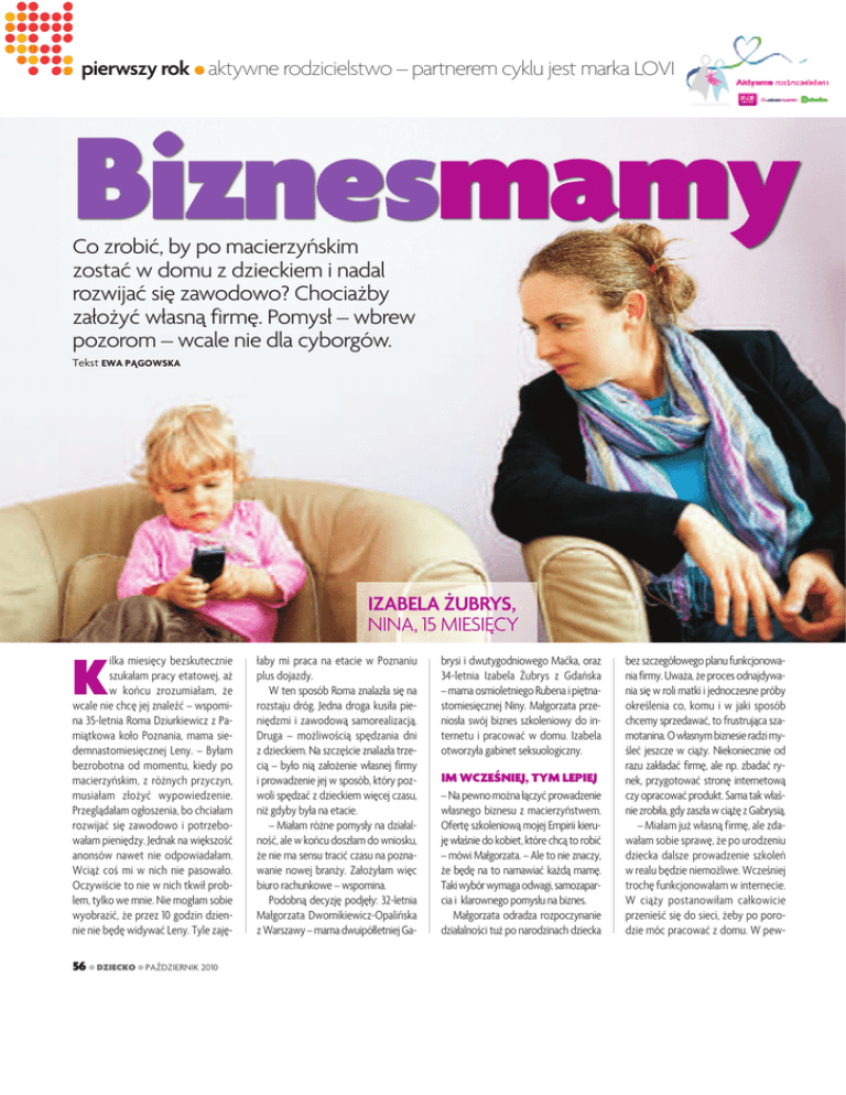 pierwszy rok aktywne rodzicielstwo – partnerem cyklu jest marka LOVI Biznesmamy Co zrobić, by po macierzyńskim zostać w domu z dzieckiem i nadal rozwijać się zawodowo? Chociażby założyć własną firmę. Pomysł – wbrew pozorom – wcale nie dla cyborgów. Tekst EWA PĄGOWSKA IZABELA ŻUBRYS, NINA, 15 MIESIĘCY K ilka miesięcy bezskutecznie szukałam pracy etatowej, aż w końcu zrozumiałam, że wcale nie chcę jej znaleźć – wspomina 35-letnia Roma Dziurkiewicz z Pamiątkowa koło Poznania, mama siedemnastomiesięcznej Leny. – Byłam bezrobotna od momentu, kiedy po macierzyńskim, z różnych przyczyn, musiałam złożyć wypowiedzenie. Przeglądałam ogłoszenia, bo chciałam rozwijać się zawodowo i potrzebowałam pieniędzy. Jednak na większość anonsów nawet nie odpowiadałam. Wciąż coś mi w nich nie pasowało. Oczywiście to nie w nich tkwił problem, tylko we mnie. Nie mogłam sobie wyobrazić, że przez 10 godzin dziennie nie będę widywać Leny. Tyle zaję- 56DZIECKOPAŹDZIERNIK 2010 łaby mi praca na etacie w Poznaniu plus dojazdy. W ten sposób Roma znalazła się na rozstaju dróg. Jedna droga kusiła pieniędzmi i zawodową samorealizacją. Druga – możliwością spędzania dni z dzieckiem. Na szczęście znalazła trzecią – było nią założenie własnej firmy i prowadzenie jej w sposób, który pozwoli spędzać z dzieckiem więcej czasu, niż gdyby była na etacie. – Miałam różne pomysły na działalność, ale w końcu doszłam do wniosku, że nie ma sensu tracić czasu na poznawanie nowej branży. Założyłam więc biuro rachunkowe – wspomina. Podobną decyzję podjęły: 32-letnia Małgorzata Dwornikiewicz-Opalińska z Warszawy – mama dwuipółletniej Ga- brysi i dwutygodniowego Maćka, oraz 34-letnia Izabela Żubrys z Gdańska – mama osmioletniego Rubena i piętnastomiesięcznej Niny. Małgorzata przeniosła swój biznes szkoleniowy do internetu i pracować w domu. Izabela otworzyła gabinet seksuologiczny. IM WCZEŚNIEJ, TYM LEPIEJ – Na pewno można łączyć prowadzenie własnego biznesu z macierzyństwem. Ofertę szkoleniową mojej Empirii kieruję właśnie do kobiet, które chcą to robić – mówi Małgorzata. – Ale to nie znaczy, że będę na to namawiać każdą mamę. Taki wybór wymaga odwagi, samozaparcia i klarownego pomysłu na biznes. Małgorzata odradza rozpoczynanie działalności tuż po narodzinach dziecka bez szczegółowego planu funkcjonowania firmy. Uważa, że proces odnajdywania się w roli matki i jednoczesne próby określenia co, komu i w jaki sposób chcemy sprzedawać, to frustrująca szamotanina. O własnym biznesie radzi myśleć jeszcze w ciąży. Niekoniecznie od razu zakładać firmę, ale np. zbadać rynek, przygotować stronę internetową czy opracować produkt. Sama tak właśnie zrobiła, gdy zaszła w ciążę z Gabrysią. – Miałam już własną firmę, ale zdawałam sobie sprawę, że po urodzeniu dziecka dalsze prowadzenie szkoleń w realu będzie niemożliwe. Wcześniej trochę funkcjonowałam w internecie. W ciąży postanowiłam całkowicie przenieść się do sieci, żeby po porodzie móc pracować z domu. W pew- MAŁGORZATA DWORNIKIEWICZ-OPALIŃSKA, GABRYSIA, 2 I PÓŁ ROKU MACIEK, 2 TYGODNIE Marta Cholewińska-Dacka psycholog Akademii Zabawy i twórczego Rozwoju EDUKADO Co wziąć pod uwagę, gdy decydujemy się na założenie własnej firmy? Myślenie o powrocie do pracy często stresuje kobiety rozdarte między chęcią pozostania z dzieckiem a karierą zawodową. Dlatego ważne jest wcześniejsze przemyślenie sięcznej dotacji na założenie firmy, której ciężarnym nie przyznają. – Gdybym wcześniej pomyślała o własnej firmie, też bym dostała dotację – dodaje Roma. – Tak się jednak złożyło, że kiedy tylko wpadłam na ten pomysł, pojawił się klient na pełną księgowość. Żeby dla niego pracować, musiałam mieć firmę. Nie mogłam czekać, aż rozpatrzą mój wniosek o dotację. Już kilka miesięcy byłam bez pracy i nie bardzo mogłam pozwolić sobie na stratę klienta i ryzyko, że potem będę długo szukać następnych. SPRINTERKI GÓRĄ – Mimo planu, wiedzy i doświadczenia pierwsze pół roku po narodzinach Gabrysi były koszmarem – wspomina Małgorzata. – Cały czas się miotałam, próbowałam być w kilku miejscach jednocześnie i robić kilka rzeczy naraz. Napinałam się, żeby być idealną matką i idealną bizneswoman. Byłam wściekła na siebie, że słabo sobie radzę, i zła na Gabrysię, że nie chce współpracować. tematu i przygotowanie całej rodziny do zmian. Dziś wiele kobiet decyduje się na założenie własnej firmy, mają one nadzieję, że takie rozwiązanie pozwoli im łatwiej godzić pracę zawodową z rolą matki. Ale by tak się faktycznie stało, kobieta musi nauczyć się świetnie zarządzać swoim czasem i lubić być swoją własną szefową. Nie każdy się do takiego przedsięwzięcia nadaje – ze względu na osobowość lub temperament. Trzeba mieć dużą wewnętrzną motywację i samodyscyplinę – pracując na swoim, zadania wyznaczamy sobie sami, nikt nad nami nie stoi. Niestety, trzeba także liczyć się z tym, że na zysk trzeba będzie trochę poczekać, ten typ pracy premiuje więc osoby wytrwałe i cierpliwe. R E K L A M A nym sensie wymyśliłam firmę od nowa. Zaczęłam opracowywać szkolenia on-line i materiały edukacyjne, które sprzedaję w formie pdf-ów i nagrań audio. Zaplanowałam prowadzenie coachingu przez skype’a. Wpadłam też na pomysł internetowego klubu kobiet. Dzięki niemu w 2008 r. znalazłam się wśród finalistek konkursu na innowacyjny biznes kobiecy Darboven Idee Grant. Izabela chciała pójść krok dalej i jeszcze w ciąży otworzyć gabinet. – Właśnie wróciliśmy z mężem i synem z Irlandii, gdzie pracowałam w polskiej przychodni jako psycholog i seksuolog – wspomina. – W Polsce zaczęłam mieć poczucie, że wszyscy oprócz mnie r