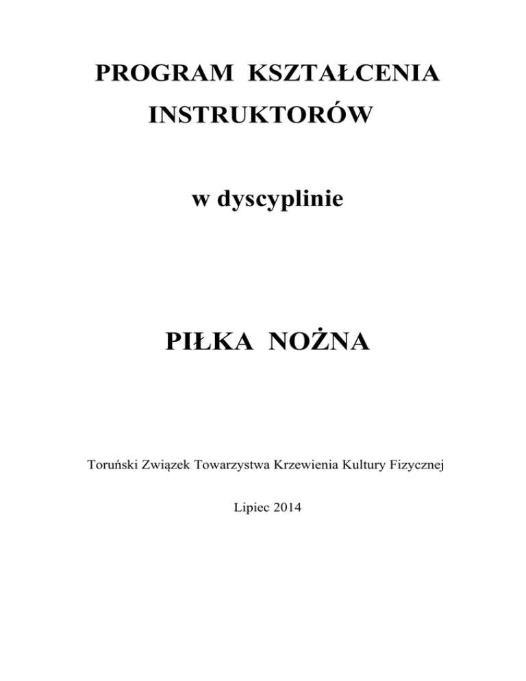 PROGRAM KSZTAŁCENIA INSTRUKTORÓW w dyscyplinie PIŁKA NOŻNA Toruński Związek Towarzystwa Krzewienia Kultury Fizycznej Lipiec 2014 l. Cele i zadania; - zapoznanie uczestników z teoretycznymi, metodycznymi i organizacyjnymi zasadami procesu szkoleniowego, - praktyczne przygotowanie uczestników do samodzielnej pracy wychowawczo szkoleniowej, - podniesienie sprawności specjalnej uczestników, l. l .Kryteria przyjęcia kandydatów na kurs instruktorski; - zaliczenie sprawdzianu praktycznego, (poprawna demonstracja podstawowych elementów techniki indywidualnej), - przedstawienie aktualnych badań lekarskich zezwalających na udział w kursie, 1.2.Ilość godzin programowych; Wykłady: 100 godz. Ćwiczenia: 80 godz. ____________________ RAZEM - 180 godz. Wymagania egzaminacyjne: -obecność na zajęciach oraz aktywny udział w ćwiczeniach, -znajomość systematyki i metodyki nauczania techniki gry, -znajomość metodyki kształtowania cech motorycznych, -umiejętność poprawnego demonstrowania podstawowych elementów techniki gry, -wykazanie się teoretyczną! praktyczną znajomością przepisów gry i organizacji zawodów, -zaliczenie pracy kontrolnej z zakresu przerobionego materiału, -zaliczenie praktyk instruktorskich - egzamin końcowy z całości materiału ( do egzaminu dopuszczeni są ci słuchacze, którzy uzyskali zaliczenie z wyżej wymienionych zagadnień ) W Rodzaj zajęć Ć 7h 3h PRZEDMIOTY PODSTAWOWE Anatomia funkcjonalna, podstawy medycyny sportu i higieny żywienia sportowców 1 Podstawy budowy ciała człowieka 2 Czynnościowe znaczenie poszczególnych układów w wysiłku fizycznym . 3 Normy żywienia i wyżywienia dla wybranych dyscyplin sportu. Odżywki w sporcie 4 Specyfika żywienia sportowców w okresie treningów, zawodów i odnowy. 5 Zespół zmęczenia, przewlekłego zmęczenia i przetrenowania sportowców. Zastosowanie odnowy biologicznej 6 Najczęstsze urazy sportowe z uwzględnienie specyfiki dyscypliny sportowej piłka nożna 7 Podstawy udzielania pierwszej pomocy Podstawy biochemii i fizjologii sportu 1 2 3 7h 3h Źródła energetyczne organizmu wpływające na możliwości wysiłkowe sportowca Podstawowe mechanizmy przemian dostarczających energię podczas wysiłku fizycznego- cykl Krebsa, łańcuch oddechowy Klasyfikacja wysiłków długotrwałych-podział, czynniki warunkujące maksymalny pobór tlenu Wybrane zagadnienia z biomechaniki i antropologii sportu 5h 5h 1 Podstawowe pojęcia biomechaniki –siła, moment siły, rzut pionowy, poziomy, środek ciężkości, masy ciała 2 Technika sportowa w piłce nożnej w ujęciu biomechanicznym 3 Metody pomiarowe za pomocą urządzeń biomechanicznych 4 Dobór osobników do uprawiania wybranej dyscypliny sportu z uwzględnieniem typu budowy ciała Psychologia i pedagogika w sporcie, socjologicznowychowawcze aspekty uprawiania sportu 1 2 3 4 5 1h Podstawowe pojęcia w psychologii i psychologii sportu-stres, emocje, motywacja, destrukcja, obserwacja, empatia, antycypacja, asertywność Sposoby indywidualnego postępowania z zawodnikiem- rozwiązywanie problemu stresu przedstartowego i startowego Autosugestia i trening mentalny w sporcie Cele i funkcje sportu, wychowanie przez sport Związki sportu ze środowiskiem społecznym. Współpraca trenera z rodziną i szkołą Prawo w sporcie, kształcenie i doszkalanie szkoleniowców 1 5h 5h 2 Ustawa o sporcie Struktura organizacyjna sportu w Polsce. Struktury państwowe, wojewódzkie, samorządowe. Działalność polskich podmiotów prowadzących działalność sportową w Polsce. 3 Marketingu w sporcie. Rynek usług sportowych Rodzaj zajęć PRZEDMIOTY KIERUNKOWE Teoretyczne podstawy teorii sportu i sportu dzieci i młodzieży 1 2 3 4. W Ć 10h 2h Miejsce i rola sportu dzieci i młodzieży w sporcie powszechnym i wyczynowym oraz w we współzawodnictwie sportowym Składowe szkolenia sportowego- pojęcie treningu, czynniki warunkujące trening. Rola trenera w procesie szkolenia sportowego. Etapowość szkolenia sportowego. Elementy warunkujące osiągnięcie mistrzostwa sportowego i właściwy przebieg kariery „talentu sportowego”. Uwarunkowania i zasady szkolenia sportowego w przebiegu ontogenezy. Okresy krytyczne w rozwoju osobniczym. Plan życiowy zawodnika. 5. Trening sportowy piłki nożnej w zależności od rodzaju płci- psychologiczno- biologiczne uwarunkowania. 6. Organizacja i realizacja zawodów sportowych i zgrupowań dla dzieci. Podstawy teorii treningu sportowego 1 2 3 4 5 6 7 8 4h Dobór i selekcja do sportu wyczynowego-rodzaje, kryteria. Charakterystyka treningu sportowego w piłce nożnej. Struktura i zadania treningu w przygotowaniu młodego sportowca. Metodyka kształtowania podstawowych cech motorycznych-siły, szybkości, wytrzymałości, koordynacji ruchowej, gibkości Znaczenie treningu ogólnorozwojowego w kształtowaniu młodego zawodnika na poszczególnych etapach szkolenia ( trening ogólnorozwojowy w piłce nożnej z podziałem na różne akcenty motoryczne, tory ćwiczeń ogólnorozwojowych, trening obwodowy i stacyjny) Planowanie szkolenia. Plan perspektywiczny: diagnoza, prognoza, program. Cykle treningowe wieloletnie, roczne, mezocykle i mikrocykle, jednostka treningowa. Bezpośrednie Przygotowanie Sportowe- BPS, zasady i warunki stosowania w procesie szkolenia młodych sportowców. Metody treningowe i metody nauczania ruchu, kształtowania sprawności fizycznej, formy i środki szkolenia sportowego. Kontrola efektów treningu sportowego- ocena techniki, testy sprawności ogólnej i specjalnej wybranej dyscyplinie sportowej Fizjologia wysiłku fizycznego, metody oceny wydolności fizycznej 1 2 3 4 8h 3h Energetyka wysiłku- steady-state, wysiłki krótkotrwałe Kwas mlekowy i progi metaboliczne. Proste metody oceny wydolności fizycznej-wyznaczanie HRmax, próby czynnościowe Metody pomiaru maksymalnego pułapu tlenowego-bezpośrednie i pośrednie 3h Rodzaj zajęć WYKŁADY I ĆWICZENIA SPECJALISTYCZNE 1 2 3 4 Trening zdolno