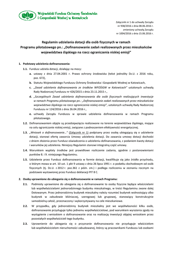 Załącznik nr 1 do uchwały Zarządu nr 938/2016 z dnia 08.06.2016 r. zmieniony uchwałą Zarządu nr 1004/2016 z dnia 15.06.2016 r. Regulamin udzielania dotacji dla osób fizycznych w ramach Programu pilotażowego pn.: „Dofinansowanie zadań realizowanych przez mieszkańców województwa śląskiego na rzecz ograniczenia niskiej emisji” 1. Podstawy udzielenia dofinansowania: 1.1. Fundusz udziela dotacji, działając na mocy: a. ustawy z dnia 27.04.2001 r. Prawo ochrony środowiska (tekst jednolity Dz.U. z 2016 roku, poz. 672), b. Statutu Wojewódzkiego Funduszu Ochrony Środowiska i Gospodarki Wodnej w Katowicach, c. „Zasad udzielania dofinansowania ze środków WFOŚiGW w Katowicach” ustalonych uchwałą Rady Nadzorczej Funduszu nr 426/2015 z dnia 23.11.2015 r., d. „Szczególnych Zasad udzielania dofinansowania dla osób fizycznych realizujących inwestycje w ramach Programu pilotażowego pn.: „Dofinansowanie zadań realizowanych przez mieszkańców województwa śląskiego na rzecz ograniczenia niskiej emisji”, ustalonych uchwałą Rady Nadzorczej Funduszu nr 124/2016 z dnia 26.04.2016 r., e. uchwały Zarządu Funduszu w sprawie udzielenia dofinansowania w ramach Programu pilotażowego. 1.2. Dofinansowaniem objęte są przedsięwzięcia realizowane na terenie województwa śląskiego, mające na celu ograniczanie niskiej emisji, związane z podnoszeniem efektywności energetycznej. 1.3. „Wniosek o dofinansowanie…” (Załącznik nr 1) podpisany przez osobę ubiegającą się o udzielenie dotacji, stanowi ofertę zawarcia Umowy udzielenia dotacji. Do zawarcia umowy dotacji dochodzi z dniem złożenia przez Fundusz oświadczenia o udzieleniu dofinansowania, z podaniem kwoty dotacji i warunków jej udzielenia. Niniejszy Regulamin stanowi integralną część umowy. 1.4. Warunkiem wypłaty środków jest prawidłowe rozliczenie zadania, zgodnie z postanowieniami punktów 8. i 9. niniejszego Regulaminu. 1.5. Udzielenie przez Fundusz dofinansowania w formie dotacji, kwalifikuje się jako źródło przychodu, o którym mowa w art. 10 ust. 1 pkt 9 ustawy z dnia 26 lipca 1991 r. o podatku dochodowym od osób fizycznych (tj. Dz.U. z 2012 r. poz.361 z późn. zm.) i podlega rozliczeniu w zeznaniu rocznym na podstawie wystawionej przez Fundusz deklaracji PIT 8 C. 2. Osoby uprawnione do ubiegania się o dofinansowanie w ramach Programu: 2.1. Podmioty uprawnione do ubiegania się o dofinansowanie to osoby fizyczne będące właścicielami lub współwłaścicielami jednorodzinnego budynku mieszkalnego, w treści Regulaminu zwane dalej Dotowanym. Przez jednorodzinny budynek mieszkalny należy rozumieć budynek wolnostojący albo budynek w zabudowie bliźniaczej, szeregowej lub grupowej, stanowiący konstrukcyjnie samodzielną całość, przeznaczony i wykorzystywany na cele mieszkaniowe. 2.2. W przypadku, gdy jednorodzinny budynek mieszkalny jest we współwłasności kilku osób, dofinansowanie przysługuje tylko jednemu współwłaścicielowi, pod warunkiem wyrażenia zgody na wystąpienie z wnioskiem o dofinansowanie oraz na realizację inwestycji objętej wnioskiem przez pozostałych współwłaścicieli tego budynku. 2.3. Uprawnienie do ubiegania się o przyznanie dofinansowania nie przysługuje właścicielom lub współwłaścicielom nieruchomości zabudowanej, którzy są pracownikami Funduszu lub osobami zaliczonymi do I grupy podatkowej, o której mowa w art. 14 Ustawy o podatku od spadków i darowizn - tekst jednolity Dz. U. z 2016 r. poz. 205. 3. Zakres rzeczowy Programu: 3.1. Programem objęte są istniejące budynki mieszkalne, jednorodzinne, zasilane w ciepło ze źródeł ciepła wyposażonych w emitor o wysokości do 40 m (niska emisja). 3.2. Program obejmuje również nowo budowane budynki mieszkalne, jednorodzinne w zakresie zabudowy odnawialnych źródeł energii. Za nowo budowane obiekty uznaje się budynki, które w chwili składania wniosku nie zostały przekazane do użytkowania. 3.3. Dofinansowaniem objęte są następujące zadania: a. Wymiana źródeł ciepła, przeznaczonych do ogrzewania pomieszczeń lub podgrzewania wody w istniejących obiektach, na bardziej efektywne ekologicznie i energetycznie. W zakresie wymiany źródeł ciepła, na opalane biomasą lub paliwem stałym, udzielenie dotacji możliwe jest wyłącznie na: • kotły opalane paliwem stałym z załadunkiem automatycznym, spełniające wymogi 5 klasy wg kryteriów zawartych w normie PN EN303-5:2012, • kotły opalane biomasą, spełniające wymogi 4 lub 5 klasy, wg kryteriów zawartych w normie PN EN303-5:2012. b. Budowa systemów grzewczych z udziałem odnawialnych źródeł energii, wyłącznie takich jak pompy ciepła, kolektory słoneczne posiadające zgodność z normą PN-EN 12975-1, potwierdzoną sprawozdaniem z badań przeprowadzonym zgodnie z normą PN-EN 12975-2 lub PN-EN ISO 9806 lub europejskim znakiem jakości „Solar Keymark”. c. Zastosowanie rozwiązań technicznych mających na celu zwiększenie oszczędności energii w jednorodzinnych budynkach mieszkalnych, dla których pozwolenie na budowę wydano przed 16.12.2002 r.: • docieplenie przegród budowlanych, • wymiana okien i drzwi, • modernizacja lub budowa wewnętrznych instalacji centralnego ogrzewania. 3.4. Warunkiem uzyskania dotacji na wymianę źródła ciepła w istniejącym (ogrzewanym) obiekcie jest fizyczna likwidacja dotychczasowego źródła ciepła. 3.5. Dofinansowaniem w ramach Programu nie są objęte m.in. instalacje fotowoltaiczne oraz instalacje wentylacji mechanicznej, ciepłej wody użytkowej oraz prace przygotowawcze takie jak: dokumentacja, audyty, uzgodnienia itp. 3.6. Wartość nakładów inwestycyjnych, które mają być objęte dofinansowaniem, nie może być mniejsza niż 8.000,00 zł brutto. 4. Termin i tryb naboru wniosków: 4.1. „Wnioski o dofinansowanie…” należy składać w siedzibie Funduszu, w terminie od dnia 11.07.2016 r. do dnia 22.07.2016 r., w godzinach pracy Fundus