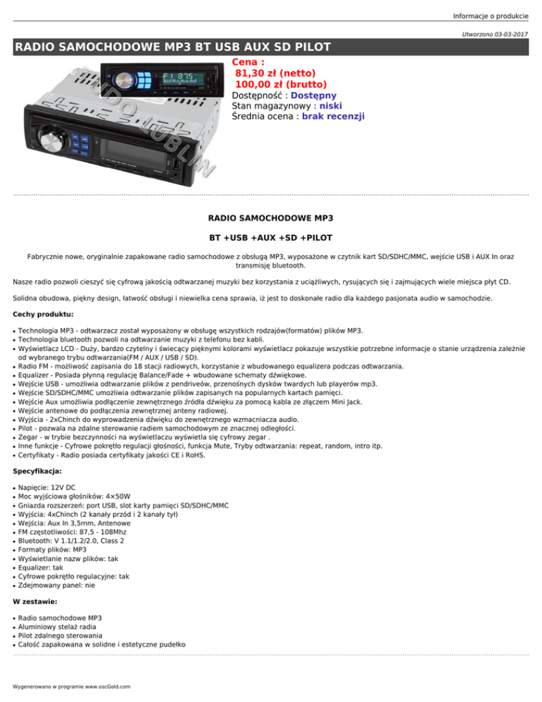 Informacje o produkcie Utworzono 03-03-2017 RADIO SAMOCHODOWE MP3 BT USB AUX SD PILOT Cena : 81,30 zł (netto) 100,00 zł (brutto) Dostępność : Dostępny Stan magazynowy : niski Średnia ocena : brak recenzji RADIO SAMOCHODOWE MP3 BT +USB +AUX +SD +PILOT Fabrycznie nowe, oryginalnie zapakowane radio samochodowe z obsługą MP3, wyposażone w czytnik kart SD/SDHC/MMC, wejście USB i AUX In oraz transmisję bluetooth. Nasze radio pozwoli cieszyć się cyfrową jakością odtwarzanej muzyki bez korzystania z uciążliwych, rysujących się i zajmujących wiele miejsca płyt CD. Solidna obudowa, piękny design, łatwość obsługi i niewielka cena sprawia, iż jest to doskonałe radio dla każdego pasjonata audio w samochodzie. Cechy produktu: ● ● ● ● ● ● ● ● ● ● ● ● ● ● Technologia MP3 - odtwarzacz został wyposażony w obsługę wszystkich rodzajów(formatów) plików MP3. Technologia bluetooth pozwoli na odtwarzanie muzyki z telefonu bez kabli. Wyświetlacz LCD - Duży, bardzo czytelny i świecący pięknymi kolorami wyświetlacz pokazuje wszystkie potrzebne informacje o stanie urządzenia zależnie od wybranego trybu odtwarzania(FM / AUX / USB / SD). Radio FM - możliwość zapisania do 18 stacji radiowych, korzystanie z wbudowanego equalizera podczas odtwarzania. Equalizer - Posiada płynną regulację Balance/Fade + wbudowane schematy dźwiękowe. Wejście USB - umożliwia odtwarzanie plików z pendriveów, przenośnych dysków twardych lub playerów mp3. Wejście SD/SDHC/MMC umożliwia odtwarzanie plików zapisanych na popularnych kartach pamięci. Wejście Aux umożliwia podłączenie zewnętrznego źródła dźwięku za pomocą kabla ze złączem Mini Jack. Wejście antenowe do podłączenia zewnętrznej anteny radiowej. Wyjścia - 2xChinch do wyprowadzenia dźwięku do zewnętrznego wzmacniacza audio. Pilot - pozwala na zdalne sterowanie radiem samochodowym ze znacznej odległości. Zegar - w trybie bezczynności na wyświetlaczu wyświetla się cyfrowy zegar . Inne funkcje - Cyfrowe pokrętło regulacji głośności, funkcja Mute, Tryby odtwarzania: repeat, random, intro itp. Certyfikaty - Radio posiada certyfikaty jakości CE i RoHS. Specyfikacja: ● ● ● ● ● ● ● ● ● ● ● ● Napięcie: 12V DC Moc wyjściowa głośników: 4×50W Gniazda rozszerzeń: port USB, slot karty pamięci SD/SDHC/MMC Wyjścia: 4xChinch (2 kanały przód i 2 kanały tył) Wejścia: Aux In 3,5mm, Antenowe FM częstotliwości: 87,5 - 108Mhz Bluetooth: V 1.1/1.2/2.0, Class 2 Formaty plików: MP3 Wyświetlanie nazw plików: tak Equalizer: tak Cyfrowe pokrętło regulacyjne: tak Zdejmowany panel: nie W zestawie: ● ● ● ● Radio samochodowe MP3 Aluminiowy stelaż radia Pilot zdalnego sterowania Całość zapakowana w solidne i estetyczne pudełko Wygenerowano w programie www.oscGold.com
