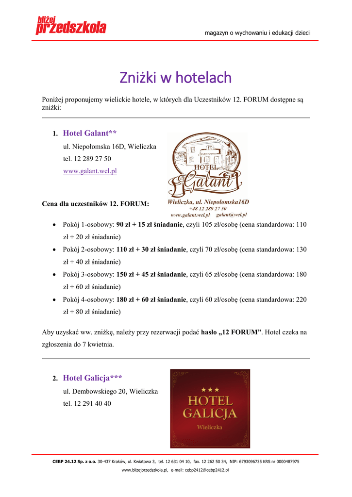 magazyn o wychowaniu i edukacji dzieci Zniżki w hotelach Poniżej proponujemy wielickie hotele, w których dla Uczestników 12. FORUM dostępne są zniżki: 1. Hotel Galant** ul. Niepołomska 16D, Wieliczka tel. 12 289 27 50 www.galant.wel.pl Cena dla uczestników 12. FORUM: Pokój 1-osobowy: 90 zł + 15 zł śniadanie, czyli 105 zł/osobę (cena standardowa: 110 zł + 20 zł śniadanie) Pokój 2-osobowy: 110 zł + 30 zł śniadanie, czyli 70 zł/osobę (cena standardowa: 130 zł + 40 zł śniadanie) Pokój 3-osobowy: 150 zł + 45 zł śniadanie, czyli 65 zł/osobę (cena standardowa: 180 zł + 60 zł śniadanie) Pokój 4-osobowy: 180 zł + 60 zł śniadanie, czyli 60 zł/osobę (cena standardowa: 220 zł + 80 zł śniadanie) Aby uzyskać ww. zniżkę, należy przy rezerwacji podać hasło „12 FORUM”. Hotel czeka na zgłoszenia do 7 kwietnia. 2. Hotel Galicja*** ul. Dembowskiego 20, Wieliczka tel. 12 291 40 40 CEBP 24.12 Sp. z o.o. 30-437 Kraków, ul. Kwiatowa 3, tel. 12 631 04 10, fax. 12 262 50 34, NIP: 6793096735 KRS nr 0000487975 www.blizejprzedszkola.pl, e-mail: [email protected] magazyn o wychowaniu i edukacji dzieci www.hotelgalicja.pl/kontakt Cena dla uczestników 12. FORUM: • 145 zł (za dobę) – pokój 1-osobowy Standard (cena standardowa: 250 zł) • 175 zł (za dobę) – pokój 2-osobowy Standard (cena standardowa: 330 zł) • 245 zł (za dobę) – pokój 3-osobowy Standard (cena standardowa: 380 zł) Cena zawiera śniadanie w formie bufetu szwedzkiego, Vat 8%, dostęp do Wi-fi bez limitu, telewizja satelitarna. Parking GRATIS! Aby uzyskać ww. zniżkę, należy przy rezerwacji podać hasło „12 Forum”. Pobierz ulotkę 3. Hotel SORAY*** ul. Krakowska 14 c, Wieliczka tel. 12 284 33 40 www.soray.pl Cena dla uczestników 12. FORUM: Pokój 1-osobowy – 150 zł/doba Pokój 2-osobowy – 200 zł/doba Ilość pokoi: 40 pokoi 1- lub 2-osobowych (opcja ważna do 7.04.2017 ) Pokoje hotelowe: cena zawiera śniadanie, czas zameldowania od godz. 14:00, czas wymeldowania do godz. 12:00 Śniadanie: serwowane w formie bufetu w Restauracji Hotelowej w godzinach 7:00-10:30 Parking: GRATIS Internet: dostęp do Internetu (Wi-Fi) jest bezpłatny CEBP 24.12 Sp. z o.o. 30-437 Kraków, ul. Kwiatowa 3, tel. 12 631 04 10, fax. 12 262 50 34, NIP: 6793096735 KRS nr 0000487975 www.blizejprzedszkola.pl, e-mail: [email protected] magazyn o wychowaniu i edukacji dzieci Rezerwacje: indywidualnie na hasło 12 FORUM pod numerem telefonu: 12 284 33 40 lub mailowo: [email protected] Rozliczenie: Goście płacą sami za siebie na recepcji Hotelu 4. Turówka Hotel & SPA**** ul. Żeromskiego 1, Wieliczka tel. 12 279 61 00 www.turowka.pl Cena dla uczestników 12. FORUM: • 219 zł (za dobę) – pokój 1-osobowy, cena brutto ze śniadaniem (cena standardowa: 259 zł) • 249 zł (za dobę) – pokój 2-osobowy, cena brutto ze śniadaniem (cena standardowa: 299 zł) Aby uzyskać ww. zniżkę, należy przy rezerwacji podać hasło „12 Forum”. Wszystkie rezerwacje muszą być zagwarantowane – przedpłata przelewem lub preautoryzacja karty. Goście dokonują rezerwacji indywidualnie potwierdzając dostępność w Recepcji hotelu pod nr tel. 12 279 61 00 lub e-mail: [email protected] 5. Hotel Grand Sal**** Park Kingi 7, Wieliczka tel. 12 289 81 10 www.grandsal.pl Cena dla uczestników 12. FORUM: Pokój 1-osobowy – 219 zł/doba CEBP 24.12 Sp. z o.o. 30-437 Kraków, ul. Kwiatowa 3, tel. 12 631 04 10, fax. 12 262 50 34, NIP: 6793096735 KRS nr 0000487975 www.blizejprzedszkola.pl, e-mail: [email protected] magazyn o wychowaniu i edukacji dzieci Pokój 2-osobowy – 259 zł/doba Podane ceny będą obowiązywać do 15.03.2017. Rezerwacje na hasło „BLIŻEJ PRZEDSZKOLA – 12 FORUM”. Dla rezerwacji dokonanych po 15.03.2017 obowiązywać będzie cena dnia. 6. Hotel Lenart**** ul. Narutowicza 1, Wieliczka tel. 12 32 83 100 www.hotellenart.pl Cena dla uczestników 12. FORUM: Pokój 2-osobowy ze śniadaniem: 220 zł netto/doba W cenie bezpłatny parking, WiFi oraz dostęp do strefy SPA. Aby uzyskać ww. zniżkę, należy przy rezerwacji podać hasło „12 FORUM”. Zachęcamy, aby jak najwcześniej rezerwować miejsca noclegowe w hotelach – 12. FORUM odbywa się tuż przed długim weekendem majowym, co może się wiązać ze zwiększoną liczbą Gości hotelowych. Organizatorzy CEBP 24.12 Sp. z o.o. 30-437 Kraków, ul. Kwiatowa 3, tel. 12 631 04 10, fax. 12 262 50 34, NIP: 6793096735 KRS nr 0000487975 www.blizejprzedszkola.pl, e-mail: [email protected]