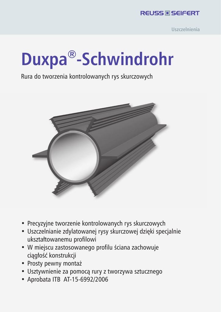Uszczelnienia ® Duxpa -Schwindrohr Rura do tworzenia kontrolowanych rys skurczowych • Precyzyjne tworzenie kontrolowanych rys skurczowych • Uszczelnianie zdylatowanej rysy skurczowej dzięki specjalnie ukształtowanemu profilowi • W miejscu zastosowanego profilu ściana zachowuje ciągłość konstrukcji • Prosty pewny montaż • Usztywnienie za pomocą rury z tworzywa sztucznego • Aprobata ITB AT-15-6992/2006 Duxpa®®-Abstandhalter Drufa -Schwindrohr Zastosowanie Przy tworzeniu dłuższych ścian betonowych, wylewanych jako konstrukcja monolityczna, na skutek kurczenia się betonu dochodzi do niekontrolowanego powstawania szczelin. Dlatego należy podjąć odpowiednie kroki, pozwalające tworzyć rysy skurczowe w sposób kontrolowany. Osiąga się to poprzez osłabienie przekroju poprzecznego w ścianie przy jednoczesnym zachowaniu ciągłości zbrojenia. Montaż Aby osłabić przekrój, rurę Duxpa montuje się w odstępach ok. 6-8 m w środku ściany przeznaczonej do betonowania. Dodatkowo na elementach szalunku przybija się wewnątrz trójkątne lub trapezowe listwy, co pozwala uzyskać szczeliny i odpowiednią estetykę elewacji. Pozycjonowanie i mocowanie rury skurczowej Duxpa na górnym brzegu ściany odbywa się za pomocą drewnianej listwy na szalunku. Na końcu rurę nacina się w środku na ok. 7,5 cm i nasuwa na blachę Duxpa-Fugenblech lub na taśmę do uszczelniania spoin przy zachowaniu 5 cm odstępu do betonowego podkładu lub betonu fundamentowego w celu dobrego podlania betonem (przykład dla blachy nr art. 4433 o wys. 150 mm - patrz szczegół przy drugim zdjęciu). Przy stosowaniu taśm do uszczelniania spoin z PCV bez stalowych wkładek należy włożyć w beton, z tyłu taśmy uszczelniającej ok. 40 cm pasek blachy, która stanowi podparcie rury. Blachę należy instalować w kierunku strony odwodnej. W czasie betonowania do wnętrza rury może się dostać beton, co w przypadku budowy schronów jest nawet konieczne. Rura z tworzywa sztucznego posiadająca profile uszczelniające oraz profile do kontrolowanego tworzenia rys skurczowych w betonowych ścianach. Parametry wytrzymałościowe zostają zachowane ponieważ jest zachowana ciągłość zbrojenia. Zastosowanie tego profilu umożliwia szczelne zdylatowanie ściany bez konieczności wykonywania przerwy roboczej. listwa trapezowa 10 cm D2 ok. 5 cm D3 D1 Połączenie rury skurczowej Duxpa-Schwindrohr z blachą Duxpa-Fugenblech Zamawianie Ø Nr art. Typ Ø (mm) Długość (mm) 4336 SR 85 127 3.000 4337 SR 85 127 5.000 4338 SR 70 111 3.000 Uwaga: Powyższe informacje powstały w najlepszej wierze na podstawie naszych doświadczeń, nie są jednak zobowiązujące. Należy je dostosować odpowiednio do danych obiektów budowlanych, celów zastosowania oraz innych szczególnych miejscowych wymagań (decyzje powinny podejmować uprawnione instytucje lub osoby posiadające uprawnienia - konstruktorzy, projektanci, nadzór budowlany, kierownicy budów ...) W krytycznych miejscach zastosowań należy przeprowadzić próby. Za prawidłowość zamieszczonych danych odpowiadamy w ramach naszych warunków sprzedaży i dostaw. Po ukazaniu się nowego wydania powyższe informacje techniczne stają się nieaktualne. Przedruk powyższych materiałów, również częściowy, jest możliwy wyłącznie za pisemną zgodą producenta. Wszystkie ilustracje w materiałach informacyjnych, reklamowych i dokumentach sprzedaży służą wyłącznie prezentacji produktów. Producent zastrzega sobie prawo do wprowadzania zmian konstrukcyjnych i innych. Większość naszych produktów posiada atesty i aprobaty techniczne. Informacja o produkcie Nr art.: Materiał: Oznaczenie: Kolor: Ø (mm): D1 mm: D2 mm: D3 mm: Długość (m): Do ścian o grubości (cm): 4336 PVC - P SR 85 czarny 85 127 23 3,4 3 ≤ 30 4337 PVC - P SR 85 czarny 85 127 23 3,4 5 ≤ 30 4338 PVC - P SR 70 czarny 70 111 20 4,4 3 Uwaga: przy grubościach ścian 31 - 50 cm można wbudować 2 rury skurczowe SR 85 ul. Piotrkowska 2A • 97-330 Poniatów Telefon 044 610 23 50 • 608 300 316 • Fax 044 610 20 94 www.reuss-seifert.pl • [email protected] www.reuss-seifert.de PL 01/08-28 REUSS-SEIFERT Sp. z o.o.