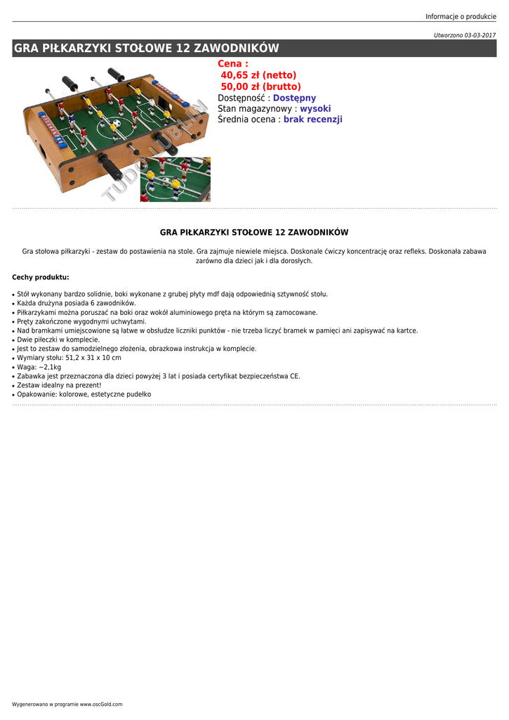 Informacje o produkcie Utworzono 03-03-2017 GRA PIŁKARZYKI STOŁOWE 12 ZAWODNIKÓW Cena : 40,65 zł (netto) 50,00 zł (brutto) Dostępność : Dostępny Stan magazynowy : wysoki Średnia ocena : brak recenzji GRA PIŁKARZYKI STOŁOWE 12 ZAWODNIKÓW Gra stołowa piłkarzyki - zestaw do postawienia na stole. Gra zajmuje niewiele miejsca. Doskonale ćwiczy koncentrację oraz refleks. Doskonała zabawa zarówno dla dzieci jak i dla dorosłych. Cechy produktu: ● ● ● ● ● ● ● ● ● ● ● ● Stół wykonany bardzo solidnie, boki wykonane z grubej płyty mdf dają odpowiednią sztywność stołu. Każda drużyna posiada 6 zawodników. Piłkarzykami można poruszać na boki oraz wokół aluminiowego pręta na którym są zamocowane. Pręty zakończone wygodnymi uchwytami. Nad bramkami umiejscowione są łatwe w obsłudze liczniki punktów - nie trzeba liczyć bramek w pamięci ani zapisywać na kartce. Dwie piłeczki w komplecie. Jest to zestaw do samodzielnego złożenia, obrazkowa instrukcja w komplecie. Wymiary stołu: 51,2 x 31 x 10 cm Waga: ~2,1kg Zabawka jest przeznaczona dla dzieci powyżej 3 lat i posiada certyfikat bezpieczeństwa CE. Zestaw idealny na prezent! Opakowanie: kolorowe, estetyczne pudełko Wygenerowano w programie www.oscGold.com