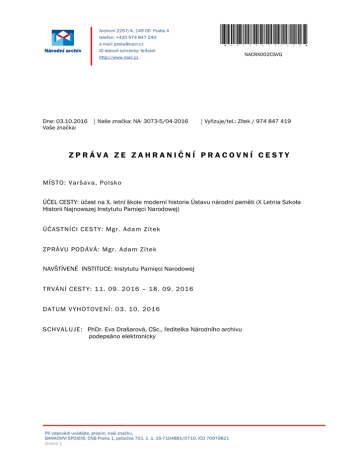Archivní 2257/4, 149 00 Praha 4 telefon: +420 974 847 240 e-mail: [email protected] *NACRX002CSVG* ID datové schránky: fe3aixh NACRX002CSVG http://www.nacr.cz Dne: 03.10.2016 Vaše značka: Naše značka: NA- 3073-5/04-2016 Vyřizuje/tel.: Zítek / 974 847 419 ZPRÁVA ZE ZAHRANIČNÍ PRACOVNÍ CESTY MÍSTO: Varšava, Polsko ÚČEL CESTY: účast na X. letní škole moderní historie Ústavu národní paměti (X Letnia Szkoła Historii Najnowszej Instytutu Pamięci Narodowej) ÚČASTNÍCI CESTY: Mgr. Adam Zítek ZPRÁVU PODÁVÁ: Mgr. Adam Zítek NAVŠTÍVENÉ INSTITUCE: Instytutu Pamięci Narodowej TRVÁNÍ CESTY: 11. 09. 2016 – 18. 09. 2016 DATUM VYHOTOVENÍ: 03. 10. 2016 SCHVALUJE: PhDr. Eva Drašarová, CSc., ředitelka Národního archivu podepsáno elektronicky Při odpovědi uvádějte, prosím, naši značku. BANKOVNÍ SPOJENÍ: ČNB Praha 1, pobočka 701, č. ú. 19-7104881/0710, IČO 70979821 strana 1 TEXT ZPRÁVY ZE ZAHRANIČNÍ PRACOVNÍ CESTY ČÁST VŠEOBECNÁ: Cestu jsem zahájil dne 11. 9. 2016 na Hlavním nádraží v Praze, odkud jsem v 22:00 hod. odjel vlakem do Varšavy, příjezd na místo: 12. 9. 2016 v 06:59 hod. Letní škola se odbývala v hotelu v Palczewě asi 100 km od Varšavy, dopravu na místo zajišťoval pořadatel autobusem. Výjezd z Varšavy byl naplánován na 12:00 hod., po příjezdu do Palczewa následoval oběd. Veškeré stravování i ubytování zajišťoval pořadatel. Po obědě byla za účasti ředitele IPN dr. Jarosława Szarka zahájena X. letní škola moderní historie IPN. Po zahájení podle programu následovala přednáška prof. Marka Kornata a seminář, během kterého účastníci školy prezentovali výsledky svého výzkumu. Ve dnech 13. 9. 2016 – 16. 9. 2016 probíhal program letní školy. Přibližný časový harmonogram (v jednotlivých dnech se mírně lišil): 8:00 – snídaně 9:00 – přednášky či workshopy 13:00 – oběd 14:00 – přednáška 16:00 – seminář 20:00 – večeře ČÁST ODBORNÁ : Účastníci školy měli jedinečnou příležitost vyslechnout si odborné přednášky předních polských historiků, kteří se zabývají moderní historií, na X. letní škole IPN konkrétně přednášeli: prof. Marek Kornat, dr. Łukasz Kamiński, prof. Antoni Dudek, prof. Andrzej Paczkowski, prof. Rafał Stobiecki, prof. Rafał Wnuk, prof. Grzegorz Motyka a prof. Andrzej Friszke. Většina referátů se týkala polských dějin, některé přednášky ale byly věnovány i historii jiných evropských zemí. Kromě velice přínosného odborného výkladu nechyběla ani reflexe archivních pramenů nejen v Polsku, ale i v dalších zemích Evropy. Přiblížením archivních materiálů uložených v Archivu IPN se ve své přednášce zabýval dr. Mariusz Żuławnik z centrálního archivu IPN ve Varšavě. Posluchači byli seznámeni s celkovou strukturou IPN, která je velmi rozsáhlá (centrála, 11 poboček, 6 oddělení). Přínosné bylo rovněž seznámení se s procesem zpřístupňování archivních materiálů, především pak rozdíly mezi postupy v České republice (v Polsku je pro přístup k archivním materiálům vyžadováno doporučení odborné vědecké instituce). Velkou pozornost IPN věnuje digitalizaci archiválií, které – jak dr. Żuławnik zmínil – sice jsou dostupné na internetovém úložišti, na rozdíl od české internetové badatelny ale je studium materiálů možné pouze v badatelnách IPN. Příspěvek dr. Při odpovědi uvádějte, prosím, naši značku. BANKOVNÍ SPOJENÍ: ČNB Praha 1, pobočka 701, č. ú. 19-7104881/0710, IČO 70979821 strana 2 Żuławnika se dále zabýval tvořením databáze polských občanů deportovaných do SSSR a dokumentací sovětských represí. IPN se v tomto směru snaží spolupracovat s archivy a odpovědnými institucemi v Rusku, Bělorusku, Ukrajině, ale též např. v Kazachstánu. Do těchto zemí jsou organizovány pracovní cesty s cílem získat příslušné archivní materiály, v některých zemích ale chybí potřebná vstřícnost ke spolupráci. Databáze obětí sovětských represí je dostupná na stránkách IPN. Zmíněna byla rovněž dokumentace zločinů nacistických. Posluchači byli v tomto ohledu seznámeni s kartotékou z Bad Arolsen, jejíž elektronickou kopií IPN disponuje. Jedná se o velice rozsáhlou kartotéku vzniklou v roce 1955, která obsahuje údaje o obětech koncentračních táborů, gestapa, táborů nucené práce apod. Za velice užitečné považuji rovněž workshopy, které byly součástí letní školy. Přípravou referátu a jeho prezentací se zabýval workshop dr. Rafała Stefańského, během kterého účastníci uslyšeli mnoho cenných rad na téma vystupování. Další workshop se věnoval orální historii, v němž Anka Grupińska představila základní postupy při využívání této metody, konkrétní příklady, metodiku apod. Velkou část programu letní školy zaujímaly semináře, které vedl dr. Władysław Bułhak. Cílem seminářů bylo nejen prezentovat výsledky výzkumu, ale rovněž vést odbornou diskusi na představené téma a získat tak určitou reflexi. Dne 13. 9. 2016 jsem vystoupil s referátem na téma: Antykomunistyczny ruch oporu w Czechosłowacji i Polsce – zarys problematyki w miastach Toruń i Żatec (Protikomunistický odboj v Československu a Polsku – nástin problematiky v městech Toruň a Žatec). X. letní školu moderní historie hodnotím velice pozitivně. Pro mladého začínajícího vědeckého pracovníka je to velmi přínosná zkušenost. Vzrůstající zájem o tuto událost potvrzuje i vysoký počet zájemců, z nichž je vybráno pouze 20 uchazečů, mezi kterými nejsou jen historici, ale rovněž politologové, sociologové či archiváři (převážně studenti PhD.). Po úspěšném zakončení školy dostal každý účastník certifikát o absolvování školy. Přednesené referáty budo