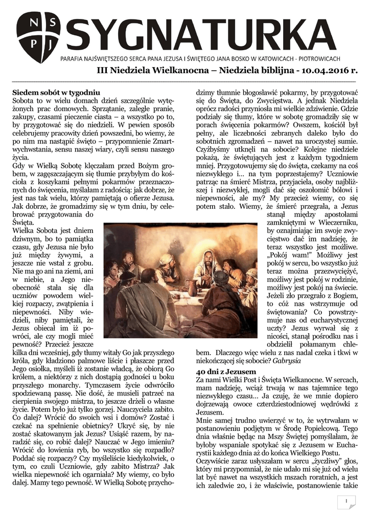 III Niedziela Wielkanocna – Niedziela biblijna - 10.04.2016 r. __________________________________________________________________________________________________________________________________________________________ Siedem sobót w tygodniu Sobota to w wielu domach dzień szczególnie wytężonych prac domowych. Sprzątanie, zaległe pranie, zakupy, czasami pieczenie ciasta – a wszystko po to, by przygotować się do niedzieli. W pewien sposób celebrujemy pracowity dzień powszedni, bo wiemy, że po nim ma nastąpić święto – przypomnienie Zmartwychwstania, sensu naszej wiary, czyli sensu naszego życia. Gdy w Wielką Sobotę klęczałam przed Bożym grobem, w zagęszczającym się tłumie przybyłym do kościoła z koszykami pełnymi pokarmów przeznaczonych do święcenia, myślałam z radością: jak dobrze, że jest nas tak wielu, którzy pamiętają o ofierze Jezusa. Jak dobrze, że gromadzimy się w tym dniu, by celebrować przygotowania do Święta. Wielka Sobota jest dniem dziwnym, bo to pamiątka czasu, gdy Jezusa nie było już między żywymi, a jeszcze nie wstał z grobu. Nie ma go ani na ziemi, ani w niebie, a Jego nieobecność stała się dla uczniów powodem wielkiej rozpaczy, zwątpienia i niepewności. Niby wiedzieli, niby pamiętali, że Jezus obiecał im iż powróci, ale czy mogli mieć pewność? Przecież jeszcze kilka dni wcześniej, gdy tłumy witały Go jak przyszłego króla, gdy kładziono palmowe liście i płaszcze przed Jego osiołka, myśleli iż zostanie władcą, że obiorą Go królem, a niektórzy z nich dostąpią godności u boku przyszłego monarchy. Tymczasem życie odwróciło spodziewaną passę. Nie dość, że musieli patrzeć na cierpienia swojego mistrza, to jeszcze drżeli o własne życie. Potem było już tylko gorzej. Nauczyciela zabito. Co dalej? Wrócić do swoich wsi i domów? Zostać i czekać na spełnienie obietnicy? Ukryć się, by nie zostać skatowanym jak Jezus? Usiąść razem, by naradzić się, co robić dalej? Nauczać w Jego imieniu? Wrócić do łowienia ryb, bo wszystko się rozpadło? Poddać się rozpaczy? Czy myśleliście kiedykolwiek, o tym, co czuli Uczniowie, gdy zabito Mistrza? Jak wielka niepewność ich ogarniała? My wiemy, co było dalej. Mamy tego pewność. W Wielką Sobotę przycho- dzimy tłumnie błogosławić pokarmy, by przygotować się do Święta, do Zwycięstwa. A jednak Niedziela oprócz radości przyniosła mi wielkie zdziwienie. Gdzie podziały się tłumy, które w sobotę gromadziły się w porach święcenia pokarmów? Owszem, kościół był pełny, ale liczebności zebranych daleko było do sobotnich zgromadzeń – nawet na uroczystej sumie. Czyżbyśmy utknęli na sobocie? Kolejne niedziele pokażą, że świętujących jest z każdym tygodniem mniej. Przygotowujemy się do święta, czekamy na coś niezwykłego i… na tym poprzestajemy? Uczniowie patrząc na śmierć Mistrza, przyjaciela, osoby najbliższej i niezwykłej, mogli dać się oszołomić bólowi i niepewności, ale my? My przecież wiemy, co się potem stało. Wiemy, że śmierć przegrała, a Jezus stanął między apostołami zamkniętymi w Wieczerniku, by oznajmiając im swoje zwycięstwo dać im nadzieję, że teraz wszystko jest możliwe. „Pokój wam!” Możliwy jest pokój w sercu, bo wszystko już teraz można przezwyciężyć, możliwy jest pokój w rodzinie, możliwy jest pokój na świecie. Jeżeli zło przegrało z Bogiem, to cóż nas wstrzymuje od świętowania? Co powstrzymuje nas od eucharystycznej uczty? Jezus wyrwał się z nicości, stanął pośrodku nas i obdzielił połamanym chlebem. Dlaczego więc wielu z nas nadal czeka i tkwi w niekończącej się sobocie? Gabrysia 40 dni z Jezusem Za nami Wielki Post i Święta Wielkanocne. W sercach, mam nadzieję, wciąż trwają w nas tajemnice tego niezwykłego czasu… Ja czuję, że we mnie dopiero dojrzewają owoce czterdziestodniowej wędrówki z Jezusem. Mnie samej trudno uwierzyć w to, że wytrwałam w postanowieniu podjętym w Środę Popielcową. Tego dnia właśnie będąc na Mszy Świętej pomyślałam, że byłoby wspaniale spotykać się z Jezusem w Eucharystii każdego dnia aż do końca Wielkiego Postu. Oczywiście zaraz usłyszałam w sercu „życzliwy” głos, który mi przypomniał, że nie udało mi się już od wielu lat być nawet na wszystkich mszach roratnich, a jest ich zaledwie 20, i że właściwie, postanowienie takie 1 jest niewykonalne w mojej sytuacji rodzinnej i w ogóle jest bez sensu, bo wpadnę w rutynę. Gdy zaczęłam powątpiewać, że tak właśnie mam przeżyć tegoroczny Wielki Post, usłyszałam w ten sam dzień od kapłana, że każde nasze postanowienie wielkopostne będzie Panu Bogu miłe, a nam potrzebne, o ile oddamy je Panu Bogu pod opiekę i poprosimy Go o pomoc. No i tak też zrobiłam. Pierwszy tydzień był czasem walki z własnym lenistwem i niezdecydowaniem. Gdy z Bożą pomocą udało mi się pokonać trudności, nagle, z dnia na dzień, okazało się, że wszystko tak się układa, żebym mogła rano lub wieczorem pójść na Mszę. I tak już było do końca. Nie wiem, w którym momencie przestałam myśleć o wyjściu na Mszę w kategoriach zobowiązania. Zamiast znużenia, poczucia rutyny i ciężaru, pojawiła się ciekawość Słowa Bożego i tęsknota za Jezusem. Każdy dzień przynosił nowe Słowo do przemyślenia, które towarzyszyło mi aż do wieczora. Zadziwiał mnie zwłaszcza Stary Testament, który znam bardzo słabo i tak, np. wielkim zaskoczeniem była dla mnie historia Zuzanny. Nawet nie wiedziałam, że w Biblii jest wymieniane takie imię (Dn 13,163). Z Nowego Testamentu zapadł mi w pamięć najbardziej cykl Ewangelii, w których Jezus rozmawiał z faryzeuszami, nieustannie wystawiającymi Go na próbę i szukającymi powodów do oskarżenia. Po raz pierwszy poczułam, jak atmosfera wokół Jezusa zagęszcza się z każdą chwilą… Zauważyłam też, że wiele osób przy