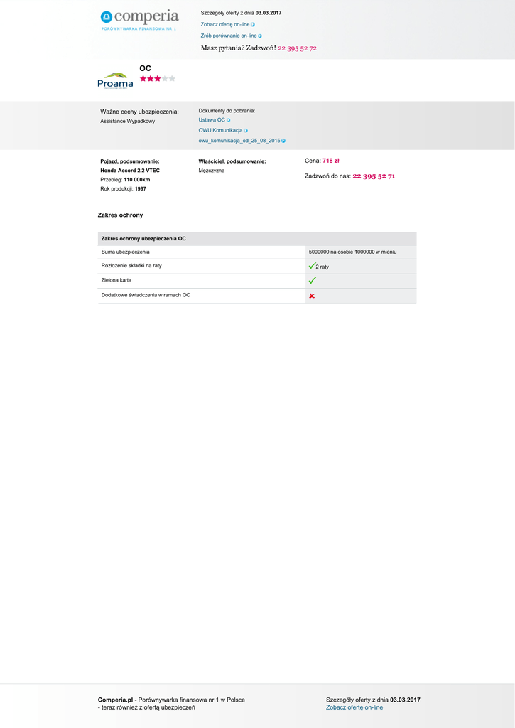 Szczegóły oferty z dnia 03.03.2017 Zobacz ofertę on-line Zrób porównanie on-line Masz pytania? Zadzwoń! 22 395 52 72 OC Ważne cechy ubezpieczenia: Dokumenty do pobrania: Assistance Wypadkowy Ustawa OC OWU Komunikacja owu_komunikacja_od_25_08_2015 Pojazd, podsumowanie: Właściciel, podsumowanie: Honda Accord 2.2 VTEC Mężczyzna Przebieg: 110 000km Cena: 718 zł Zadzwoń do nas: 22 395 52 71 Rok produkcji: 1997 Zakres ochrony Zakres ochrony ubezpieczenia OC Suma ubezpieczenia Rozłożenie składki na raty 5000000 na osobie 1000000 w mieniu 2 raty Zielona karta Dodatkowe świadczenia w ramach OC Comperia.pl - Porównywarka finansowa nr 1 w Polsce - teraz również z ofertą ubezpieczeń Powered by TCPDF (www.tcpdf.org) Szczegóły oferty z dnia 03.03.2017 Zobacz ofertę on-line