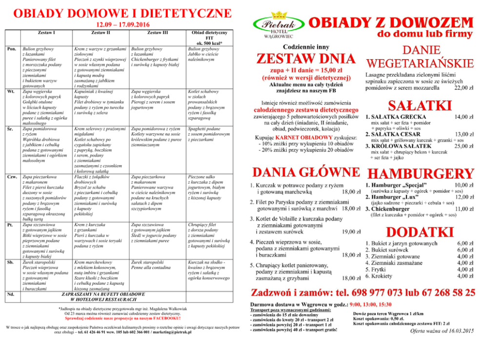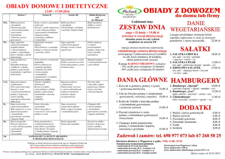 OBIADY DOMOWE I DIETETYCZNE 12.09 – 17.09.2016 Zestaw I Pon. Wt. Śr. Czw. Pt. Sb. Nd. Zestaw II Bulion grzybowy z łazankami Panierowany filet z morszczuka podany z pieczonymi ziemniakami i bukietem warzyw gotowanych Zupa węgierska z kolorowych papryk Gołąbki otulone w liściach kapusty podane z ziemniakami puree i sałatką z ogórka małosolnego Zupa pomidorowa z ryżem Wątróbka drobiowa z jabłkiem i cebulką podana z gotowanymi ziemniakami i ogórkiem małosolnym Zestaw III Obiad dietetyczny FIT ok. 500 kcal* Bulion grzybowy Jabłko w cieście naleśnikowym Krem z warzyw z grzankami ziołowymi Pieczeń z szynki wieprzowej w sosie własnym podana z gotowanymi ziemniakami i kapustą modrą zasmażaną z jabłkiem i rodzynkami Kapuśniak z kwaśnej kapusty Filet drobiowy w tymianku podany z ryżem po turecku i surówką z selera Bulion grzybowy z łazankami Chickenburger z frytkami i surówką z kapusty białej Zupa węgierska z kolorowych papryk Pierogi z serem i sosem jogurtowym Kotlet schabowy w ziołach prowansalskich podany z brązowym ryżem i fasolką szparagową Krem selerowy z prażonymi migdałami Kotlet schabowy po cygańsku zapiekany z papryką, boczkiem i serem, podany z ziemniakami zasmażanymi z czosnkiem i kolorową sałatką Flaczki z żołądków drobiowych Bryzol ze schabu z pieczarkami i cebulką podany z gotowanymi ziemniakami i surówką z kapusty pekińskiej Zupa pomidorowa z ryżem Kotlety warzywne na sosie królewskim podane z puree ziemniaczanym Spaghetti podane z sosem pomidorowym z pieczarkami Zupa pieczarkowa Zupa pieczarkowa z makaronem z makaronem Filet z piersi kurczaka Panierowane warzywa duszony w sosie w cieście naleśnikowym z suszonych pomidorów podane na kruchych podany z brązowym sałatach z dipem ryżem i fasolką szczypiorkowym szparagową okraszoną bułką tartą Zupa szczawiowa Krem z kurczaka Zupa szczawiowa z gotowanym jajkiem z grzankami z gotowanym jajkiem Bitki wieprzowe w sosie Pierś z kurczaka w Śledź w jogurcie podany pieprzowym podane warzywach i sosie teryaki z ziemniakami puree z ziemniakami podana z ryżem gotowanymi i surówką z kapusty białej Żurek staropolski Krem marchewkowy Żurek staropolski Pieczeń wieprzowa z mlekiem kokosowym, Penne alla contadina w sosie własnym podana nutą imbiru i grzankami z gotowanymi Szare kluski z boczkiem ziemniakami i cebulką podane z kapustą i buraczkami kiszoną zasmażaną ZAPRASZAMY NA BUFETY OBIADOWE W HOTELOWEJ RESTAURACJI Pieczone udko z kurczaka z dipem jogurtowym, białym ryżem i surówką z kiszonej kapusty Chrupiący filet z dorsza podany z ziemniakami gotowanymi i surówką z kapusty pekińskiej Kurczak na słodko kwaśno z brązowym ryżem i sałatką z ogórka konserwowego *Jadłospis na obiady dietetyczne przygotowała mgr inż. Magdalena Walkowiak Od 23 marca można również zamawiać całodzienny zestaw dietetyczny. Sprawdzaj codziennie nasze propozycje na naszym FACEBOOKU! W trosce o jak najlepszą obsługę oraz zaspokojenie Państwa oczekiwań kulinarnych prosimy o rzetelne opinie i uwagi dotyczące naszych potraw oraz obsługi – tel. 61 426 46 91 wew. 105 lub 602 366 001 / [email protected]