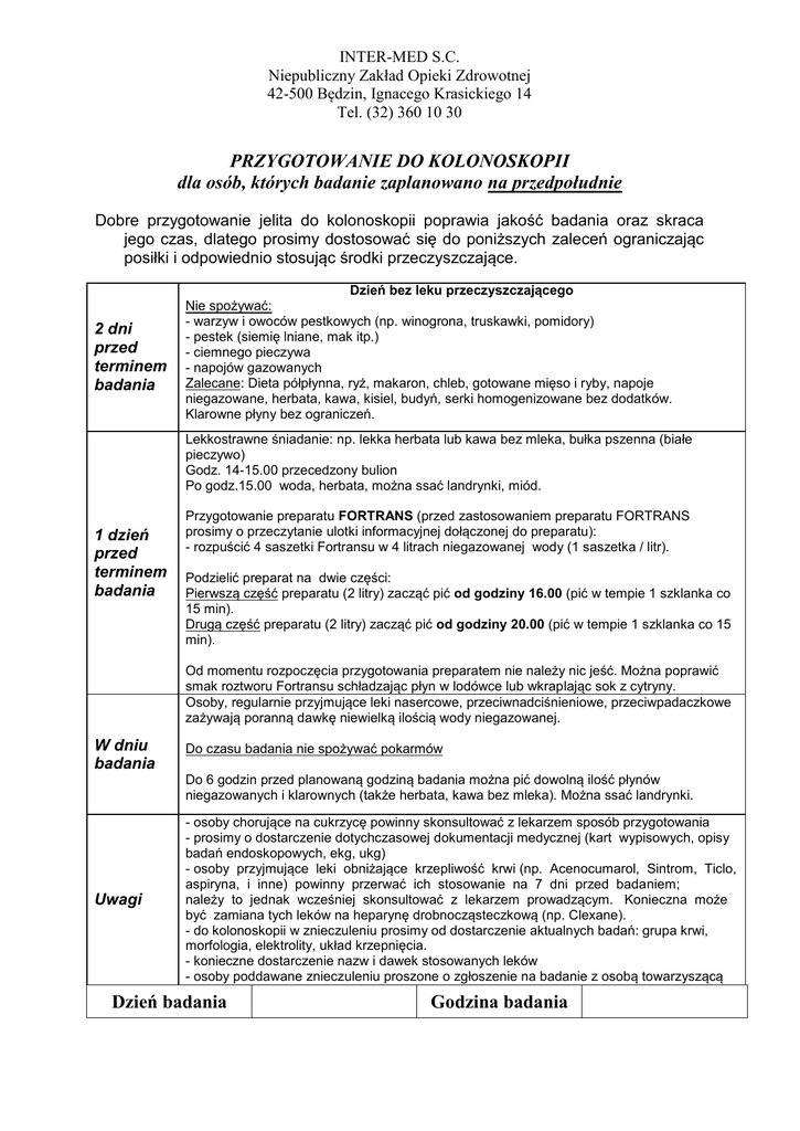 INTER-MED S.C. Niepubliczny Zakład Opieki Zdrowotnej 42-500 Będzin, Ignacego Krasickiego 14 Tel. (32) 360 10 30 PRZYGOTOWANIE DO KOLONOSKOPII dla osób, których badanie zaplanowano na przedpołudnie Dobre przygotowanie jelita do kolonoskopii poprawia jakość badania oraz skraca jego czas, dlatego prosimy dostosować się do poniższych zaleceń ograniczając posiłki i odpowiednio stosując środki przeczyszczające. 2 dni przed terminem badania Dzień bez leku przeczyszczającego Nie spożywać: - warzyw i owoców pestkowych (np. winogrona, truskawki, pomidory) - pestek (siemię lniane, mak itp.) - ciemnego pieczywa - napojów gazowanych Zalecane: Dieta półpłynna, ryż, makaron, chleb, gotowane mięso i ryby, napoje niegazowane, herbata, kawa, kisiel, budyń, serki homogenizowane bez dodatków. Klarowne płyny bez ograniczeń. Lekkostrawne śniadanie: np. lekka herbata lub kawa bez mleka, bułka pszenna (białe pieczywo) Godz. 14-15.00 przecedzony bulion Po godz.15.00 woda, herbata, można ssać landrynki, miód. 1 dzień przed terminem badania Przygotowanie preparatu FORTRANS (przed zastosowaniem preparatu FORTRANS prosimy o przeczytanie ulotki informacyjnej dołączonej do preparatu): - rozpuścić 4 saszetki Fortransu w 4 litrach niegazowanej wody (1 saszetka / litr). Podzielić preparat na dwie części: Pierwszą część preparatu (2 litry) zacząć pić od godziny 16.00 (pić w tempie 1 szklanka co 15 min). Drugą część preparatu (2 litry) zacząć pić od godziny 20.00 (pić w tempie 1 szklanka co 15 min). Od momentu rozpoczęcia przygotowania preparatem nie należy nic jeść. Można poprawić smak roztworu Fortransu schładzając płyn w lodówce lub wkraplając sok z cytryny. Osoby, regularnie przyjmujące leki nasercowe, przeciwnadciśnieniowe, przeciwpadaczkowe zażywają poranną dawkę niewielką ilością wody niegazowanej. W dniu badania Uwagi Do czasu badania nie spożywać pokarmów Do 6 godzin przed planowaną godziną badania można pić dowolną ilość płynów niegazowanych i klarownych (także herbata, kawa bez mleka). Można ssać landrynki. - osoby chorujące na cukrzycę powinny skonsultować z lekarzem sposób przygotowania - prosimy o dostarczenie dotychczasowej dokumentacji medycznej (kart wypisowych, opisy badań endoskopowych, ekg, ukg) - osoby przyjmujące leki obniżające krzepliwość krwi (np. Acenocumarol, Sintrom, Ticlo, aspiryna, i inne) powinny przerwać ich stosowanie na 7 dni przed badaniem; należy to jednak wcześniej skonsultować z lekarzem prowadzącym. Konieczna może być zamiana tych leków na heparynę drobnocząsteczkową (np. Clexane). - do kolonoskopii w znieczuleniu prosimy od dostarczenie aktualnych badań: grupa krwi, morfologia, elektrolity, układ krzepnięcia. - konieczne dostarczenie nazw i dawek stosowanych leków - osoby poddawane znieczuleniu proszone o zgłoszenie na badanie z osobą towarzyszącą Dzień badania Godzina badania
