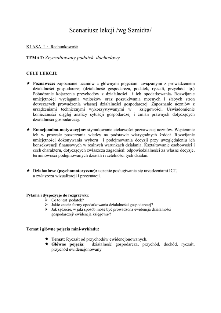 Scenariusz lekcji /wg Szmidta/ KLASA I : Rachunkowość TEMAT: Zryczałtowany podatek dochodowy CELE LEKCJI: Poznawcze: zapoznanie uczniów z głównymi pojęciami związanymi z prowadzeniem działalności gospodarczej (działalność gospodarcza, podatek, ryczałt, przychód itp.) Pobudzanie kojarzenia przychodów z działalności i ich opodatkowania. Rozwijanie umiejętności wyciągania wniosków oraz poszukiwania mocnych i słabych stron dotyczących prowadzenia własnej działalności gospodarczej. Zapoznanie uczniów z urządzeniami technicznymi wykorzystywanymi w księgowości. Uświadomienie konieczności ciągłej analizy sytuacji gospodarczej i zmian prawnych dotyczących działalności gospodarczej. Emocjonalno-motywacyjne: stymulowanie ciekawości poznawczej uczniów. Wspieranie ich w procesie poszerzania wiedzy na podstawie wiarygodnych źródeł. Rozwijanie umiejętności dokonywania wyboru i podejmowania decyzji przy uwzględnieniu ich konsekwencji finansowych w realnych warunkach działania. Kształtowanie osobowości i cech charakteru, dotyczących zwłaszcza zagadnień: odpowiedzialności za własne decyzje, terminowości podejmowanych działań i rzetelności tych działań. Działaniowe (psychomotoryczne): uczenie posługiwania się urządzeniami ICT, a zwłaszcza wizualizacji i prezentacji. Pytania i dyspozycje do rozgrzewki: Co to jest podatek? Jakie znacie formy opodatkowania działalności gospodarczej? Jak sądzicie, w jaki sposób może być prowadzona ewidencja działalności gospodarczej/ ewidencja księgowa/? Temat i główne pojęcia mini-wykładu: Temat: Ryczałt od przychodów ewidencjonowanych. Główne pojęcia: działalność gospodarcza, przychód, dochód, ryczałt, przychód ewidencjonowany. Opis ćwiczenia 1: Tytuł: Ryczałt Cele: Umiejętność ustalania stawki ryczałtu na podstawie rodzaju prowadzonej działalności gospodarczej oraz określenia rodzajów działalności wyłączonych z ryczałtu. Czas trwania: 20 minut Pomoce: podręcznik, Internet- ustawa o zryczałtowanym podatku zryczałtowanym, długopisy i kartki Aranżacja przestrzeni: ćwiczenia przy stanowiskach komputerowych w dwuosobowych grupach Przebieg ćwiczenia: Uczniowie zapoznają się z informacjami zawartymi w podręczniku przedmiotowym a następnie wyszukują informacje zawarte w ustawie oraz w załączniku do ustawy. Zapisują na kartkach stawki ryczałtu oraz odpowiadające im rodzaje działalności gospodarczej. Pytania i dyspozycje do omówienia ćwiczenia: Każda grupa czyta swoje notatki sporządzone na podstawie Internetu. Pozostałe grupy sprawdzają poprawność odczytywanych informacji. Na zakończenie nauczyciel pyta czy uzyskanie informacji na podstawie ustawy sprawiało trudności? Opis ćwiczenia 1: Tytuł: Formy ewidencji przy podatku zryczałtowanym Cele: Umiejętność ewidencji zdarzeń gospodarczych w ewidencji przychodów Czas trwania: 15 minut Pomoce: podręcznik, zeszyty przedmiotowe, długopisy Przebieg ćwiczenia: Uczniowie zapoznają się z informacjami zawartymi w podręczniku przedmiotowym dotyczącymi zasad ujmowania zdarzeń gospodarczych w ewidencji przychodów. Nauczyciel krótko omawia wiadomości zawarte w podręczniku, objaśnia różnice w ewidencji u podmiotów będących podatnikami VAT i nie będących podatnikami VAT. Następnie wspólnie z nauczycielem analizują i zapisują zdarzenia na przykładzie konkretnego podmiotu gospodarczego / ćwiczenie z podręcznika przedmiotowego/ po uprzednim określeniu stawki ryczałtu dla danego rodzaju działalności. Pytania i dyspozycje do omówienia ćwiczenia: Uczniowie podsumowują wykonane ćwiczenie, przedstawiają swoje uwagi i spostrzeżenia dotyczące zasad ewidencji zdarzeń gospodarczych przy ryczałcie ewidencjonowanym. Pytania i zagadnienia do podsumowania lekcji: Czego dowiedziałeś się na podstawie dzisiejszego ćwiczenia? Czy Twoim zdaniem ewidencja księgowa obowiązująca ewidencjonowanym jest trudna ? przy ryczałcie Treść zadania domowego: Napisz kilka zdarzeń gospodarczych dla wybranego podmiotu gospodarczego opodatkowanego w formie ryczałtu, które miały miejsce w jednym miesiącu i dokonaj ich rejestracji w ewidencji przychodów otrzymanej od nauczyciela/ kserokopia strony z ewidencji przychodów /. Podlicz wszystkie zarejestrowane przychody. Opracowała: Joanna Drabik Zespół Szkół Zawodowych nr 1 w Strzelcach Opolskich