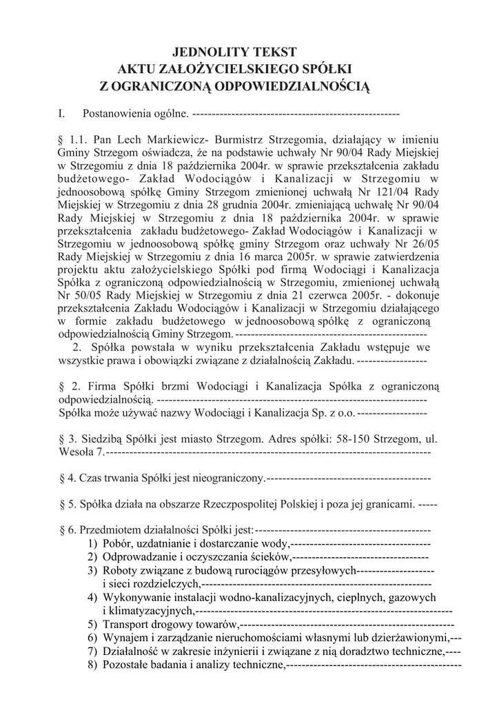 JEDNOLITY TEKST AKTU ZAŁOŻYCIELSKIEGO SPÓŁKI Z OGRANICZONĄ ODPOWIEDZIALNOŚCIĄ I. Postanowienia ogólne. ----------------------------------------------------- § 1.1. Pan Lech Markiewicz- Burmistrz Strzegomia, działający w imieniu Gminy Strzegom oświadcza, że na podstawie uchwały Nr 90/04 Rady Miejskiej w Strzegomiu z dnia 18 października 2004r. w sprawie przekształcenia zakładu budżetowego- Zakład Wodociągów i Kanalizacji w Strzegomiu w jednoosobową spółkę Gminy Strzegom zmienionej uchwałą Nr 121/04 Rady Miejskiej w Strzegomiu z dnia 28 grudnia 2004r. zmieniającą uchwałę Nr 90/04 Rady Miejskiej w Strzegomiu z dnia 18 października 2004r. w sprawie przekształcenia zakładu budżetowego- Zakład Wodociągów i Kanalizacji w Strzegomiu w jednoosobową spółkę gminy Strzegom oraz uchwały Nr 26/05 Rady Miejskiej w Strzegomiu z dnia 16 marca 2005r. w sprawie zatwierdzenia projektu aktu założycielskiego Spółki pod firmą Wodociągi i Kanalizacja Spółka z ograniczoną odpowiedzialnością w Strzegomiu, zmienionej uchwałą Nr 50/05 Rady Miejskiej w Strzegomiu z dnia 21 czerwca 2005r. - dokonuje przekształcenia Zakładu Wodociągów i Kanalizacji w Strzegomiu działającego w formie zakładu budżetowego w jednoosobową spółkę z ograniczoną odpowiedzialnością Gminy Strzegom. ------------------------------------------------2. Spółka powstała w wyniku przekształcenia Zakładu wstępuje we wszystkie prawa i obowiązki związane z działalnością Zakładu. -----------------§ 2. Firma Spółki brzmi Wodociągi i Kanalizacja Spółka z ograniczoną odpowiedzialnością. --------------------------------------------------------------------Spółka może używać nazwy Wodociągi i Kanalizacja Sp. z o.o. -----------------§ 3. Siedzibą Spółki jest miasto Strzegom. Adres spółki: 58-150 Strzegom, ul. Wesoła 7.----------------------------------------------------------------------------------§ 4. Czas trwania Spółki jest nieograniczony.-----------------------------------------§ 5. Spółka działa na obszarze Rzeczpospolitej Polskiej i poza jej granicami. ----§ 6. Przedmiotem działalności Spółki jest:--------------------------------------------1) Pobór, uzdatnianie i dostarczanie wody,-----------------------------------2) Odprowadzanie i oczyszczania ścieków,----------------------------------3) Roboty związane z budową rurociągów przesyłowych-------------------i sieci rozdzielczych,----------------------------------------------------------4) Wykonywanie instalacji wodno-kanalizacyjnych, cieplnych, gazowych i klimatyzacyjnych,-----------------------------------------------------------------5) Transport drogowy towarów,------------------------------------------------------6) Wynajem i zarządzanie nieruchomościami własnymi lub dzierżawionymi,--7) Działalność w zakresie inżynierii i związane z nią doradztwo techniczne,---8) Pozostałe badania i analizy techniczne,--------------------------------------------- 9) Wynajem i dzierżawa maszyn i urządzeń budowlanych,------------------------10) Wynajem i dzierżawa pozostałych maszyn, urządzeń oraz dóbr --------------materialnych, gdzie indziej niesklasyfikowane.----------------------------------II. Kapitał Spółki.-------------------------------------------------------------------- § 7.1. Kapitał zakładowy Spółki wynosi 37.574.800zł /słownie złotych: trzydzieści siedem milionów pięćset siedemdziesiąt cztery tysiące osiemset/ i dzieli się na 375.748 udziałów o wartości 100 zł /słownie złotych: sto/ każdy.---2. Wszystkie udziały wymienione w ust. 1 obejmuje Gmina Strzegom i pokrywa je wkładami rzeczowymi wymienionymi w załączniku Nr 1, stanowiącym integralną część niniejszego aktu, wycenionymi na kwotę 37.574.800zł /słownie złotych: trzydzieści siedem milionów pięćset siedemdziesiąt cztery tysiące osiemset/.---------------------------------------------------------------------------------3. Kapitał zakładowy Spółki może być podwyższony do kwoty 60.000.000zł /słownie złotych: sześćdziesiąt milionów/ w drodze uchwały Zgromadzenia Wspólników w terminie do dnia 1 kwietnia 2015r. Podwyższenie kapitału w tym trybie nie stanowi zmiany umowy Spółki.--------------------------------------------4. Podstawą do ustalenia wielkości aktywów i pasywów bilansu otwarcia Spółki, poza wielkością kapitału zakładowego jest bilans zamknięcia na dzień przekształcenia zakładu budżetowego- Zakład Wodociągów i Kanalizacji w Strzegomiu. ------------------------------------------------------------------------------5. Spółka, jako następca prawny przejmuje należności i zobowiązania zakładu budżetowego- Zakład Wodociągów i Kanalizacji w Strzegomiu. ------------------6. Prawo zarządu gruntem zakładu budżetowego przekształconego w Spółkę staje się prawem użytkowania wieczystego Spółki. ---------------------------------§ 8. 1. Udziały są równe i niepodzielne.------------------------------------- ---------2. Wspólnik może posiadać więcej niż jeden udział. ----------------------- ---------3. Na każdy udział przypada jeden głos w Zgromadzeniu Wspólników.------------4. Zbycie udziałów uzależnione jest od wyrażenia zgody przez Radę Miejską w Strzegomiu w formie uchwały. ------------------------------------------------------III. Władze Spółki. ---------------------------------------------------------------------§ 9. Władzami Spółki są: ----------------------------------------------------------------1) Zarząd Spółki.-------------------------------------------------------------------------2) Rada Nadzorcza.----------------------------------------------------------------------3) Zgromadzenie Wspólników.--------------------------------------------------------§ 10.1. Zarząd Spółki składa się z jednego do trzech członków. --------------------2. Powoływanie i odwoływanie członkó