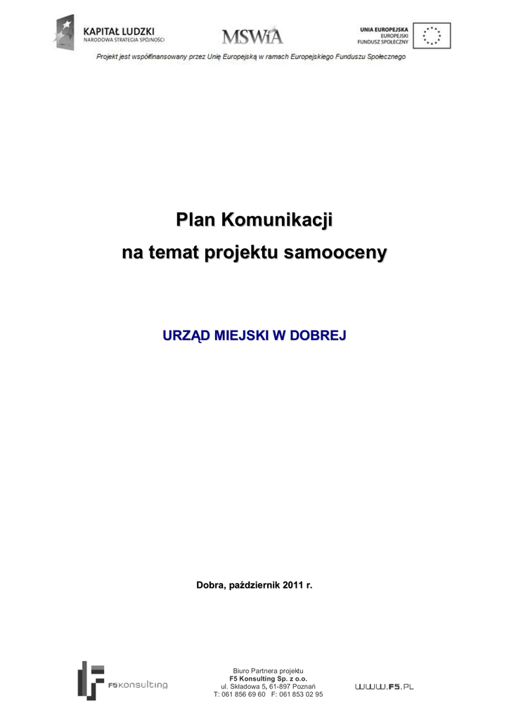 Plan Komunikacji na temat projektu samooceny URZĄD MIEJSKI W DOBREJ Dobra, październik 2011 r. Biuro Partnera projektu F5 Konsulting Sp. z o.o. ul. Składowa 5, 61-897 Poznań T: 061 856 69 60 F: 061 853 02 95 SPIS TREŚCI: WPROWADZENIE ................................ ................................ ............................. 3 1. Projekt wdrożenia metody CAF w Urzędzie ................................ ............ 3 2. Plan komunikacji uczestników wdrożenia metody CAF w Urzędzie ................................ ................................ ................................ . 4 2.1. Zainteresowane strony................................ ................................ ............. 4 2.2. Potrzeby informacyjne ................................ ................................ ............. 4 2.3. Dostawca informacji................................ ................................ ................. 5 2.4. Częstotliwość dostarczania komunikatów nt. projektu ......................... 5 2.5. Metody komunikacji ................................ ................................ ................. 5 3. Mobilizacja pracowników Urzędu na rzecz zaangażowania w proces samooceny ................................ ................................ ............... 6 Biuro Partnera projektu F5 Konsulting Sp. z o.o. ul. Składowa 5, 61-897 Poznań T: 061 856 69 60 F: 061 853 02 95 2 WPROWADZENIE Celem niniejszego dokumentu jest określenie planu komunikacji dla projektu wdrożenia metody CAF w Urzędzie Miejskim w Dobrej. W szczególności w dokumencie określone zostaną: o cel projektu wdrożenia metody CAF, o strony zainteresowane projektem oraz ich potrzeby komunikacyjne, o sposób, forma i częstotliwość informacji na temat realizowanego projektu przekazywanej poszczególnym grupom odbiorców, o sposób mobilizacji pracowników na rzecz zaangażowania w proces samooceny. 1. Projekt wdrożenia metody CAF w Urzędzie Powszechny Model Oceny – CAF (ang. Common Assesment Framework) jest narzędziem przeznaczonym dla jednostek administracji publicznej, mającym na celu poprawę zarządzania. Model skupia się przeprowadzeniu samooceny, identyfikacji obszarów doskonalenia oraz wprowadzaniu wymaganych usprawnień zarządczych. Metoda samooceny proponowana w ramach CAF opiera się na założeniu, iż osiągnięcie pożądanych rezultatów działań urzędu zależy od jakości przywództwa, wpływającego na politykę i strategię organizacji, zarządzanie zasobami ludzkimi, działania w zakresie nawiązywania związków partnerskich, zasoby i procesy zarządzania zmianą. Dzięki CAF organizacje wyrażające chęć wdrożenia systematycznego procesu doskonalenia swoich działań uzyskują proste, przystosowane do specyfiki sektora administracji publicznej, narzędzie samooceny. Samoocena oparta o model CAF dostarcza informacji będących podstawą do doskonalenia funkcjonowania urzędu, poprzez: o identyfikację mocnych stron, o identyfikację obszarów do doskonalenia, o opracowanie i wdrożenie zbioru dobrych praktyk, o możliwość porównania wyników z innymi jednostkami administracji publicznej z terenu Polski oraz innych państw członkowskich Unii Europejskiej (benchmarking), o przygotowanie urzędu do aplikowania o nagrody jakości. Biuro Partnera projektu F5 Konsulting Sp. z o.o. ul. Składowa 5, 61-897 Poznań T: 061 856 69 60 F: 061 853 02 95 3 2. Plan komunikacji uczestników wdrożenia metody CAF w Urzędzie 2.1. Zainteresowane strony 2.1. Zainteresowane strony. Lista zainteresowanych stron w projekcie wdrożenia metody CAF w Urzędzie oraz ich zaangażowanie w poszczególnych etapach projektu: Harm onog ram samo ocen y Upowsze chnienie informacji o projekcie samooce ny Planow anie proces u samooc eny Prze prow adze nie samo ocen y Wyniki samoo ceny Planow anie doskon alenia Sporząd zenie projektu „planu doskona lenia” Realiza cja projektu „planu doskon alenia” Sprawd zenie realizac ji działani a Burmistrz i i d i i u/d u/d i i i Kierownicy i i, r u i i u u i, r I i Koordynator CAF i i, r u u u u r n n r Członkowie grupy CAF i i u u u u u i I I Pracownicy i i i i i i i r i i Wyniki realizacji działania Legenda: d – podejmowanie decyzji i – otrzymywanie informacji o danym etapie działań n – nadzór nad realizacją r – realizacja zaplanowanych zadań u – uczestnictwo w danym etapie procesu samooceny 2 .2 . Potrzeby informacyjne Wymagania dotyczące zakresu przekazywanych informacji dla każdej z wymienionych powyżej grup odbiorców informacji będą się nieco różnić. Najszersze wymagania w zakresie potrzeb informacyjnych będą w stosunku do Kierownictwa JST, członków Grupy Samooceny, pracowników JST, a mniejsze wymogi wobec np. klientów. Informacje wewnątrz JST będą dostarczane w trakcie bezpośrednich spotkań, za pośrednictwem strony internetowej oraz poczty e-mail. Dla celów informowania o projekcie klientów JST (obywateli) zostaną zamieszczone informacje nt. samego faktu wdrażania w JST metody CAF oraz korzyści z tego płynących dla społeczeństwa, jak również wyników z realizacji projektu (po jego zakończeniu) na stronie internetowej JST oraz na tablicy ogłoszeń – obok plakatu promującego projekt. W przypadku pracowników JST – można Biuro Partnera projektu F5 Konsulting Sp. z o.o. ul. Składowa 5, 61-897 Poznań T: 061 856 69 60 F: 061 853 02 95 4 założyć przekazywanie krótkiej informacji nt. podejmowanych w projekcie działań (np. streszczenie sprawozdania z wyników samooceny). W przypadku Kierownictwa JST – przekazywanie informacji w formie pełnej (kompletne sprawozdanie z wyników samooceny). 2 .3 . Dostawca informacji Dostawcą informacji nt. projektu wdrożenia CAF jest Koordynator CAF (Kierownik Projektu). W przypadku, gdyby źródłem przekazywanej informacji miały być inne osoby, należy się upewnić, iż informacja ta jest dokładna, sporządzona zgodnie z wymogami określonymi w Planie Komun