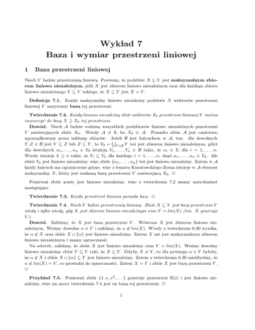 Przyklad 7.5. Ponieważ zbiór {1, x, x2 , . . . } generuje przestrzeń R[x] i jest liniowo niezależny, wiec