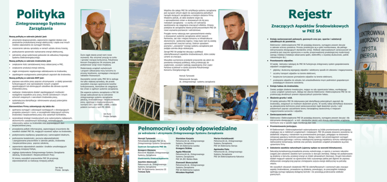 Polityka Zintegrowanego Systemu Zarządzania Przyjęte normy nakazują nam upowszechnianie wiedzy o stosowanym systemie zarządzania wśród naszych Partnerów, zaś rola i miejsce koncernu w infrastrukturze ekonomiczno społecznej regionu i kraju każe nam tę wiedzę upowszechniać znacznie szerzej. Dobrym sposobem poznania i „oswojenia” nowego systemu zarządzania jest podjęta szeroka akcja edukacyjna. Naszą polityką w zakresie jakości jest: • utrzymanie dyspozycyjności, zapewnienie ciągłości dostaw oraz parametrów produkowanej energii elektrycznej i ciepła oraz innych mediów odpowiednio do wymagań Klientów, • rozszerzenie zakresu sprzedaży w ramach udziału strony trzeciej, • podwyższenie sprawności wytwarzania energii elektrycznej, • wdrożenie usługi systemowej gotowości do odbudowy Krajowego Systemu Elektroenergetycznego. Naszą polityką w zakresie środowiska jest: • zwiększenie ilości zainstalowanej mocy odsiarczanej w PKE, • zwiększenie produkcji energii zielonej, • ciągłe zmniejszanie negatywnego oddziaływania na środowisko, • zapobieganie występowaniu potencjalnych zagrożeń dla środowiska. Naszą polityką w zakresie BHP jest: • • • poprawa warunków pracy poprzez utrzymywanie w stałej sprawności funkcjonujących oraz wprowadzanie nowych urządzeń ograniczających lub eliminujących szkodliwe dla zdrowia czynniki środowiska pracy, realizacja i doskonalenie działań zapobiegających możliwości wystąpienia wypadków przy pracy, chorób zawodowych i innych schorzeń związanych z warunkami środowiska pracy, systematyczna identyfikacja i eliminowanie sytuacji potencjalnie wypadkowych. Kierownictwo Firmy zobowiązuje się także do: • spełniania wymagań i zobowiązań wynikających z obowiązujących przepisów prawnych i norm, w szczególności dotyczących ochrony środowiska i bezpieczeństwa pracy oraz zawartych kontraktów, Życie ciągle stawia przed nami nowe wyzwania. Aby utrzymać pozycję na rynku i sprostać rosnącej konkurencji, Południowy Koncern Energetyczny SA zmuszony jest podejmować wciąż nowe inicjatywy. Modernizacja urządzeń wytwórczych i program odtwarzania mocy koncernu to procesy kosztowne, wymagające znaczących nakładów finansowych. Zarząd PKE SA podjął też decyzję o publikacji zidentyfikowanych aspektów środowiskowych, które zostały uznane za znaczące. Wszystkie wymienione przesłanki przyczyniły się zatem do powstania niniejszej publikacji, którą przekazując do wiadomości, wyrażam nadzieję zaspokojenia choć części Państwa oczekiwań w dziele poznania Południowego Koncernu Energetycznego SA. Zauważalny wzrost zysku PKE SA to zasługa nie tylko większej sprzedaży, ale przede wszystkim znaczące ograniczenie kosztów funkcjonowania, niemożliwe do osiągnięcia bez zmian w ogólnym systemie zarządzania. W każdej Jednostce należącej do PKE SA funkcjonuje zintegrowany system gospodarowania odpadami uwzględniający: * głęboką i skuteczną segregację odpadów i selektywny sposób ich zbierania i magazynowania, * szczelny transport odpadów na terenie elektrowni, * bezpieczne tymczasowe gromadzenie odpadów na terenie elektrowni, Pełnomocnik Zarządu ds. zintegrowanego systemu zarządzania * przekazanie odpadów do odzysku lub unieszkodliwienia innym podmiotom gospodarczym posiadającym stosowne zezwolenia. W każdej jednostce PKE SA dokonywana jest identyfikacja potencjalnych zagrożeń dla środowiska, związanych ze możliwym skażeniem gruntu. W wyniku takiej identyfikacji stosowane są zabezpieczenia techniczne przed zanieczyszczeniem bądź skażeniem gruntu i wód podziemnych poprzez uszczelnienie terenu nienasiąkliwą nawierzchnią w miejscach magazynowania surowców i odpadów. Jan Kurp Prezes Zarządu • Zanieczyszczenie wód. Elektrownie i Elektrociepłownie PKE SA posiadają stosowne, wymagane prawem decyzje i dla dotrzymania obwiązujących w nich standardów jakości wód stosują odpowiednie urządzenia techniczne oraz w sposób ciągły monitorują stan wód. prowadzenia polityki informacyjnej, zapewniającej zrozumienie dla wszelkich działań PKE SA, mogących wywierać wpływ na środowisko, • podejmowania współpracy gospodarczej z samorządami lokalnymi, • podnoszenia świadomości, poczucia odpowiedzialności i zaangażowania pracowników w zakresie jakości, środowiska i bezpieczeństwa pracy poprzez szkolenia, Henryk Tymowski Pełnomocnik Zarządu PKE SA ds. Zintegrowanego Systemu Zarządzania • zapewnienia odpowiednich zasobów i środków umożliwiających realizację niniejszej Polityki, Centrum Zarządzania PKE SA Pełnomocnicy i osoby odpowiedzialne ISO Jan Kurp Prezes Zarządu • Powstawanie odpadów. • Skażenie gruntu i wód. • W imieniu wszystkich pracowników PKE SA przyjmuję odpowiedzialność za realizację niniejszej polityki. Elektrownie i elektrociepłownie PKE SA posiadają stosowne, wymagane prawem decyzje w zakresie ochrony powietrza. Procesy produkcyjne są w pełni monitorowane, dla pełnego dotrzymywania obwiązujących standardów emisji. Wielkość odprowadzanych zanieczyszczeń do powietrza jest znacznie ograniczona w wyniku przeprowadzonej proekologicznej modernizacji szeregu instalacji (instalacje odsiarczania spalin, elektrofiltry o wysokiej skuteczności, palniki niskoemisyjne itp.). Zostały podjęte działania inwestycyjne, mające na celu ograniczenie hałasu, wynikającego z pracy urządzeń wytwórczych, dlatego też obecnie Elektrownie i Elektrociepłownie PKE SA nie przekraczają określonych prawem dopuszczalnych poziomów hałasu. racjonalizacji strategii inwestycyjnych przy wykorzystaniu najlepszych, ekonomicznie uzasadnionych technologii, minimalizujących niekorzystny wpływ na środowisko oraz poprawiających stan bezpieczeństwa pracy, ciągłego doskonalenia Zintegrowanego Systemu Zarządzania Jakością, Środowiskiem i Bezpieczeństwem Pracy • Emisja zanieczyszcze