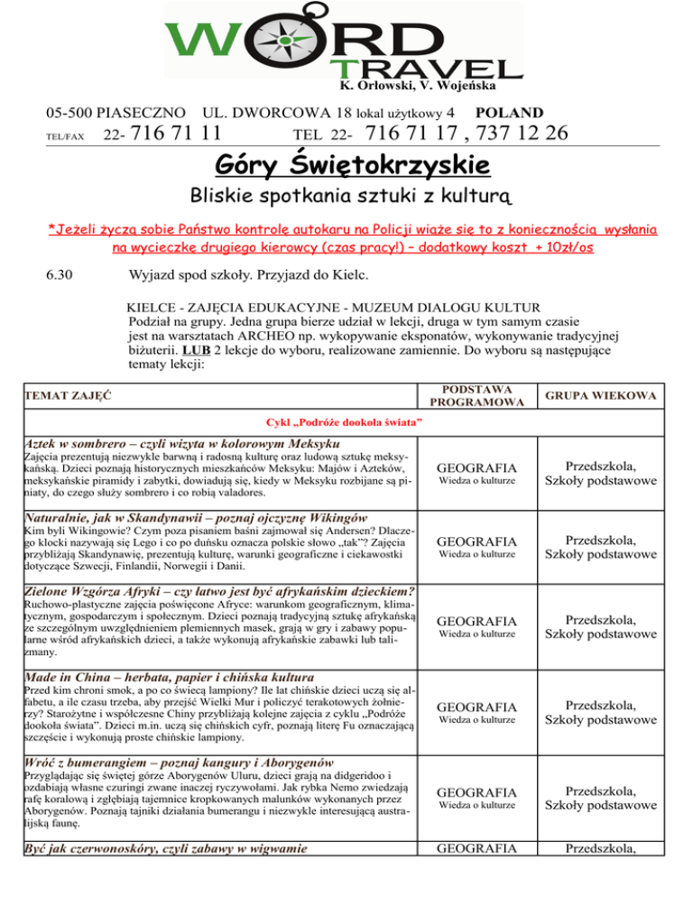 K. Orłowski, V. Wojeńska 05-500 PIASECZNO UL. DWORCOWA 18 lokal użytkowy 4 TEL/FAX 22- 716 71 11 TEL 22- 716 71 17 POLAND , 737 12 26 Góry Świętokrzyskie Bliskie spotkania sztuki z kulturą *Jeżeli życzą sobie Państwo kontrolę autokaru na Policji wiąże się to z koniecznością wysłania na wycieczkę drugiego kierowcy (czas pracy!) – dodatkowy koszt + 10zł/os 6.30 Wyjazd spod szkoły. Przyjazd do Kielc. KIELCE - ZAJĘCIA EDUKACYJNE - MUZEUM DIALOGU KULTUR Podział na grupy. Jedna grupa bierze udział w lekcji, druga w tym samym czasie jest na warsztatach ARCHEO np. wykopywanie eksponatów, wykonywanie tradycyjnej biżuterii. LUB 2 lekcje do wyboru, realizowane zamiennie. Do wyboru są następujące tematy lekcji: TEMAT ZAJĘĆ PODSTAWA PROGRAMOWA GRUPA WIEKOWA GEOGRAFIA Przedszkola, Szkoły podstawowe GEOGRAFIA Przedszkola, Szkoły podstawowe GEOGRAFIA Przedszkola, Szkoły podstawowe GEOGRAFIA Przedszkola, Szkoły podstawowe GEOGRAFIA Wiedza o kulturze Przedszkola, Szkoły podstawowe GEOGRAFIA Przedszkola, Cykl „Podróże dookoła świata” Aztek w sombrero – czyli wizyta w kolorowym Meksyku Zajęcia prezentują niezwykle barwną i radosną kulturę oraz ludową sztukę meksykańską. Dzieci poznają historycznych mieszkańców Meksyku: Majów i Azteków, meksykańskie piramidy i zabytki, dowiadują się, kiedy w Meksyku rozbijane są piniaty, do czego służy sombrero i co robią valadores. Wiedza o kulturze Naturalnie, jak w Skandynawii – poznaj ojczyznę Wikingów Kim byli Wikingowie? Czym poza pisaniem baśni zajmował się Andersen? Dlaczego klocki nazywają się Lego i co po duńsku oznacza polskie słowo „tak”? Zajęcia przybliżają Skandynawię, prezentują kulturę, warunki geograficzne i ciekawostki dotyczące Szwecji, Finlandii, Norwegii i Danii. Wiedza o kulturze Zielone Wzgórza Afryki – czy łatwo jest być afrykańskim dzieckiem? Ruchowo-plastyczne zajęcia poświęcone Afryce: warunkom geograficznym, klimatycznym, gospodarczym i społecznym. Dzieci poznają tradycyjną sztukę afrykańską ze szczególnym uwzględnieniem plemiennych masek, grają w gry i zabawy popularne wśród afrykańskich dzieci, a także wykonują afrykańskie zabawki lub talizmany. Wiedza o kulturze Made in China – herbata, papier i chińska kultura Przed kim chroni smok, a po co świecą lampiony? Ile lat chińskie dzieci uczą się alfabetu, a ile czasu trzeba, aby przejść Wielki Mur i policzyć terakotowych żołnierzy? Starożytne i współczesne Chiny przybliżają kolejne zajęcia z cyklu „Podróże dookoła świata”. Dzieci m.in. uczą się chińskich cyfr, poznają literę Fu oznaczającą szczęście i wykonują proste chińskie lampiony. Wiedza o kulturze Wróć z bumerangiem – poznaj kangury i Aborygenów Przyglądając się świętej górze Aborygenów Uluru, dzieci grają na didgeridoo i ozdabiają własne czuringi zwane inaczej ryczywołami. Jak rybka Nemo zwiedzają rafę koralową i zgłębiają tajemnice kropkowanych malunków wykonanych przez Aborygenów. Poznają tajniki działania bumerangu i niezwykle interesującą australijską faunę. Być jak czerwonoskóry, czyli zabawy w wigwamie Dlaczego Indianie to Indianie? Czy znajdziemy ich tylko w Ameryce Północnej, ubranych w pióropusze i śpiących w wigwamach? Zajęcia o Indianach mieszkających na całym świecie, o ich domach, zajęciach izwyczajach połączone są z warsztatami plastycznymi: dzieci wykonują godła własnych rodzin, czyli modele indiańskich totemów. Wiedza o kulturze Szkoły podstawowe GEOGRAFIA Przedszkola, Szkoły podstawowe W hinduskiej kropce – Indie oczami dziecka Z czerwoną kropką na czole wyruszamy w podróż po wielobarwnych, pachnących przyprawami Indiach. Dzieci poznają sztukę malowania dłoni henną, święto światła Divali i hinduskich bogów, boginie i zwyczaje. Bogatej części teoretycznej towarzyszą zajęcia plastyczne z wykonywania hinduskich ozdób codziennie rozsypywanych przed drzwiami domów, zwanych kolam lub rangoli. Wiedza o kulturze Czy w igloo jest zimno? – Eskimosi – naród północy Zajęcia przybliżają kulturę, zwyczaje i obyczaje jednego z najbardziej egzotycznych ludów świata – Inuitów, potocznie zwanych Eskimosami. Dzieci poznają eskimoską codzienność, specyfikę terenów, na jakich żyją Inuici, tajniki eskimoskich prac codziennych i zabaw dziecięcych. Potomkowie faraonów i zagadki Sfinksa Godzinna wyprawa w czasie i przestrzeni do krainy faraonów, sfinksów i piramid. Dzieci poznają najważniejsze odkrycia archeologów i specyfikę ich pracy – odkrywanie tajemnic cywilizacji ukrytych pod warstwami ziemi czy piasku. Dowiadują się do czego służyły piramidy i jak je budowano, poznają sarkofagi, mumie i święte zwierzęta starożytnego Egiptu. GEOGRAFIA Przedszkola, Wiedza o kulturze Szkoły podstawowe GEOGRAFIA Przedszkola, Szkoły podstawowe Wiedza o kulturze Cykl „Świąteczne wyprawy” Na tropie Świąt Bożego Narodzenia Dlaczego nie wszyscy ubierają choinki? Do czego podczas świąt Bożego Narodzenia przydają się Meksykanom rzodkiewki i dlaczego w Islandii grasuje wtedy drapieżny kot? Zajęcia o zwyczajach świątecznych z różnych stron świata przybliżają interesujące przykłady, wyjaśniają tajemnice Świętego Mikołaja, gwiazdy betlejemskiej, świątecznych prezentów i potraw. Podczas spotkania dzieci wykonują ozdoby świąteczne charakterystyczne dla różnych krajów świata. WIEDZA O KULTURZE Przedszkola, Szkoły podstawowe WIEDZA O KULTURZE Przedszkola, Szkoły podstawowe WIEDZA O KULTURZE Przedszkola, Szkoły podstawowe WIEDZA O KULTURZE Przedszkola, Szkoły podstawowe Geografia Świat na opak, czyli karnawały na świecie Zajęcia prezentują ciekawe i nieznane zwyczaje karnawałowe z różnych krajów świata, a szczególnie z Europy. Dzieci poznają mapę karnawałowych miejsc na świecie, oraz najciekawsze parady, bitwy na kwiaty i owoce, maskarady, pochody i cha