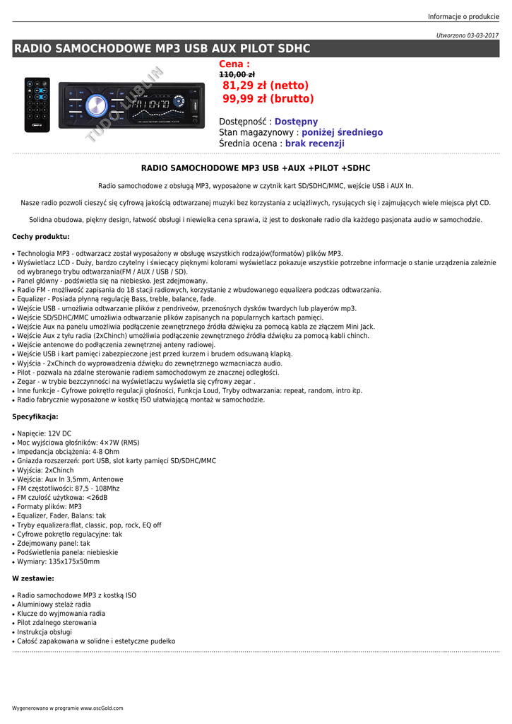 Informacje o produkcie Utworzono 03-03-2017 RADIO SAMOCHODOWE MP3 USB AUX PILOT SDHC Cena : 110,00 zł 81,29 zł (netto) 99,99 zł (brutto) Dostępność : Dostępny Stan magazynowy : poniżej średniego Średnia ocena : brak recenzji RADIO SAMOCHODOWE MP3 USB +AUX +PILOT +SDHC Radio samochodowe z obsługą MP3, wyposażone w czytnik kart SD/SDHC/MMC, wejście USB i AUX In. Nasze radio pozwoli cieszyć się cyfrową jakością odtwarzanej muzyki bez korzystania z uciążliwych, rysujących się i zajmujących wiele miejsca płyt CD. Solidna obudowa, piękny design, łatwość obsługi i niewielka cena sprawia, iż jest to doskonałe radio dla każdego pasjonata audio w samochodzie. Cechy produktu: ● ● ● ● ● ● ● ● ● ● ● ● ● ● ● ● Technologia MP3 - odtwarzacz został wyposażony w obsługę wszystkich rodzajów(formatów) plików MP3. Wyświetlacz LCD - Duży, bardzo czytelny i świecący pięknymi kolorami wyświetlacz pokazuje wszystkie potrzebne informacje o stanie urządzenia zależnie od wybranego trybu odtwarzania(FM / AUX / USB / SD). Panel główny - podświetla się na niebiesko. Jest zdejmowany. Radio FM - możliwość zapisania do 18 stacji radiowych, korzystanie z wbudowanego equalizera podczas odtwarzania. Equalizer - Posiada płynną regulację Bass, treble, balance, fade. Wejście USB - umożliwia odtwarzanie plików z pendriveów, przenośnych dysków twardych lub playerów mp3. Wejście SD/SDHC/MMC umożliwia odtwarzanie plików zapisanych na popularnych kartach pamięci. Wejście Aux na panelu umożliwia podłączenie zewnętrznego źródła dźwięku za pomocą kabla ze złączem Mini Jack. Wejście Aux z tyłu radia (2xChinch) umożliwia podłączenie zewnętrznego źródła dźwięku za pomocą kabli chinch. Wejście antenowe do podłączenia zewnętrznej anteny radiowej. Wejście USB i kart pamięci zabezpieczone jest przed kurzem i brudem odsuwaną klapką. Wyjścia - 2xChinch do wyprowadzenia dźwięku do zewnętrznego wzmacniacza audio. Pilot - pozwala na zdalne sterowanie radiem samochodowym ze znacznej odległości. Zegar - w trybie bezczynności na wyświetlaczu wyświetla się cyfrowy zegar . Inne funkcje - Cyfrowe pokrętło regulacji głośności, Funkcja Loud, Tryby odtwarzania: repeat, random, intro itp. Radio fabrycznie wyposażone w kostkę ISO ułatwiającą montaż w samochodzie. Specyfikacja: ● ● ● ● ● ● ● ● ● ● ● ● ● ● ● Napięcie: 12V DC Moc wyjściowa głośników: 4×7W (RMS) Impedancja obciążenia: 4-8 Ohm Gniazda rozszerzeń: port USB, slot karty pamięci SD/SDHC/MMC Wyjścia: 2xChinch Wejścia: Aux In 3,5mm, Antenowe FM częstotliwości: 87,5 - 108Mhz FM czułość użytkowa: <26dB Formaty plików: MP3 Equalizer, Fader, Balans: tak Tryby equalizera:flat, classic, pop, rock, EQ off Cyfrowe pokrętło regulacyjne: tak Zdejmowany panel: tak Podświetlenia panela: niebieskie Wymiary: 135x175x50mm W zestawie: ● ● ● ● ● ● Radio samochodowe MP3 z kostką ISO Aluminiowy stelaż radia Klucze do wyjmowania radia Pilot zdalnego sterowania Instrukcja obsługi Całość zapakowana w solidne i estetyczne pudełko Wygenerowano w programie www.oscGold.com