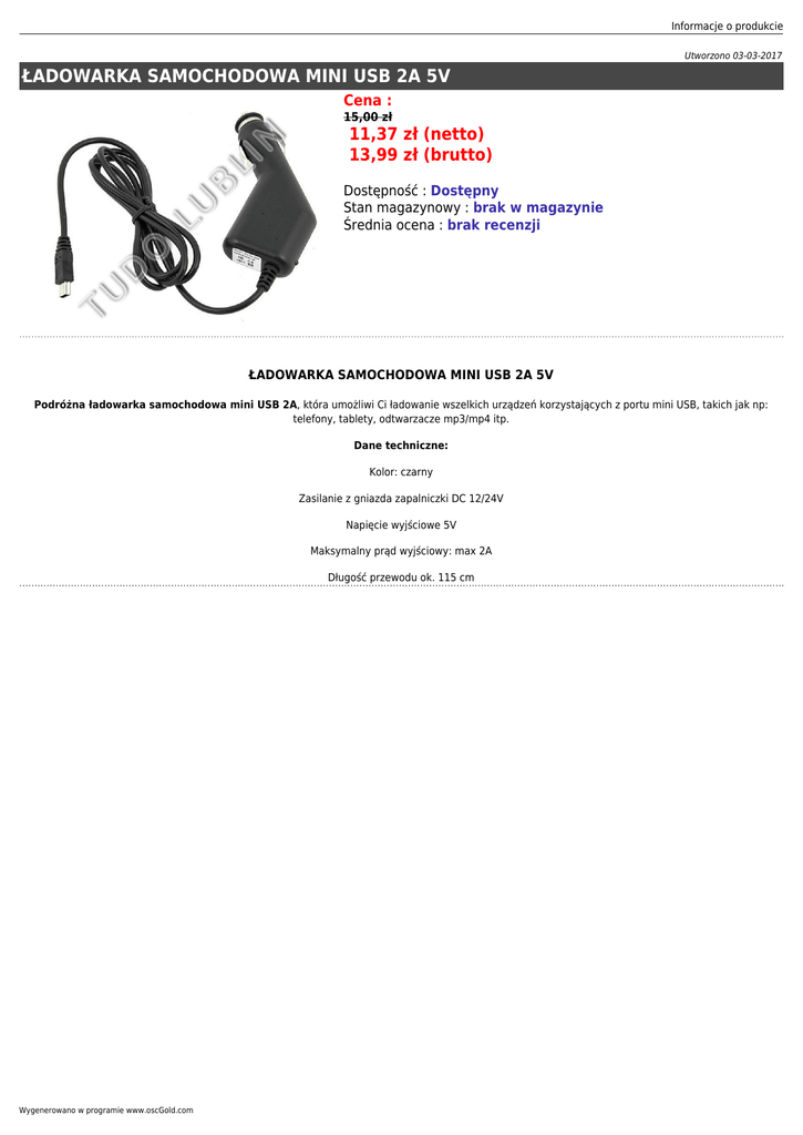 Informacje o produkcie Utworzono 03-03-2017 ŁADOWARKA SAMOCHODOWA MINI USB 2A 5V Cena : 15,00 zł 11,37 zł (netto) 13,99 zł (brutto) Dostępność : Dostępny Stan magazynowy : brak w magazynie Średnia ocena : brak recenzji ŁADOWARKA SAMOCHODOWA MINI USB 2A 5V Podróżna ładowarka samochodowa mini USB 2A, która umożliwi Ci ładowanie wszelkich urządzeń korzystających z portu mini USB, takich jak np: telefony, tablety, odtwarzacze mp3/mp4 itp. Dane techniczne: Kolor: czarny Zasilanie z gniazda zapalniczki DC 12/24V Napięcie wyjściowe 5V Maksymalny prąd wyjściowy: max 2A Długość przewodu ok. 115 cm Wygenerowano w programie www.oscGold.com